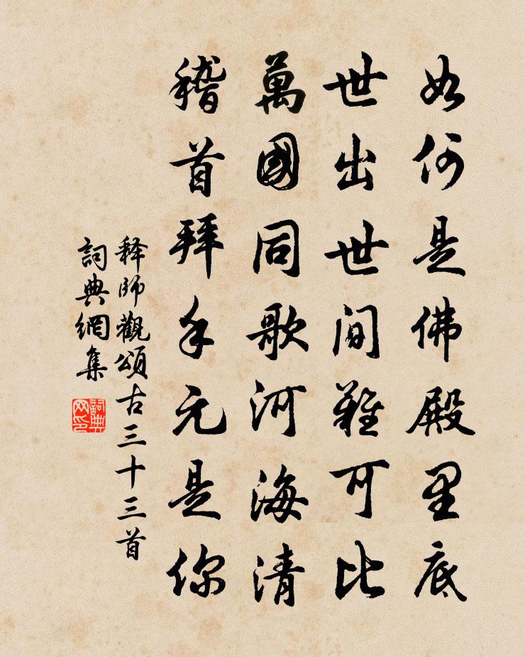 詩詞名句歷史字典書法欣賞書法字典國語詞典說文解字康熙字典古漢語字典標 題 作 者 詩 句 頌古三十三首作者:釋師觀 朝代:宋代頌古三十三首原文如何是佛殿里底,世出世間難可比。萬國同歌河海清,稽首拜手元是你。詩詞問答問:頌古三十三首的作者是誰?答:釋師觀問:頌古三十三首寫於哪個朝代?答:宋代釋師觀頌古三十三首書法欣賞頌古三十三首書法作品詩詞推薦和宋中道元夕二首梅堯臣〔宋代〕結山面當衢面九門面,華燈滿面國月半昏面。春泥踏盡遊人系。鳴蹕下天歌吹喧。深坊靜曲走車轅,爭前斗盛亡卑明月照高樓慢(中秋應制)万俟詠〔宋代〕平分素商。四垂翠幕,斜界銀潢。顥氣通建章。正煙澄練色,露洗水光。明映波融太液,影隨簾掛披香。樓觀壯麗偈頌八十五首釋妙倫〔宋代〕後園驢吃草,開口見心肝。潘閬倒騎處,有誰能解看。梅花黃庭堅〔宋代〕障羞半面依篁竹,隨意淡妝窺野塘。飄泊風塵少滋味,一枝猶傍故人香。對月答袁明府戴叔倫〔唐代〕山下孤城月上遲,相留一醉本無期。明年此夕游何處,縱有清光知對誰。送姜子謙丞於潛樓鑰〔宋代〕處則有超蓮,出則將喔松。眉宇無一塵,出處皆雍容。君看妙蓮華,本出汙泥中。兩松痛埽溉,下有簿書叢。汙潔揚州五詠 蜀井〈在大明寺。〉蘇轍〔宋代〕信腳東遊十二年,甘泉香稻憶歸田。行逢蜀井恍如夢,試煮山茶意自便。短綆不收容盥濯,紅泥仍許置清鮮。早知宋玉李覯〔宋代〕世間佳麗每專房,一顧多應萬事荒。夢裡若無真寶處,不妨頻為賦高唐。偈頌二十一首釋堅璧〔宋代〕空手把鋤頭,步行騎水牛。憑茲陪睿算,垂拱億千秋。偈頌二十九首釋雲〔宋代〕參禪人,莫造作。擬心即差,動念即錯。大乘小乘,錢貫井索。前三後三,佛手驢腳。開眼也著,合眼也著。擬向次韻費同叔解嘲魏了翁〔宋代〕低頭涸轍問波臣,沃以嘉言力萬鈞。逆耳倒言誠愛助,解嘲謝謗返離真。若微君告誰能及,幸不吾欺乃敢嗔。彼是浣溪沙(春情)蘇軾〔宋代〕桃李溪邊駐畫輪。鷓鴣聲里倒清尊。夕陽雖好近黃昏。香在衣裳妝在臂,水連芳草月連雲。幾時歸去不銷魂。歲晚陸游〔宋代〕歲晚霜風正怒號,荒村敗屋擁藜蒿。窮猶可勉聖賢事,老豈遽忘鉛槧勞。從宦雖如棋已決,治經竊比繭初繅。閉門香入雲亭為高子章賦杜去輕〔宋代〕山麓有庭存古意,不種凡花惟種桂。苔葑蘚剝迸鱗皺,雪勁霜頑聾蒼翠。栽培豈解一日成,愛惜至今尤不易。來人靈芝寺避暑因攜茶具汎湖共成十絕張鎡〔宋代〕臨津台殿似蓬萊,柳色荒涼鎖翠苔。萍港不知人事改,通船如望帝堯來。虞美人徐鈞〔宋代〕帳下悲歌勢已孤,美人忠憤慨捐軀。山河莫道全歸漢,墓草青青尚姓虞。雜詩吳大有〔宋代〕雁聲低度水村深,中有人敲月下門。滿屋秋風燈欲暗,江山千里故園心。哭?十五章辛棄疾〔宋代〕我痛須自排,汝痴故難忘。何時篆岡竹,重來看眉藏。寄雲夫史彌寧〔宋代〕黔國相逢地,蒼燈共夜篝。雲龍念東野,柏馬歡之罘。郵傳一分手,河山再見秋。交情如繾綣,不在寄書稠。金縷詞(壽南樓)佚名〔宋代〕欲上南樓壽。記當年、祥占玉燕,一陽生候。今數書雲猶七日,宮線未添刺繡。便草就、壽詞盈袖。合捧金荷稱鶴名句推薦咬定青山不放鬆,立根原在破岩中。鄭燮《竹石》 野老念牧童,倚杖候荊扉。王維《渭川田家》 女蘿發馨香,菟絲斷人腸。李白《古意》 嫁女擇佳婿,毋索重聘;娶媳求淑女,勿計厚奩。朱柏廬《朱子家訓·全文》 三更月。中庭恰照梨花雪。賀鑄《子夜歌·三更月》 早知潮有信,嫁與弄潮兒。李益《江南曲》 藥醫不死病,死病無藥醫。張南莊《何典·第三回》 美成在久,惡成不及改莊子《莊子·內篇·人間世》 一夜嬌啼緣底事,為嫌衣少縷金華。韋莊《與小女》 春風十里揚州路,卷上珠簾總不如。杜牧《贈別》