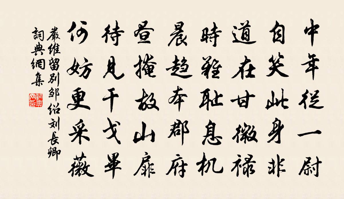 詩詞名句歷史字典書法欣賞書法字典國語詞典說文解字康熙字典古漢語字典標 題 作 者 詩 句 留別鄒紹劉長卿作者:嚴維 朝代:唐代留別鄒紹劉長卿原文中年從一尉,自笑此身非。道在甘微祿,時難恥息機。晨趨本郡府,晝掩故山扉。待見干戈畢,何妨更採薇。詩詞問答問:留別鄒紹劉長卿的作者是誰?答:嚴維問:留別鄒紹劉長卿寫於哪個朝代?答:唐代問:留別鄒紹劉長卿是什麼體裁?答:五律嚴維留別鄒紹劉長卿書法欣賞留別鄒紹劉長卿書法作品注釋全唐詩:卷263_16詩詞推薦寄題筠州錢有文明府新昌小道院范成大〔宋代〕忠厚平生心學,敏明隨處民功。江左幕中荒政,江西縣裡仁風。勿雲私淑小邑,可以匹休大邦。健筆誰能後賦,向驀山溪方千里〔宋代〕園林晴晝,花上黃峰尾。鶯語怯遊人,又還傍、綠楊深避。曲池斜徑,草色碧於藍,欄倦倚。簾半起。魂斷斜陽里題扇二十四首曹勛〔宋代〕霏微梅雨暗林塘,潤逼琴絲草木香。卷箔鉤簾無一事,篆煙終日伴清涼。聞里謠效古歌李紳〔唐代〕鄉里兒,桑麻鬱郁禾黍肥,冬有襤襦夏有絺。兄鋤弟耨妻在機,夜犬不吠開蓬扉。鄉里兒,醉還飽,濁醪初熟勸翁靜上人病以偈貽之釋子淳〔宋代〕火風地水合為身,猶若晴空一點塵。借問病從何處起,只應誰是病中人。送晦岩佛光法師歸天竺釋文禮〔宋代〕颺下天台故紙堆,為搜言外蔣山來。浙翁拶到無棲泊,謂實情忘撒手回。寓江州西城董嗣杲〔宋代〕奔忙夢落富池程,歸托蘧廬戀灌城。有石醉乘新月坐,無家吟逐亂雲行。衣遺母線寒針在,燒起公山晚陣鳴。鄰屋海棠蘇軾〔宋代〕東風裊裊泛崇光,香霧霏霏月轉廊。只恐夜深花睡去,更燒高燭照紅妝。七夕劉宰〔宋代〕天孫今夕渡銀潢,女伴紛紛乞巧忙。乞得巧多成底事,祗堪裝點嫁衣裳。和子華安國明空頌韓維〔宋代〕欲識真空理,須明動用間。色心全不礙,生死豈相關。卷箔涼風動,焚重晝景閒。回頭大行路,滿目是青山。偈頌一百二十三首釋崇岳〔宋代〕春風浩蕩,古佛榜樣。春水潺湲,忽著眼看。燈籠跳入露柱,佛殿走出三門,撞著個無面目漢。卻道眾口難調,須酬李光化見寄二首范仲淹〔宋代〕萬里承平堯舜風,使君尺素本空空。庭中無事吏歸早,野外有歌民意豐。石鼎鬥茶浮乳白,海螺行酒灩波紅。宴堂同成父弟訪王亢宗遇周欽止同過圓通看竹二首趙蕃〔宋代〕訪客因逢客,相攜看竹來。徑從林下轉,門向水邊開。高顧防驚鳥,徐行恐破苔。故嫌溪淺落,妨我泛舟回。歌江淹〔南北朝〕曲台歌未徙。黃壤哭已親。玉玦歸無色。羅衣會生塵。驕才雄力君何怨。徒念薄命之苦辛。中元日午楊萬里〔宋代〕雨余赤日尚如炊,亭午青陰不肯移。蜂過無花絕糧道,蟻行有水遏歸師。今朝道是中元節,天氣過於初伏時。小圃和君實端明洛陽看花邵雍〔宋代〕南園一色栽桃李,春到且圖花草開。多謝主人情意厚,天津客不等閒來。次韻張丞二首陳造〔宋代〕夫君腹笥盡奇謀,每叩談鋒聽不休。誦賦久嗟無此作,薦賢端合拔其尤。小遲榮路觀掀趠,聊為同寮蓋謬悠。政恐白公草堂楊時〔宋代〕爐峰裊裊曉煙輕,雲入屏幃一枕清。高興自應無世累,獨於妾馬未忘情。過野叟居馬戴〔唐代〕野人閒種樹,樹老野人前。居止白雲內,漁樵滄海邊。呼兒采山藥,放犢飲溪泉。自著養生論,無煩憂暮年。好事近楊冠卿〔宋代〕細雨落檐花,簾卷金泥紅濕。樓外遠山橫翠,染修眉愁碧。舊遊春夢了無痕,香塵暗瑤瑟。憑仗青鸞飛去,問新來名句推薦應難奈,故人天際,望徹淮山,相思無雁足。史達祖《八歸·秋江帶雨》 黑雲翻墨未遮山,白雨跳珠亂入船。蘇軾《六月二十七日望湖樓醉書》 莫道藍橋路遠,行雲中隔幽坊。吳文英《風入松·為友人放琴客賦》 愛民者強,不愛民者弱荀子《荀子·議兵》 以子之矛,陷子之盾韓非及後人《韓非子·難一》 鳳皇舟上楚女,妙舞,雷喧波上鼓孫光憲《河傳·柳拖金縷》 桃花塢裏桃花庵,桃花庵裏桃花仙。唐寅《桃花庵歌》 秋容淺淡映重門,七節攢成雪滿盆。曹雪芹《詠白海棠》 道不同,不相為謀。孔子弟子《論語·衛靈公篇》 白雪卻嫌春色晚,故穿庭樹作飛花。韓愈《春雪》