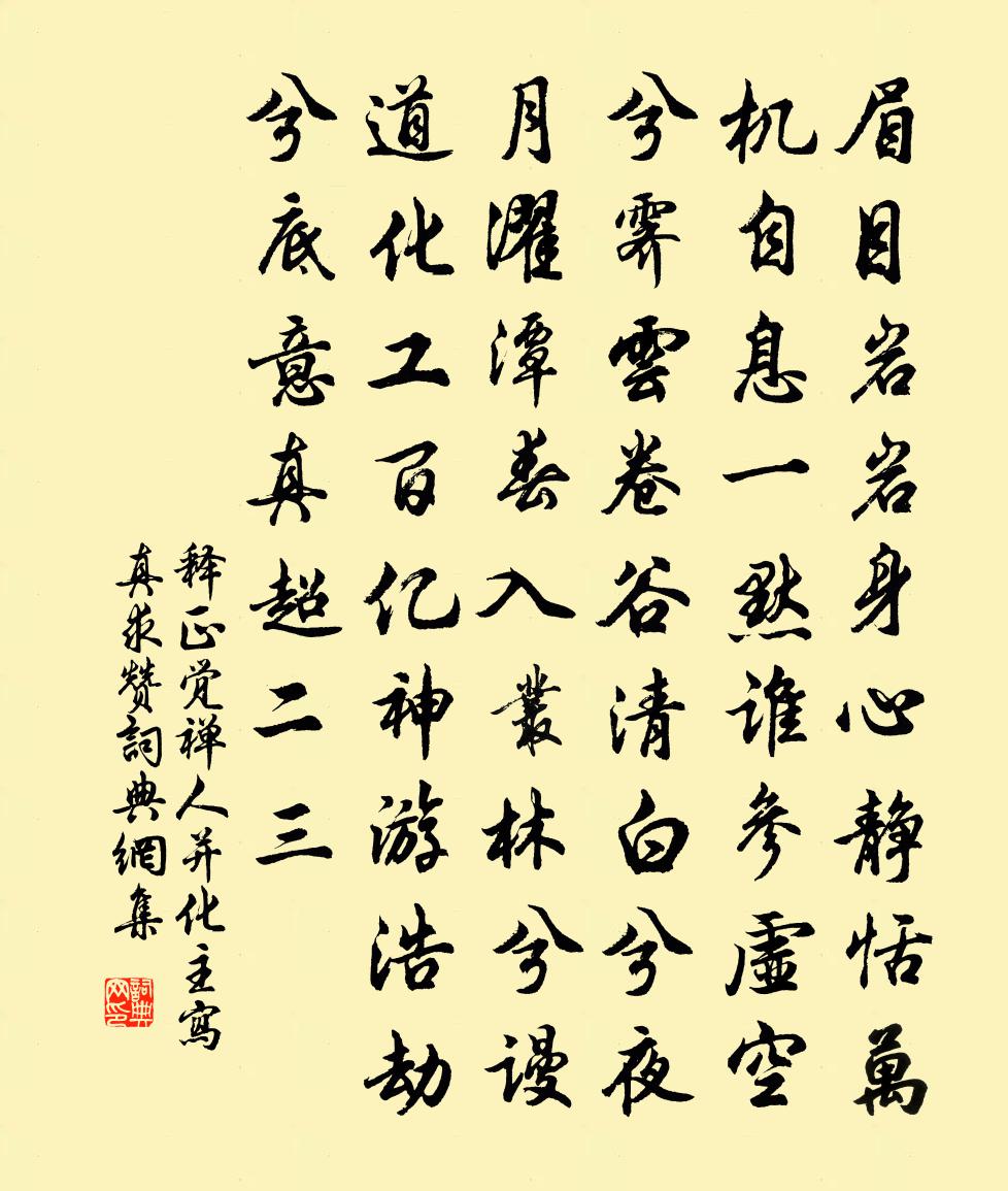 詩詞名句歷史字典書法欣賞書法字典國語詞典說文解字康熙字典古漢語字典標 題 作 者 詩 句 禪人並化主寫真求贊作者:釋正覺 朝代:宋代禪人並化主寫真求贊原文眉目岩岩,身心靜恬。萬機自息,一默誰參。虛空兮霽雲卷谷,清白兮夜月濯潭。春入叢林兮謾道化工百億,神遊浩劫兮底意真超二三。詩詞問答問:禪人並化主寫真求贊的作者是誰?答:釋正覺問:禪人並化主寫真求贊寫於哪個朝代?答:宋代釋正覺禪人並化主寫真求贊書法欣賞禪人並化主寫真求贊書法作品詩詞推薦相和歌辭。短歌行陸龜蒙〔唐代〕爪牙在身上,陷阱猶可制。爪牙在胸中,劍戟無所畏。人言畏猛虎,誰是撩頭弊?只見古來心,奸雄暗相噬。皇祐觀享明堂六首佚名〔宋代〕維聖享帝,維孝嚴親。筆軒世室,躬展精社。鏞鼓既設,籩豆既陳。至誠攸感,保格上神。即目(一作日)二首韓偓〔唐代〕萬古離懷憎物色,幾生愁緒溺風光。廢城沃土肥春草,野渡空船盪夕陽。倚道向人多脈脈,為情因酒易倀倀。宦途夜泊渭津楊凝〔唐代〕飄飄東去客,一宿渭城邊。遠處星垂岸,中流月滿船。涼歸夜深簟,秋入雨餘天。漸覺家山小,殘程尚幾年。句高似孫〔宋代〕有晉風姿如此蟹,個個能空無能解。夏日盩厔郊居寄姚少府李頻〔唐代〕古木有清陰,寒泉有下深。蟬從初伏噪,客向晚涼吟。白日欺玄鬢,滄江負素心。甚思中夜話,何路許相尋。南柯子/南歌子王從叔〔宋代〕碧樹留雲濕,青山似笠低。鷓鴣啼罷竹雞啼。不曉天天何意、要梅肥。昨日穿新葛,今朝御袷衣。思家懷抱政難為虞美人陳允平〔宋代〕彩雲別後房櫳悄。愁立西風曉。倚闌無語對黃花。惆悵玉郎應在、楚江涯。鈿箏空貯芳塵滿。寂寞朱弦斷。夜來一謝張子儀尚書寄天雄附子北果十包楊萬里〔宋代〕今古交情市道同,轉頭立地馬牛風。如何聽履星晨客,猶念孤舟蓑笠翁。饋藥雙奩芬玉雪,解包百果粲青紅。看渠偈頌四十一首釋慧暉〔宋代〕千山郁密處,涼飄洗夏熱。今日正當眼,利劍是鑌鐵。桂之樹行曹植〔魏晉〕桂之樹。桂之樹。桂生一何麗佳。揚朱華而翠葉。流芳布天涯。上有棲鸞。下有盤螭。桂之樹。得道之真人鹹來會句鄭內翰〔宋代〕西風吹得一枝生,昂首風前飛不去。水龍吟(林中書生日六月十九日)劉克莊〔宋代〕鬳齋不是凡人,海山仙聖知來處。清英融結,佩瑤台月,飲金莖露。翰墨流行,禁中有本,御前停箸。向弘文館裡春晚感事陸游〔宋代〕寒食梁州十萬家,鞦韆蹴鞠尚豪華。犢車轣轆歸城晚,爭碾平蕪入亂花。留別道州李使君圻戴叔倫〔唐代〕瀧路下丹徼,郵童揮畫橈。山回千騎隱,雲斷兩鄉遙。漁滬擁寒溜,畲田落遠燒。維舟更相憶,惆悵坐空宵。新暑追涼楊萬里〔宋代〕去歲沖炎橫大江,今年度暑臥筠陽。滿園無數好亭子,一夏不知何許涼。待等老夫親勘當,更招幽鳥細商量。朝慵金剛隨機無盡頌善現起請分第二釋印肅〔宋代〕如是真如是,無□不心地。觸目應菩提,名標法身義。寶月法喜堂蔡襄〔宋代〕少悟浮圖法,因傳法喜名。於人無厚薄,知已盡豪英。藥舍朝爐暖,棋窗夜燭明。性懷元自得,未用厭逢迎。丁亥生日蘇轍〔宋代〕少年即病肺,喘作鋸木聲。中年復病脾,暴下泉流傾。困苦始知道,處世百欲輕。收功在晚年,二疾忽已平。來年汴河直進船李敬方〔唐代〕汴水通淮利最多,生人為害亦相和。東南四十三州地,取盡脂膏是此河。名句推薦錦瑟華年誰與度?賀鑄《青玉案·凌波不過橫塘路》 平生多感激,忠義非外獎。李白《酬裴侍御對雨感時見贈》 聖人之行不同也,或遠或近,或去或不去,歸潔其身而已矣。孟子《孟子·萬章章句上·第七節》 學不精勤,不如不學 。令狐德棻《周書·列傳·卷二十五》 不效艾符趨習俗,但祈蒲酒話昇平。殷堯藩《端午日》 野臣潛隨擊壤老,日下鼓腹歌可封。鮑防《元日早朝行》 總是愁媒,欲訴誰消遣蘇軾《蝶戀花·蝶懶鶯慵春過半》 又疑瑤台鏡,飛在青雲端。李白《古朗月行》 辭柯霜葉,飛來就我題紅。朱庭玉《天淨沙·秋》 閒門向山路,深柳讀書堂。劉昚虛《闕題》