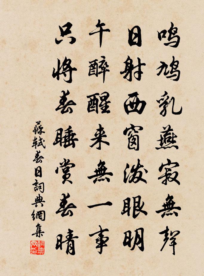 詩詞名句歷史字典書法欣賞書法字典國語詞典說文解字康熙字典古漢語字典標 題 作 者 詩 句 春日作者:蘇軾 朝代:宋代春日原文鳴鳩乳燕寂無聲,日射西窗潑眼明。午醉醒來無一事,只將春睡賞春晴。詩詞問答問:春日的作者是誰?答:蘇軾問:春日寫於哪個朝代?答:宋代問:蘇軾的名句有哪些?答:蘇軾名句大全蘇軾春日書法欣賞春日書法作品注釋蘇軾詩集 卷十五詩詞推薦眼兒媚趙長卿〔宋代〕槐陰密處囀黃鸝。午日正長時。一番過雨,綠荷池面,冷浸琉璃。紅塵不到華堂里,纖楚對蛾眉。笑偎人道,新詞送筇杖與劉湛然道士王禹偁〔宋代〕有客遺竹杖,九節共一枝。鶴脰老更長,龍骨乾且奇。我問何所來,來從西南夷。因思漢武帝,求此民力疲。明明約呂徐二友游淨慈二首陳造〔宋代〕芒鞋明日踏晴沙,肯學渠儂走狹斜。天井巷前休倦足,暗門城外把煎茶。暫同佛屋僧庖飯,徐訪姚黃魏紫花。要及龍興道中晃沖之〔宋代〕澗道垂黃花,山城擁紅葉。人爭小舟渡,馬就平水涉。石淙李嶠〔唐代〕羽蓋龍旗下絕冥,蘭除薜幄坐雲扃。鳥和百籟疑調管,花發千岩似畫屏。金灶浮煙朝漠漠,石床寒水夜泠泠。自然浣溪沙·半夜銀山上積蘇軾〔宋代〕半夜銀山上積蘇。朝來九陌帶隨車。濤江煙渚一時無。空腹有詩衣有結,濕薪如桂米如珠。凍吟誰伴拈髭鬚。寄蔣山痴絕和尚釋心月〔宋代〕沒弦琴三弄五弄,無孔笛一聲兩聲。明月浮空天似水,長安歸夢恰三更。和謝倅見贈生日二首陳傅良〔宋代〕朝天冠佩幾千員,熟數東州未乏賢。若論中原舊文物,蒲輪應合聘高年。送張子高歸延平謝枋得〔宋代〕亂世讀書少,前人教子難。青燈嘗合席,紅葉趲歸鞍。梅自知春近,松應耐歲寒。樓高新月好,後夜與誰看。孫公素中允將往相台謁韓魏公貽詩為別因以酬強至〔宋代〕紫宸班退聽宣麻,鎮鄴司徒換將牙。到日玳筵公定喜,當年珠履客尤嘉。賦驚合座爭觀禰,樂重當時合姓車。入夏仁宗皇帝輓詞七首蔡襄〔宋代〕萬世威神在,多方惠澤隆。密音通虜壤,行哭亦兒童。畫翣離丹闕,幽堂對紫嵩。孤城空雨泣,白首抱遺弓。偈頌一百四十一首釋師範〔宋代〕聲前句,量外機。明歷歷,峭巍巍。舉者既少,見者亦稀。抖擻多年穿破衲,襤毿一半逐雲飛。江州陳制送酒項安世〔宋代〕誰渭淵明遠,我住栗里源。亦有好事人,送酒黃花前。舉酒對南湖,見之心悠然。相逢各無心,後世自稱賢。寄令狐相公(一作赴長江道中)賈島〔唐代〕策杖馳山驛,逢人問梓州。長江那可到,行客替生愁。緣識宋太宗〔宋代〕善事多兮惡事少,君子能言兮心自了。杳杳冥冥幻之中,舉目因緣還大小。勿縱貪,勿縱巧,知有寒人飢是飽。良句趙善湘〔宋代〕正是澄清秋雨夜,空傳玉蕊發春晴。寄孔中丞石介〔宋代〕諫署崢嶸有舊名,侯藩偃息政方成。張綱昨日彈梁冀,文帝今朝召賈生。古節未慚台栢直,仙風應對簡霜清。人言偈傾一百三十三首釋法薰〔宋代〕東弗於逮,西瞿耶尼。清清之水,游魚自迷。偈頌七十八首釋正覺〔宋代〕青山白雲父,白雲青山兒。白雲終日倚,青山總不知。寄漢陽故人張籍〔唐代〕知君漢陽住,煙樹遠重重。歸使雨中發,寄書燈下封。同時買江塢,今日別雲松。欲問新移處,青蘿最北峰。名句推薦故人宿茅宇,夕鳥栖楊園。李白《之廣陵宿常二南郭幽居》 君子之於子,愛之而勿面,使之而勿視,道之以道而勿強。荀子《荀子·大略》 白鳥明邊帆影直。隔江聞夜笛。周密《聞鵲喜·吳山觀濤》 山明水淨夜來霜,數樹深紅出淺黃。劉禹錫《秋詞二首》 山路元無雨,空翠濕人衣。王維《山中》 坐蔭從容煩暑退,清心恍惚微香觸。陸容《滿江紅·詠竹》 無為在歧路,兒女共沾巾。王勃《送杜少府之任蜀州 / 送杜少府之任蜀川》 千呼萬喚始出來,猶抱琵琶半遮面。白居易《琵琶行 / 琵琶引》 湖闊兼雲霧,樓孤屬晚晴。杜甫《陪裴使君登岳陽樓》 敕勒川,陰山下。天似穹廬,籠蓋四野佚名《敕勒歌》