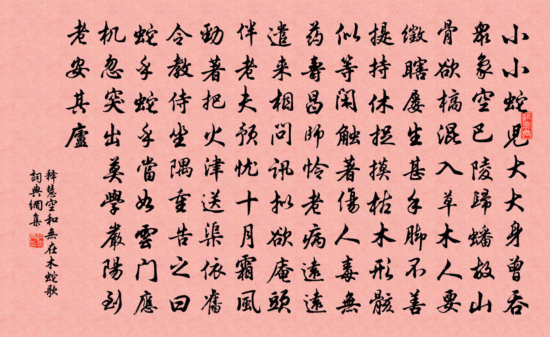 詩詞名句歷史字典書法欣賞書法字典國語詞典說文解字康熙字典古漢語字典標 題 作 者 詩 句 和無在木蛇歌作者:釋慧空 朝代:宋代和無在木蛇歌原文小小蛇兒大大身,曾吞眾象空巴陵。歸蟠故山骨欲槁,混入草木人要徵。瞎屢生,甚手腳,不善提持休捉摸。枯木形骸似等閒,觸著傷人毒無藥。壽昌師,憐老病,遠遠遣來相問訊。擬欲庵頭伴老夫,預憂十月霜風勁。著把火,津送渠,依舊令教侍坐隅。重告之曰,蛇乎蛇乎,當如雲門應機忽突出,莫學嚴陽到老安其廬。詩詞問答問:和無在木蛇歌的作者是誰?答:釋慧空問:和無在木蛇歌寫於哪個朝代?答:宋代釋慧空和無在木蛇歌書法欣賞和無在木蛇歌書法作品詩詞推薦古詩十九首·西北有高樓佚名〔兩漢〕西北有高樓,上與浮雲齊。交疏結綺窗,阿閣三重階。上有弦歌聲,音響一何悲。誰能為此曲?無乃杞梁妻!清商梅市道中張良臣〔宋代〕連雨疏蓬不耐關,脩眉如失更晴慳。越王故國無人問,艇子穿花自往還。思山居一十首思登家山林嶺李德裕〔唐代〕自知無世用,只是愛山游。舊有嵇康懶,今慚趙武偷。登巒未覺疾,泛水便忘憂。最惜殘筋力,捫蘿遍一丘。洞仙歌·荷花劉光祖〔宋代〕晚風收暑,小池塘荷淨。獨倚胡床酒初醒。起徘徊、時有香氣吹來,雲藻亂,葉底游魚動影。空擎承露蓋,不見冰秦淮晚眺張翥〔元代〕赤欄橋下莫潮空,遠火疏舂暗靄中。星月半天分落照,斷雲千里附歸風。嚴城鼓角秋聲早,故國山川王氣終。莫訝再用才子富文華校讎天祿閣韻贈周教授陳造〔宋代〕假板未通班,此氣渠容索。周友萬卷腹,小卻石渠閣。培學虎出翼,息妄眼蛻膜。何當去為霜,萬壑正枯涸。游靈泉山寺石介〔宋代〕寺遠離朝市,同游並結軨。堦垠盤石磴,殿影落青冥。地勝松筠眾,山名草藥靈。洞門深數里,檜樹壽千齡。疑有呈寇公二首蒨桃〔宋代〕風勁衣單手屢呵,幽窗軋軋度寒梭。臘天日短不盈尺,何似燕姬一曲歌。郊廟歌辭。梁太廟樂舞辭。飲福佚名〔唐代〕戛玉摐金永頌聲,檿絲孤竹和且清。靈歆醉止犧象盈,自天降福千萬齡。和人賦琴高魚吳潛〔宋代〕仙人藥苗化為魚,身雖纖細味豐腴。土人涉溪如採荇,以布為網猶恐疏。不比吳王耽嗜膾,松江千古留腥滓。好似舜兄南山為僧後歸東林釋紹曇〔宋代〕新生白額眼光搖,肯向南山戀舊巢。背蹭西風行一轉,人驚不過虎溪橋。月夜看桂嚴中和〔宋代〕玉杵聲中舞素娥,西風葉葉自婆娑。一天清氣無人管,惟有山樓樹影多。臨刑詩鄭頲〔唐代〕幻生還幻滅,大幻莫過身。安心自有處,求人無有人。君莫惡行晁說之〔宋代〕今年蠶母連萬箔,屋邊桑葉渾不著。彷徨何計救戢戢,出棄陌頭空涕泣。前日初眠不敢語,今日賤之如糞土。不容高郵書事晁說之〔宋代〕飄然去國到他鄉,晝晷難移夜漏長。自恨旅懷多偪仄,誰教春夢遠顛狂。舒虹盪月明珠過,積雪迷雲小稻香。雙絕思還人四方四首釋文珦〔宋代〕娟娟秋月照空床,行人東征未還鄉。思如轆轤不斷絕,千轉萬轉縈愁腸。嘲傴僂人佚名〔宋代〕拄杖欲似乃,播笏還似及。逆風盪雨行,面乾頂額濕。著衣床上坐,肚緩脊皮急。城門爾許高,故自匍匐入。贈劉景擢第劉禹錫〔唐代〕湘中才子是劉郎,望在長沙住桂陽。昨日鴻都新上第,五陵年少讓清光。游山陽十首陳造〔宋代〕玳筵當日小紅裳,珠壓雙丫十歲強。回首方知但青子,胡琴聲里怨茶商。早泊江城三首董嗣杲〔宋代〕歸棲藉知舊,相視絕秦越。無言嘆生浮,塵鞅磨歲月。數時苦馳鶩,百計學休歇。芒鞋起廬峰,掀泥挑筍蕨。名句推薦非學無以廣才,非志無以成學。諸葛亮《誡子書》 但知江湖者,都是薄命人。佚名《增廣賢文·下集》 見未真,勿輕言。知未的,勿輕傳。李毓秀《弟子規·信》 兵者兇器,將者危任,是以器剛則缺,任重則危。諸葛亮《將苑·卷一·將志》 拼將一死酬知己,致令千秋仰義名。羅貫中《三國演義·第五十回》 戍鼓斷人行,邊秋一雁聲。杜甫《月夜憶舍弟》 金玉其外,敗絮其中劉基《賣柑者言》 有意栽花花不發,無心插柳柳成蔭。佚名《增廣賢文·上集》 成敗相因,理不常泰李大師、李延壽《南史·本紀·卷一》 九月九日眺山川,歸心歸望積風煙。盧照鄰《九月九日玄武山旅眺》