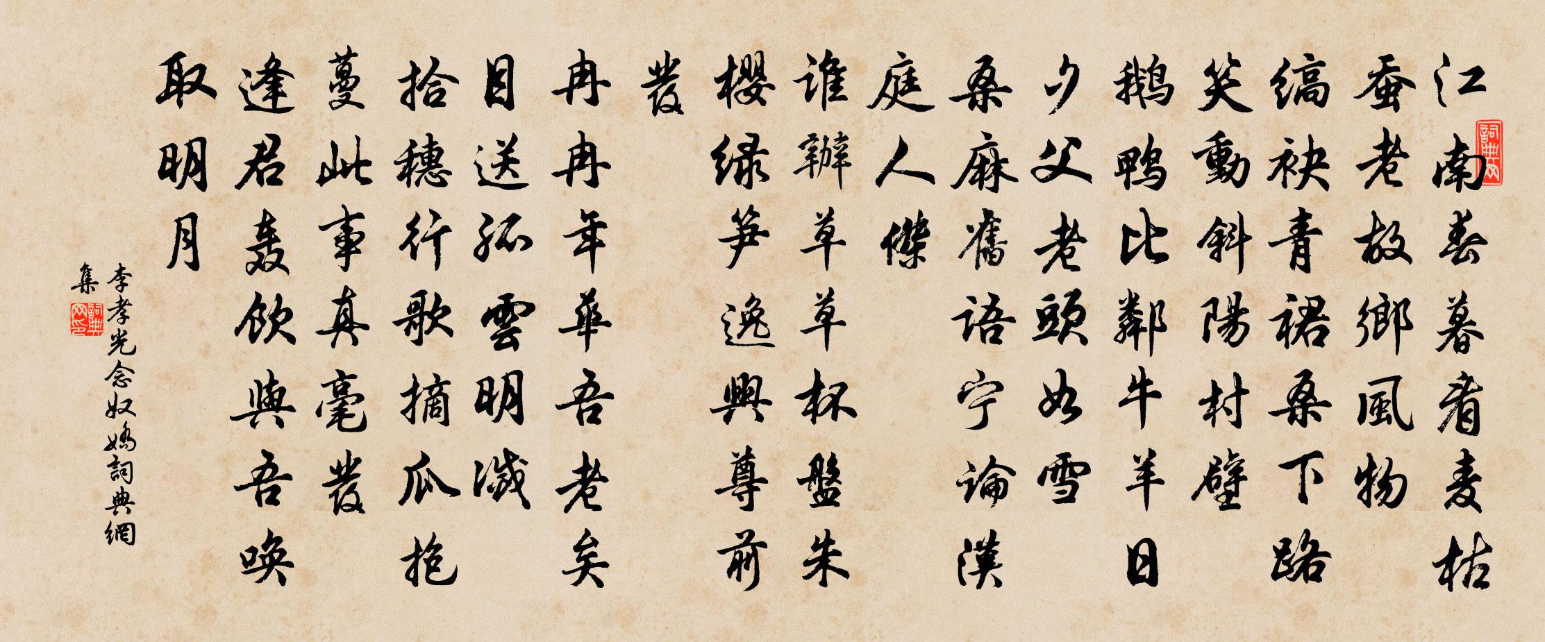 詩詞名句歷史字典書法欣賞書法字典國語詞典說文解字康熙字典古漢語字典標 題 作 者 詩 句 念奴嬌作者:李孝光 朝代:元代念奴嬌原文江南春暮,看麥枯蠶老,故鄉風物。縞袂青裙桑下路,笑動斜陽村壁。鵝鴨比鄰,牛羊日夕,父老頭如雪。桑麻舊語,寧論漢庭人傑。誰辦草草杯盤,朱櫻綠筍,逸興尊前發。冉冉年華吾老矣,目送孤雲明滅。拾穗行歌,摘瓜抱蔓,此事真毫髮。逢君轟飲,與吾喚取明月。詩詞問答問:念奴嬌的作者是誰?答:李孝光問:念奴嬌寫於哪個朝代?答:元代問:念奴嬌是什麼體裁?答:詞李孝光念奴嬌書法欣賞念奴嬌書法作品詩詞推薦頌古十五首釋慧遠〔宋代〕山花如錦水如藍,親見文殊接話談。十字街頭輕一拶,前三三對後三三。香潭八首許月卿〔宋代〕平生不作明河篇,一笑童心尚隱然。後日視今哀後日,同年而語不同年。瑩清川澤玻璃地,濃淡煙雲水墨天。盡向掬水錫壺陳宓〔宋代〕昔在延平郡,泉聲日夜聞。六年歸故里,一縷憶晴雲。儋石終宵足,瓶罍竟日分。山中有飛瀑,未必愜朝曛。垂虹亭觀打魚斫鱠四首楊萬里〔宋代〕橋柱疏疏四寂然,亭前突出八魚船。一聲磔磔鳴榔起,驚出銀刀躍玉泉。呈曾蒲澗提刑黃庚〔宋代〕詩自茶山後,如公世所稀。特來參活字,應肯授玄機。寒澗孤松老,秋雲獨鶴飛。台山千萬丈。望望未能歸。秋山圖王冕〔元代〕前年放船九江口,秋風獵獵吹蒲柳。買魚沽酒待月明,不知江上青山走。三更吹笛欲喚人,□□白露依衣巾。故鄉浣溪沙蔡伸〔宋代〕苹末風輕入夜涼。飛橋畫閣跨方塘。月移花影上迴廊。粲枕隨釵雲鬢亂,紅綿撲粉玉肌香。起來攜手看鴛鴦。頌證道歌證道歌釋印肅〔宋代〕取不得,捨不得,自是眼盲心裹黑。居大洋海口焦乾,兩手問人覓水吃。念奴嬌 宏光鄭燮〔清代〕宏光建國,是金蓮玉樹,後來狂客。草木山川何限痛,只解征歌選色。燕子銜箋,春燈說謎,夜短嫌天窄。海雲分【黃鐘】侍香金童關漢卿〔元代〕春閨院宇,柳絮飄香雪。簾幕輕寒雨乍歇,東風落花 * 蝶。芍藥初開,海棠才謝。【麼】柔腸脈脈,新愁千萬疊次韻徐丞用韻見示趙蕃〔宋代〕往將短木飾青黃,負此枯林歲久霜。窮為多言慕柔舌,病因止酒制剛腸。交遊大抵要晚節,談笑可須空累觴。淨掃頌古四首釋梵琮〔宋代〕德山托缽話,低頭得人怕。三家村里人,醉後胡廝罵。秀野亭范端臣〔宋代〕不敢尋詩怕雨催,須知挈榼為春來。天公未放陽烏出,坐客何妨笑臉開。寒食花光猶照眼,亂山雲氣欲侵罍。黃昏冬日放言二十一首張耒〔宋代〕愈老愈嗜酒,益醉益自然。兩人同墜車,醉者乃得全。我不但醉酒,天和醉心源。當其醉甚時,更類痴與頑。依韻和劉比部留別梅堯臣〔宋代〕春雲已泊簾,濃淡半晴天。沙草微抽綠,林枝遠帶煙。況茲逢晚景,那更送歸船。苦酒聊為酌,無勞辨聖賢。哭日老二首劉克莊〔宋代〕初聞滅度指三彈,俄報荼毗鼻一酸。始悟杖頭挑布袋,不如龕里坐 * 。故交相與歸函骨,弟子誰來會涅槃。猶喜酬李二十侍郎白居易〔唐代〕筍老蘭長花漸稀,衰翁相對惜芳菲。殘鶯著雨慵休囀,落絮無風凝不飛。行掇木芽供野食,坐牽蘿蔓掛朝衣。十年一萼紅·登蓬萊閣有感周密〔宋代〕步深幽。正雲黃天淡,雪意未全休。鑒曲寒沙,茂林菸草,俯仰千古悠悠。歲華晚、漂零漸遠,誰念我、同載五湖頌古三十一首釋原妙〔宋代〕三十年來在夢中,生涯喪盡絕行蹤。自慚一見桃花後,依舊漫天鼓黑風。燭下次海棠洪咨夔〔宋代〕紅深翠淺浣花春,投老相逢過所欣。有許精神宜半睡,無從醖藉莫全醺。涵渟芳露須饒月,籠護晴暉不礙雲。成就名句推薦知其雄,守其雌,為天下谿。老子《老子·道經·第二十八章》 天山雪雲常不開,千峰萬嶺雪崔嵬。岑參《天山雪歌送蕭治歸京》 命將征西極,橫行陰山側。李白《塞上曲》 崑山玉碎鳳凰叫,芙蓉泣露香蘭笑。李賀《李憑箜篌引》 惟有綠荷紅菡萏,卷舒開合任天真。李商隱《贈荷花》 分不盡,半涼天。可憐閒剩此嬋娟。吳文英《思佳客·閏中秋》 安得五彩虹,駕天作長橋。李白《焦山望寥山》 好言難得,惡語易施。佚名《增廣賢文·上集》 獨立雕欄,誰憐枉度華年。王沂孫《高陽台·殘萼梅酸》 先到為君,後到為臣。佚名《增廣賢文·上集》