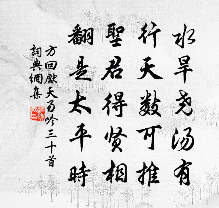 詩詞名句歷史字典書法欣賞書法字典國語詞典說文解字康熙字典古漢語字典標 題 作 者 詩 句 先天易吟三十首作者:方回 朝代:宋代先天易吟三十首原文水旱堯湯有,行天數可推。聖君得賢相,翻是太平時。詩詞問答問:先天易吟三十首的作者是誰?答:方回問:先天易吟三十首寫於哪個朝代?答:宋代方回先天易吟三十首書法欣賞先天易吟三十首書法作品詩詞推薦題報恩寺惟照上人房皎然〔唐代〕上界雨色乾,涼宮日遲遲。水文披菡萏,山翠動罘罳。中有清真子,愔愔步閒墀。手縈頗黎縷,願證黃金姿。旋草奉和詠弓楊師道〔唐代〕霜重麟膠勁,風高月影圓。烏飛隨帝輦,雁落逐鳴弦。曉思王建〔唐代〕曉氣生綠水,春條露霏霏。林間棲鳥散,遠念征人起。幽花宿含彩,早蝶寒弄翅。君行非晨風,詎能從門至。浣溪沙蘇軾〔宋代〕覆塊青青麥未蘇。江南雲葉暗隨車。臨皋煙景世間無。雨腳半收檐斷線,雪林初下瓦疏珠。歸來冰顆亂黏須。句楊億〔宋代〕眼中人是面前人。關榆漸落邊鴻過,誰勸劉郎酒十分。長安春遊楊巨源〔唐代〕鳳城春報曲江頭,上客年年是勝游。日暖雲山當廣陌,天清絲管在高樓。蘢蔥樹色分仙閣,縹緲花香泛御溝。桂壁至潭州聞猿李紳〔唐代〕昔陪天上三清客,今作端州萬里人。湘浦更聞猿夜嘯,斷腸無淚可沾巾。用字謎王安石〔宋代〕一月又一月,兩月共半邊。上有可耕之田,下有長流之川。一家有六口,兩口不團圓。村居吳可〔宋代〕鑿井耕田僅萬家,農夫農婦畢絲麻。夜來得雨陂塘足,村北村南罷踏車。面壁贊釋智遇〔宋代〕嵌枯石老,黶唐衣荒。死水開釣,陸地乘航。當初好采見梁王。書懷寄韋山人寇準〔宋代〕萬事不關慮,孤吟役此生。風騷中旨趣,山水裡心情。眾木凋寒色,空江噴暮聲。終期謁君子,同繞綠苔行。與人游會潤州金山寺潘閬〔宋代〕浮生難會此,此寺絕塵埃。容易莫言去,等閒爭得來。江聲寒若吼,山色翠如堆。自是忘機者,憑闌不忍回。心月照雲溪 本名驀山溪 山居述懷王丹桂〔元代〕既拋面火院,塵面事難拘檢面。物外樂逍遙,總疏遠、征徭賦斂。粗衣淡飯,據分且隨緣,青峰畔,白雲中,獨把詠史下朱文公陳普〔宋代〕九里寒威閉六陰,一川風月伴瑤琴。鼓樓岩下人如玉,說與漁郎仔細尋。浣溪沙(三衢陳簽上作)侯置〔宋代〕客里匆匆夢帝州。故人相遇一杯休。疏梅些子最清幽。雙綰香螺春意淺,緩歌金縷楚雲留。不知妝鏡若為儔。宋弘徐鈞〔宋代〕 * 繁聲已力排,義存夫婦豈容乖。君王莫作圖婚想,未問懸知事不諧。長洲苑(吳黃武中,此地校獵)孫逖〔唐代〕吳王初鼎峙,羽獵騁雄才。輦道閶門出,軍容茂苑來。山從列嶂轉,江自繞林回。劍騎緣汀入,旌門隔嶼開。合離宮詞張公庠〔宋代〕長樂疏鍾常送月,靈和垂柳只從風。不知天上人難老,顏色年年不減紅。秋江引方岳〔宋代〕水天一色磨古銅,落日欲沒蘆花風。雙飛野鴨忽驚起,漁歌漸遠秋江空。煙波渺渺無終極,中有江南未歸客。短篷三部樂(榴花)楊 * 〔宋代〕濃綠叢中,露半坼芳苞,自然奇絕。水亭風檻,正是蕤賓之月。固知道、春色無多,但絳英數點,照眼先發。為君名句推薦凡事之本,必先治身呂不韋《呂氏春秋·紀·季春紀》 人老去西風白髮,蝶愁來明日黃花。張可久《折桂令·九日》 樓上黃昏欲望休,玉梯橫絕月中鉤李商隱《代贈二首》 雪聲偏傍竹,寒夢不離家。戎昱《桂州臘夜》 盡叫得鵑聲碎,卻教人空斷腸。阿魯威《湘妃怨·夜來雨橫與風狂》 治則衍及百姓,亂則不足及王公。荀子《荀子·君道》 惆悵東欄一株雪,人生看得幾清明。蘇軾《東欄梨花》 醲肥辛甘非真味,真味只是淡無味洪應明《菜根譚·概論》 水激則悍,矢激則遠劉向《說苑·談叢》 泛樓船兮濟汾河,橫中流兮揚素波。劉徹《秋風辭》