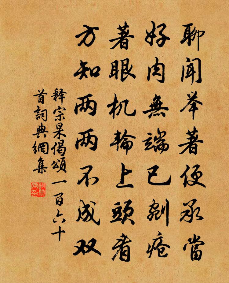 詩詞名句歷史字典書法欣賞書法字典國語詞典說文解字康熙字典古漢語字典標 題 作 者 詩 句 偈頌一百六十首作者:釋宗杲 朝代:宋代偈頌一百六十首原文聊聞舉著便承當,好肉無端已剜瘡。著眼機輪上頭看,方知兩兩不成雙。詩詞問答問:偈頌一百六十首的作者是誰?答:釋宗杲問:偈頌一百六十首寫於哪個朝代?答:宋代釋宗杲偈頌一百六十首書法欣賞偈頌一百六十首書法作品詩詞推薦邯鄲歌蕭衍〔南北朝〕回顧灞陵上。北指邯鄲道。短衣妾不傷。南山為君老。枕上聞雪呈趙郭二公張嵲〔宋代〕上瑞來寧玉座憂,夜聲先到竹窗幽。飢腸已作來年飽,病眼聊須臘月收。高士清貧無敝履,故人狂興阻扁舟。卻思雜曲歌辭。長相思白居易〔唐代〕九月西風興,月冷霜華凝。思君秋夜長,一夜魂九升。二月東風來,草坼花心開。思君春日遲,一日腸九回。妾住投老陸游〔宋代〕投老百無成,山林送此生。薄才元易盡,古道竟難行。陋巷牛羊跡,衡門鳥雀聲。新年幸差健,作意事春耕。粉蝶何應龍〔宋代〕宿粉棲香樂最深,暫依芳草避春禽。晚來風起還無定,舞入梨花何處尋。題金華徐伯光義聚規約徐元傑〔宋代〕每慨人無善後圖,蕩然家檢亦何疎。眼前漫不知由己,身後誰能管得渠。喜見雙溪今軌範,更綿一脈古詩書。了知天台梵才師長吉在都數以詩筆見授因答以轉句宋祁〔宋代〕何年擲缽來京轂,抱蓬成畦紫蘭馥。王公撇席爭逢迎,不意當今有平叔。沁園春(己未翠山勸農)吳潛〔宋代〕二十年前,君王東顧,詔牧此州。念昔時豪傑,猶難辟闔,如金老大,卻更遲留。四載相望,三春又半,邂逅劭農和聖俞游梁王吹台有感韓維〔宋代〕高台壓萬井,四絕埃與氛。上有金仟廬,凌虛結楣芬。嘗聞登其巔,直視太行雲。蘭觀良跂予,夙駕慚後君。況當呈任邕州昭子言趙蕃〔宋代〕清江江上賢大夫,我所識者向楊胡。盤園近說在城郭,使君政剖邕州符。笑談雖阻親顏色,新詩往往流傳得。豈知威道人歸鄉楊億〔宋代〕聞法靈山真佛子,馳名南國本詩流。二林曾有香燈約,一缽應為輦轂游。塵土化衣慵駐錫,江湖收潦憶歸舟。何年茅夫人輓詞樓鑰〔宋代〕清心玉映許誰同,更有飄飄林下風。政爾高情協宗老,故宜嘉遯樂龐公。遠謀蚤識身為重,晚境還知性亦空。已擬陪諸友野步李處權〔宋代〕北客身將老,東風又歲華。山情添氣象,水暖莫津涯。貧覺他鄉苦,慵嫌去路斜。昇平吾會見,時事不須嗟。題盱胎軍東南第一山二首楊萬里〔宋代〕第一山頭第一亭,聞名未到負平生。不因王事略小出,那得高人同此行。萬里中原青未了,半篙淮水碧無情。登臨宮詞王珪〔唐代〕內庫新函進御茶,龍團春足建溪芽。黃封各各題名姓,賜入東西兩府家。明發石山楊萬里〔宋代〕明發愁仍集,寒雲又作屯。懸知今定雨,正坐夜來暄。便恐禾生耳,寧論容斷魂。山深更須入,聞有早梅村。絛蔣廷玉〔宋代〕八百青銅買,歸來系黑豹。松毛倒垂膝,棕綆曲圍腰。穩稱輕小帽,宜懸小藥瓢。有時吟未就,頻在手中搖。吳江縣作陳著〔宋代〕不行浙右已三年,卻上今秋考試船。文禁何妨鷗鷺狎,廚供旋得蟹魚鮮。遠山浮動太湖浪,密樹冥濛小市煙。及過書所見聞示諸友魏了翁〔宋代〕死城陷陣已長休,捍虜鳩民亦漫憂。局外閒人倚江立,全軀保室信良謀。萬空歌悟空〔明代〕天也空,地也空,人生渺渺在其中。日也空,月也空,東升西落為誰功?金也空,銀也空,死後何曾在手中!妻也名句推薦雨中山果落,燈下草蟲鳴。王維《秋夜獨坐 / 冬夜書懷》 騮馬新跨白玉鞍,戰罷沙場月色寒。王昌齡《出塞二首》 白髮悲明鏡,青春換敝裘。岑參《武威春暮聞宇文判官西使還已到晉昌》 松花釀酒,春水煎茶。張可久《人月圓·山中書事》 走馬西來欲到天,辭家見月兩回圓。岑參《磧中作》 為君持酒勸斜陽,且向花間留晚照。宋祁《玉樓春·春景》 雪霏霏,風凜凜,玉郎何處狂飲?魏承班《滿宮花·雪霏霏》 美人贈我錦繡段,何以報之青玉案。張衡《四愁詩》 君歌楊叛兒,妾勸新豐酒。李白《楊叛兒》 相逢清露下,流影濕衣襟。袁枚《夜過借園見主人坐月下吹笛》