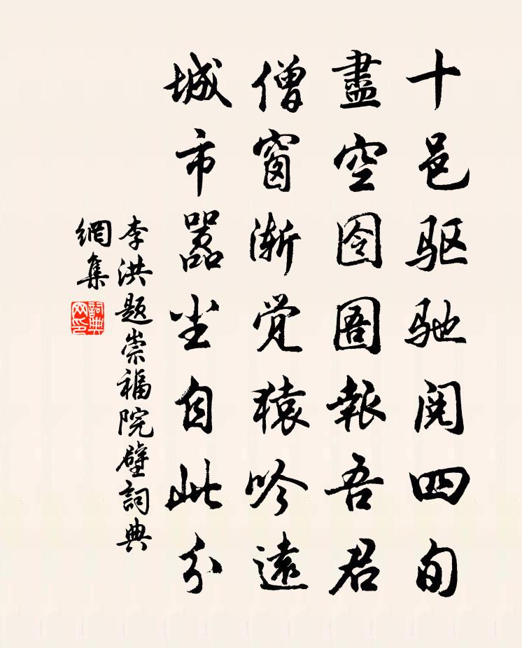 詩詞名句歷史字典書法欣賞書法字典國語詞典說文解字康熙字典古漢語字典標 題 作 者 詩 句 題崇福院壁作者:李洪 朝代:宋代題崇福院壁原文十邑驅馳閱四旬,盡空囹圄報吾君。僧窗漸覺猿吟遠,城市囂塵自此分。詩詞問答問:題崇福院壁的作者是誰?答:李洪問:題崇福院壁寫於哪個朝代?答:宋代李洪題崇福院壁書法欣賞題崇福院壁書法作品詩詞推薦皇祐觀享明堂六首佚名〔宋代〕乾享坤慶育函生,路寐明堂致潔誠。玉帛非聲期感格,降康億載保登平。次韻徐何慊詠雪陳著〔宋代〕馮夷翦水暗中央,映帶同雲淺與黃。旋積層寒消宿瘴,平鋪一白洗時妝。行仙休羨王恭興,僵叟應關洛令腸。不覺送蕭遠弟張籍〔唐代〕街北槐花傍馬垂,病身相送出門遲。與君別後秋風夜,作得新詩說向誰。少陵騎蹇驢圖葉茵〔宋代〕帽破衣寬骨相寒,為花日日醉吟鞍。時人祗道題風月,後世將詩作史看。喜姚郎中自杭州回賈島〔唐代〕路多楓樹林,累日泊清陰。來去泛流水,翛然適此心。一披江上作,三起月中吟。東省期司諫,雲門悔不尋。途次武元衡〔唐代〕去國策羸馬,勞歌行路難。地崇秦制險,人樂漢恩寬。御沼澄泉碧,宮梨佛露丹。鼎成仙馭遠,龍化宿雲殘。不問沁園春(送姚雪篷之貶所)戴復古〔宋代〕訪衡山之頂,雪鴻渺渺,湘江之上,梅竹娟娟。寄語波臣,傳言鷗鷺,穩護渠儂書畫船。又自和二首強至〔宋代〕萬事人間若漏卮,喜情常滿固難期。卻將昨日樽前菊,零落金鈿已覺衰。挽李提刑久善史堯弼〔宋代〕夢寐平生杖屨從,慣看高論吐長虹。滕王閣畔樽罍共,房琯湖中嘯詠同。忍鄉西州悲謝傅,空期斗酒酹橋公。緘詩次韻葉觀文再賦游靈源桃花二洞之作李彌遜〔宋代〕雙旌耀林丘,小隊喧笳鼓。鞭鸞相招攜,拂石共容與。愛山晉羊祜,好士漢保武。胸中補天石,筆下修月斧。追游句宋白〔宋代〕清夜驚神王,朧明到省前。雨後十小絕以一雨洗殘暑萬家生早涼為韻章甫〔宋代〕新涼可穿衣,出門造誰家。城頭有高樓,散我兩腳座。醉中作陸游〔宋代〕宦遊三十載,舉步亦看人。愛酒官長罵,近花丞相嗔。湖山今入手,風月始關身。少吐胸中氣,從教白髮新。母子吟釋文珦〔宋代〕遊子行遠方,慈母在高堂。砌有忘憂草,對之還斷腸。母心乃如斯,子心其可忘。子心苟如母,足以感蒼蒼。君不次韻李舍人鄧肅〔宋代〕道山文章伯,杖履作幽棲。筆硯為戲事,業落翻墨螭。平生百萬言,定相初不離。更憐世間士,塵網深相闈。笑踵見紫荊花韋應物〔唐代〕雜英紛已積,含芳獨暮春。還如故園樹,忽憶故園人。駕幸天長寺應制廣宣〔唐代〕天界宜春賞,禪門不掩關。宸游雙闕外,僧引百花間。車馬喧長路,煙雲淨遠山。觀空復觀俗,皇鑒此中閒。漫興九首方回〔宋代〕陰陰白晝似昏黃,平地愁城萬里長。稻臥三秋常是雨,菊殘十月尚無霜。泌園春王哲〔元代〕王哲惟名,自稱知明,端正不羈。更復呼佳號重陽子,做真清真淨,相從相隨。每銳仙經,長燒心炷,水火功夫依問疾封中錄詩庾信〔南北朝〕形骸違學宦。狹巷幸為閒。虹回或有雨。雲合又含寒。橫湖韻鶴下。回溪狹猿還。懷賢為榮衛。和緩惠綺紈。名句推薦求得人間成小會,試把金尊傍菊叢。晏殊《破陣子·燕子欲歸時節》 眼痛滅燈猶暗坐, 逆風吹浪打船聲。白居易《舟中讀元九詩》 漢兵已略地,四方楚歌聲。虞姬《和項王歌》 芳洲拾翠暮忘歸,秀野踏青來不定。張先《木蘭花·乙卯吳興寒食》 家在夢中何日到,春來江上幾人還?盧綸《長安春望》 想牧之、千載尚神遊,空山冷。吳潛《滿江紅·齊山繡春台》 問君何能爾?心遠地自偏。陶淵明《飲酒·其五》 半生已分孤眠過,山枕檀痕涴。納蘭性德《虞美人·曲闌深處重相見》 燈火萬家城四畔,星河一道水中央。白居易《江樓夕望招客》 翠輦不來金殿閉,宮鶯銜出上陽花雍陶《天津橋望春》