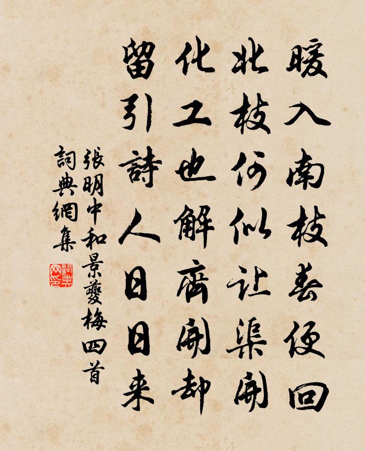 詩詞名句歷史字典書法欣賞書法字典國語詞典說文解字康熙字典古漢語字典標 題 作 者 詩 句 和景夔梅四首作者:張明中 朝代:宋代和景夔梅四首原文暖入南枝春便回,北枝何似讓渠開。化工也解齊開卻,留引詩人日日來。詩詞問答問:和景夔梅四首的作者是誰?答:張明中問:和景夔梅四首寫於哪個朝代?答:宋代張明中和景夔梅四首書法欣賞和景夔梅四首書法作品詩詞推薦和立齋歲寒歌五章王柏〔宋代〕羌人生之秉貞兮孰無陽秋,惟澹而無欲兮斯能無求。宜此心之冰堅兮凜北風之正遒,歲寒之常兮足以自修。念奴嬌(登平江齊雲樓,夜飲雙瑞堂,呈雷吏部)張鎡〔宋代〕東吳名勝,有高樓直在,浮雲齊處。十二闌乾邀遠望,歷歷斜陽煙樹。香徑人稀,屧廊山繞,往事今何許。一天和賀曾帥得祠二首釋善珍〔宋代〕台省群飛競刺天,琳宮散吏管雲煙。長才十月得霜鶻,拙宦三江上水船。身外聲名輸飲酒,世間屈曲勝巢仙。丈夫閏八月二十五日菊有黃花園中粲然奪目九日不蘇轍〔宋代〕年年九日憂無菊,今歲床空未有糟。世事何嘗似人意,天公端解惱吾曹。金龜解去瓶應滿,玉液傾殘氣尚豪。門外豐樂亭小飲歐陽修〔宋代〕造化無情不擇物,春色亦到深山中。山桃溪杏少意思,自趁時節開春風。看花游女不知醜,古妝野態爭花紅。人生與處慶老若圭游雪竇杖錫二首陳著〔宋代〕坐斷青蓮七寶池,又攜鐵錫踏嵌崎。一千丈雪與心照,二十里雲隨步飛。崖壁遍留吟墨跡,樵芻爭看袒紅衣。山林席李嶠〔唐代〕避席承宣父,重筵揖戴公。桂香浮半月,蘭氣襲迴風。舞拂丹霞上,歌清白雪中。佇將文綺色,舒捲帝王宮。文宣王及其弟子贊宋高宗〔宋代〕式是壤伯,昭乎聖徒。執經請益,載道若無。詩書規矩,學問楷模。得時而駕,領袖諸儒。予平生願學忠恕既以自勉亦告於人王牒正則聞周必大〔宋代〕中心為忠,如心為恕。勉強行之,道其殆庶。秋日山居好十首舒岳祥〔宋代〕秋日山居好,秋濤木末橫。龍藏寒水靜,鶻擊廣原平。紅葉茅茨露,黃花曲糵成。西風輕步履,隨意得閒行。新安官舍閒坐來鵠〔唐代〕寂寞空階草亂生,簟涼風動若為情。不知獨坐閒多少,看得蜘蛛結網成。頌古一百則釋正覺〔宋代〕第二頭分悟破迷,快須攃手舍筌蹄。功兮未盡成駢拇,智也難知覺噬臍。兔老冰盤秋露泣,烏寒玉樹曉風淒。持來敘雪寄喻鳧方乾〔唐代〕密片無聲急復遲,紛紛猶勝落花時。從容不覺藏苔徑,宛轉偏宜傍柳絲。透室虛明非月照,滿空回散是風吹。高人離京作寇準〔宋代〕致君才業本無能,戀闕情懷老不勝。欲過龍津重回首,朣朧初日上觚稜。持節和王樞密三首曹勛〔宋代〕右府登車竦聽觀,皎如玉韻葉和鑾。清薰已解南風慍,和氣先舒易水寒。行李喜陪金虎節,移文應閟竹皮冠。原看夜看月邊行雲張鎡〔宋代〕眾人看月愛月蝗,老夫看月愛雲行。青天澄霽月當夜,但有爽快無幽情。今宵半月從西上,雲向東移滿虛曠。初如馬上見賣白蓮者三首陳造〔宋代〕東盪花百頃寬,花滿盪蓮結花。孤村蓮盪西,茅茨吾所家。年年紅紫盡,為春留芳華。酒船墮雲錦,歌棹凌瑞霞。與公序避暑石盎方晝欲寢聞林間鳥樂因得小詩李彌遜〔宋代〕一林啼鳥不知名,應怪山翁此地行。化蝶與周俱是夢,游魚知我久忘情。胸中丘壑真餘事,世上功名畏後生。但得四威儀釋慧空〔宋代〕住,五合黃陳半瓢醋。見客來,般般皆要做。登廣武古戰場懷古李白〔唐代〕秦鹿奔野草,逐之若飛蓬。項王氣蓋世,紫電明雙瞳。呼吸八千人,橫行起江東。赤精斬白帝,叱吒入關中。兩龍名句推薦見賢思齊焉,見不賢而內自省也。孔子弟子《論語·里仁篇》 一看腸一斷,好去莫回頭。白居易《南浦別》 願借天風吹得遠,家家門巷盡成春。李方膺《題畫梅》 夜戰桑乾北,秦兵半不歸。許渾《塞下曲》 修己而不責人左丘明《左傳·閔公·閔公二年》 夜月一簾幽夢,春風十里柔情。秦觀《八六子·倚危亭》 旅館寒燈獨不眠,客心何事轉悽然。高適《除夜作》 古之史也辯道,今之史也耀文。王通《中說·卷三·事君篇》 吞舟之魚,陸處則不勝螻蟻呂不韋《呂氏春秋·覽·審分覽》 十五彩衣年,承歡慈母前。孟浩然《送張參明經舉兼向涇州覲省》
