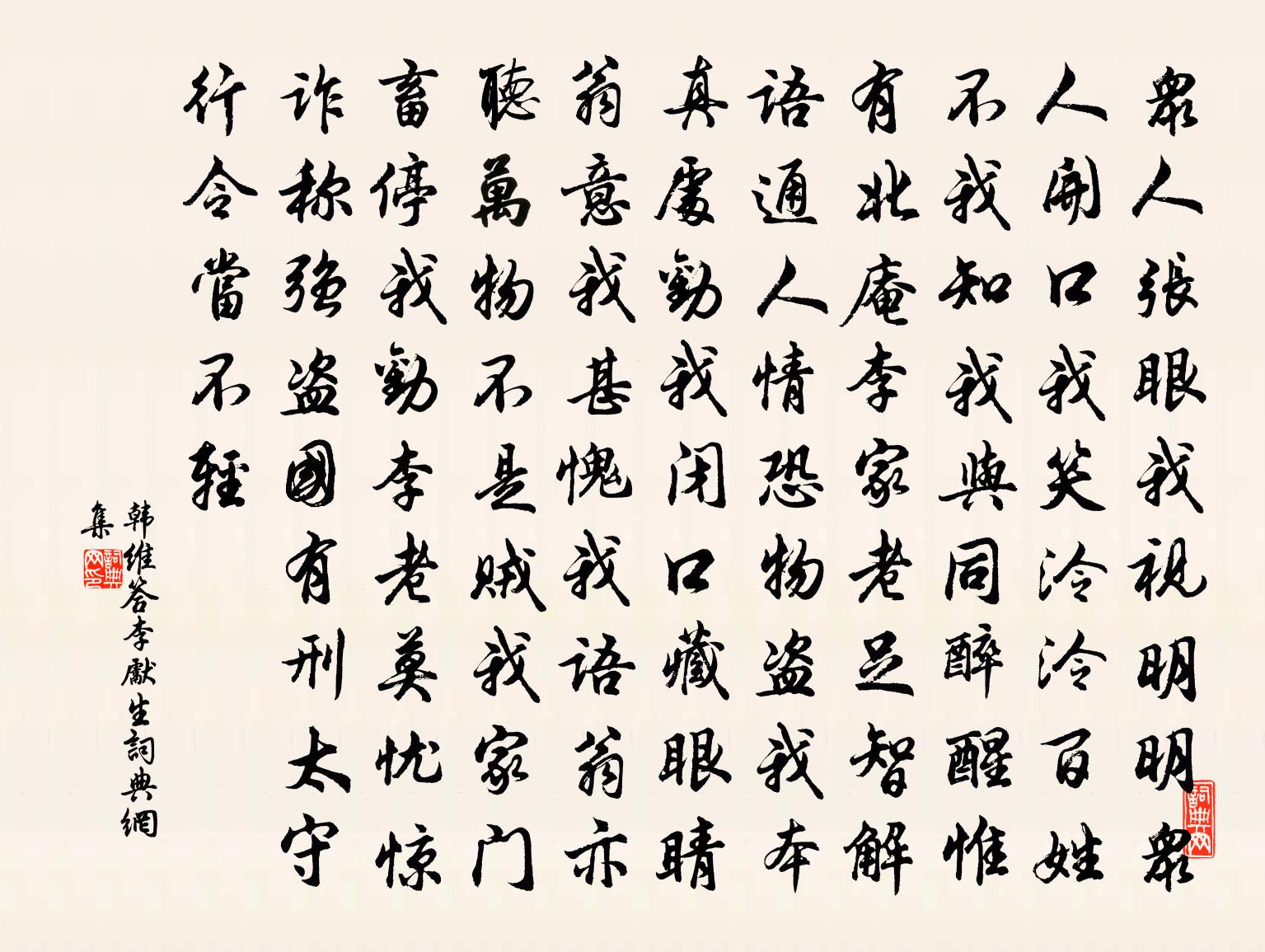 詩詞名句歷史字典書法欣賞書法字典國語詞典說文解字康熙字典古漢語字典標 題 作 者 詩 句 答李先生作者:韓維 朝代:宋代答李先生原文眾人張眼,我視明明。眾人開口,我笑泠泠。百姓不我知,我與同醉醒。惟有北庵李家老,足智解語通人情。恐物盜我本真處,勸我閉口藏眼睛。翁意我甚愧,我語翁亦聽。萬物不是賊,我家門畜停。我勸李老莫憂驚,詐稱強盜國有刑,太守行令當不輕。詩詞問答問:答李先生的作者是誰?答:韓維問:答李先生寫於哪個朝代?答:宋代韓維答李先生書法欣賞答李先生書法作品詩詞推薦遺鏡劉天益〔宋代〕親去鏡亦去,鏡還親不還。從今磨積垢,終不對慈顏。明月掛台上,白雲生匣間。洪恩何以報,羞見鬢毛斑。題八功德水王安石〔宋代〕欲尋阿練若,曳屐出東岡。澗谷芳菲少,春風著野桑。記小圃花果二十首劉克莊〔宋代〕曼卿仙不死,隱隱素騾嘶。走入芙蓉里,花心路忽迷。偈頌三十六首釋如珙〔宋代〕龍門無宿客,不是點額人。孤峰無宿客,不是守株人。紅日繞須彌,清風遍寰宇。題南康晏史君望雲亭王安石〔宋代〕南康父老傳史君,疾呼急索初不聞。未嘗遣汲浴簾水,三歲只望香爐雲。雲徐無心澹無滓,史君恬靜亦如此。飈然蟾宮曲·雪薛昂夫〔元代〕天仙碧玉瓊瑤,點點揚花,片片鵝毛。訪戴歸來,尋梅懶去,獨釣無聊。一個飲羊羔紅爐暖閣,一個凍騎驢野店溪送山人二首王建〔唐代〕嵩山古寺離來久,回見溪橋野葉黃。辛苦老師看守處,為懸秋藥閉空房。山客狂來跨白驢,袖中遺卻潁陽書。人間題信國墨梅釋道璨〔宋代〕太耐冰霜老玉關,北風滿面不知寒。無邊生意天難泄,春色教人紙上看。留遊子明范成大〔宋代〕得得跫音喜,匆匆笑口開。牢愁攻易破,歸夢挽難回。我已疏茶碗,君今減酒杯。不知乘興棹,更得幾回來。紅樓院應制(一作僧廣宣詩)沈佺期〔唐代〕紅樓疑見白毫光,寺逼宸居福盛唐。支遁愛山情謾切,曇摩泛海路空長。經聲夜息聞天語,爐氣晨飄接御香。誰謂宣城宴六縣宰吳泳〔宋代〕本是詞林翰墨臣,詔書特遣牧宣城。使君只辦平平政,令尹無要赫赫名。獄苟得情須近恕,財如足用莫求贏。荻花八月望夜不見月有感宋祁〔宋代〕素波涼暈淡層城,怊悵三年此夜情。獨捲疏帷成默坐,暗蟲相應作秋聲。仙遊寺(有龍潭穴、弄玉祠)李華〔唐代〕舍事入樵徑,雲木深谷口。萬壑移晦明,千峰轉前後。嶷然龍潭上,石勢若奔走。開拆秋天光,崩騰夏雷吼。靈溪塞上胡宿〔唐代〕漢家神箭定天山,煙火相望萬裡間。契利請盟金匕酒,將軍歸臥玉門關。雲沈老上妖氛斷,雪照回中探騎閒。五餌次韻郡粹王子文小園詠春戴復古〔宋代〕州縣徒勞喜近民,民間何事不關身。誰知風月台中客,自是絲綸閣上人。萬縷綠垂楊柳雨,一梢紅破海棠春。小園題趙蒙齋子山居詩集顧逢〔宋代〕用書全不覺,地步有餘寬。如此自然句,還須識者觀。空中圓未易,妙處到尤難。草聖更奇特,龍蛇走一般。酬陳勉仲勉仲寄示諸公所和黃字韻詩軸且責其王之道〔宋代〕失梳蓬鬢結,欠洗垢衣黃。我欲齊榮辱,誰能較短長。賤貧猶不去,富貴慎無忘。豈敢貪懷璧,春秋戒越鄉。爇心香 岐陽鎮張同監問修行馬鈺〔元代〕休問因緣,各做修行。古人言、兩句堪聽。人人有分,個個圓明。但事情疏,心情淨,達長生。元氣盈盈, * 成講詩徹章置酒崇政殿講官兩府宗室近臣皆預會宋庠〔宋代〕經藝尊詩學,書林眷講臣。禮將恩並渥,道與日俱新。聖問臨篇裕,王風即席淳。妙談開寶帙,高宴寵華紳。朝笏貽從軍行儲光羲〔唐代〕取勝小非用,來朝明光殿。東平不足先,夢出鳳林間。夢還滄海闕,萬里盡陰色。豈為我離別。馬上吹笛起寒風,名句推薦東風楊柳欲青青。煙淡雨初晴。晏殊《訴衷情·東風楊柳欲青青》 對瀟瀟暮雨灑江天,一番洗清秋。柳永《八聲甘州·對瀟瀟暮雨灑江天》 韶華不為少年留,恨悠悠,幾時休?秦觀《江城子·西城楊柳弄春柔》 白兔搗藥秋復春,嫦娥孤棲與誰鄰?李白《把酒問月·故人賈淳令予問之》 百花頭上開,冰雪寒中見。辛棄疾《生查子·重葉梅》 聖人之道,寬而栗,嚴而溫,柔而直,猛而仁。劉安及其門客《淮南子·汜論訓》 久雨寒蟬少,空山落葉深。秘演《山中》 統豺虎,御邊幅,號令明,軍威肅。宋江《滿江紅·喜遇重陽》 平生多感激,忠義非外獎。李白《酬裴侍御對雨感時見贈》 不知馬骨傷寒水,惟見龍城起暮雲。王涯《塞下曲二首·其二》