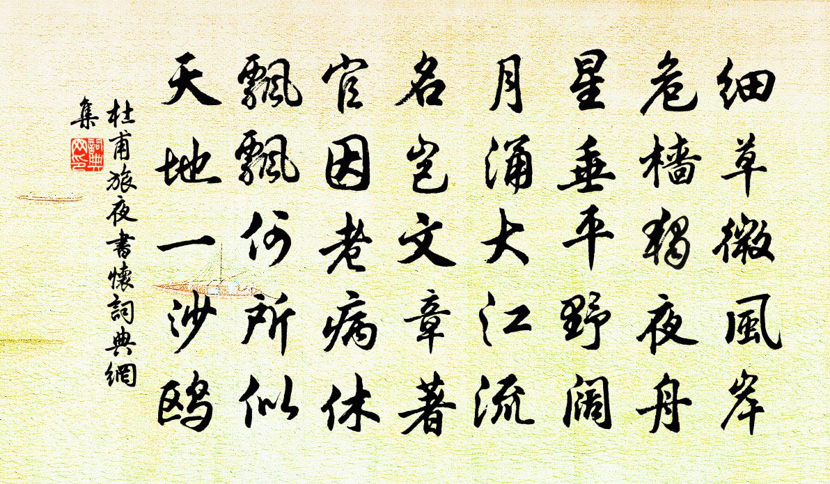 後四句書“懷”:“名豈文章著”,聲名不因政治抱負而顯著,反因文章而顯著,這本非自己的矢志,故說“豈”,這就流露出因政治理想不得實現的憤慨。說“官應老病休”, 詩人辭去官職,並非因老而多病,什麼原因,詩人沒有直接說出。說“應”當,本是不應當,正顯出老詩人悲憤的心情。面對遼闊寂寥的原野,想起自己的痛苦遭遇,深感自己漂泊無依,在這靜夜孤舟的境界中自己恰如是天地間無所依存的一隻沙鷗。以沙鷗自況,乃自傷飄泊之意。