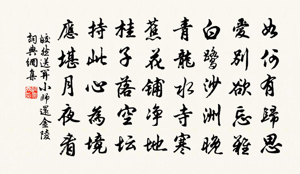 詩詞名句歷史字典書法欣賞書法字典國語詞典說文解字康熙字典古漢語字典標 題 作 者 詩 句 送關小師還金陵作者:皎然 朝代:唐代送關小師還金陵原文如何有歸思,愛別欲忘難。白鷺沙洲晚,青龍水寺寒。蕉花鋪淨地,桂子落空壇。持此心為境,應堪月夜看。詩詞問答問:送關小師還金陵的作者是誰?答:皎然問:送關小師還金陵寫於哪個朝代?答:唐代問:送關小師還金陵是什麼體裁?答:五律皎然送關小師還金陵書法欣賞送關小師還金陵書法作品注釋全唐詩:卷818-17詩詞推薦奉和襲美病中庭際海石榴花盛發見寄次韻陸龜蒙〔唐代〕紫府真人餉露囊,猗蘭燈燭未熒煌。丹華乞曙先侵日,金焰欺寒卻照霜。誰與佳名從海曲,只應芳裔出河陽。那堪望梅佚名〔宋代〕小寒時節,正同雲暮慘,勁風朝烈。信早梅、偏占陽和,向日暖臨溪,一枝先發。時有香來,望明艷、瑤枝非雪。臥羊山鄭士懿〔宋代〕見羊疑是已叱石,見石翻疑未叱羊。非石非羊何所見,這些意思難商量。送僧之宣城鮑溶〔唐代〕昔從謝太守,賓客宛陵城。有日持齋戒,高僧識姓名。秋風送客去,安得盡忘情。六州歌頭(和陳次賈韻餞其行)李曾伯〔宋代〕桂香深處,傾蓋嶺之西。雲南外,曾指點,是攣鞮。酌玻璃。篸帶江山里,揮銀筆,摛綺句,湖海氣,羞篷弱,吐即事釋紹嵩〔宋代〕殘日住孤館,虛廓繞幾乃。沙鷗背人去,江雨帶潮來。古驛怪藤合,霜花錯節開。時因念衰疾,獨與暮猿哀。香入雲亭為高子章賦杜去輕〔宋代〕山麓有庭存古意,不種凡花惟種桂。苔葑蘚剝迸鱗皺,雪勁霜頑聾蒼翠。栽培豈解一日成,愛惜至今尤不易。來人次韻芻父上巳日同游朱園四首蘇泂〔宋代〕柳長沙白草離離,萬物東南漸絜齊。自折桃花玩春水,人生修短總成泥。子駿運使八詠堂寶峰亭文同〔宋代〕嘉陵抱江回,平衍出橫澨。中間築雄壘,獨據兩川會。行台敞嚴府,磊砢北城外。潭潭走群楹,直上巒嶺背。危牆扇子詩李石〔宋代〕寒藤霜露又經秋,夢入江湖戲白鷗。二十年來行腳地,耆婆天上看河流。人問應舉雍陶〔唐代〕莫驚西上獨遲回,只為衡門未有媒。惆悵賦成身不去,一名閒事逐秋回。送劉公求還廬陵兼屬張元亨五首趙蕃〔宋代〕世有封胡羯末,非無觸目琳琅。何似君家兄弟,睟然面背難藏。秋宵辭白玉蟾〔宋代〕此身非我有,在世聊爾為。於此儻有得,夫復何所悲。遂將鬱抑懷,寫作悽苦辭。如彼深閨婦,暗起鴛鴦思。蒼蒼偶書三首張耒〔宋代〕秋陰漫漫幾千里,赤壁磯前天接水。連檣接舵不復行,老魚擘波時出戲。黃橙紫栗收如積,青錢買酒不堪惜。北人喜鵲乾隆〔清代〕喜鵲聲唶唶,俗雲報喜鳴。我屬望雨候,厭聽為呼晴。一路海棠正開陳普〔宋代〕入樵萬裏海棠林,花作雲霞樹作陰。莫笑道人行此路,卻懷程邵看花心。和樂天洛下雪中宴集寄汴州李尚書劉禹錫〔唐代〕洛城無事足杯盤,風雪相和歲欲闌。樹上因依見寒鳥,坐中收拾盡閒官。笙歌要請頻何爽,笑語忘機拙更歡。遙想菩薩蠻(湖上即事)侯置〔宋代〕樓前曲浪歸橈急。樓中細雨春風濕。終日倚危闌。故人湖上山。高情渾似舊。只枉東陽瘦。薄晚去來休。裝成一段百字令/念奴嬌佚名〔宋代〕自天鍾秀,看人物誰與、君家為比。椿桂相輝年少日,事業文章如此。玉殿詩書,金甌姓字,簡記宸衷里。有三株兩峰睡覺趙文〔宋代〕宿酒初醒喚夢回,起來詩句暗敲推。山童熟睡呼不應,櫪馬齕芻風雨來。名句推薦亂石穿空,驚濤拍岸,捲起千堆雪。蘇軾《念奴嬌·赤壁懷古》 流光容易把人拋,紅了櫻桃,綠了芭蕉。蔣捷《一剪梅·舟過吳江》 關河底事空留客?歲月無情不貸人。于謙《立春日感懷》 自勝之謂強。韓非及後人《韓非子·喻老》 知是人家花落盡,菜畦今日蝶來多。高啟《春暮西園》 曾伴浮雲歸晚翠,猶陪落日泛秋聲。高蟾《金陵晚望》 怒濤卷霜雪,天塹無涯。柳永《望海潮·東南形勝》 山外青山樓外樓,西湖歌舞幾時休?林升《題臨安邸》 怕歌愁舞懶逢迎。妝晚托春酲。陸游《朝中措·代譚德稱作》 東風灑雨露,會入天地春。李白《送郄昂謫巴中》