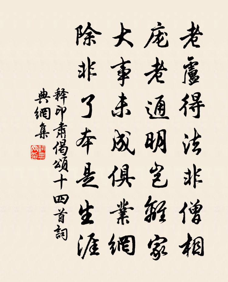詩詞名句歷史字典書法欣賞書法字典國語詞典說文解字康熙字典古漢語字典標 題 作 者 詩 句 偈頌十四首作者:釋印肅 朝代:宋代偈頌十四首原文老盧得法非僧相,龐老通明豈離家。大事未成俱業網,除非了本是生涯。詩詞問答問:偈頌十四首的作者是誰?答:釋印肅問:偈頌十四首寫於哪個朝代?答:宋代釋印肅偈頌十四首書法欣賞偈頌十四首書法作品詩詞推薦大雲池泛舟李群玉〔唐代〕九月蓮花死,萍枯霜水清。船浮天光遠,棹拂翠瀾輕。古木□□□,了無煙靄生。游鱗泳皎潔,洞見逍遙情。漁父金國賀會慶節使人到闕集英殿宴致語口號崔敦詩〔宋代〕盛節簪紳宴玉京,紅雲深護赭袍明。寶花合座天香滿,仙羽分陳御斝行。原隰有光交信睦,廟堂無事樂和平。歡心吳王夜宴圖真山民〔宋代〕銀漏迢迢夜未晨光,管弦聲里綺羅春。飲闌方擁名娃醉,豈料稽山正臥薪。所居李商隱〔唐代〕窗下尋書細,溪邊坐石平。水風醒酒病,霜日曝衣輕。雞黍隨人設,蒲魚得地生。前賢無不謂,容易即遺名。和史侍郎游澹岩韻六首曾協〔宋代〕我公得入如來室,心境常明不用磨。好倚懸崖結趺座,任從來者問云何。雪霽別鄉釋文珦〔宋代〕雪霽別鄉關,經行百裡間。溪流殊蕩漾,山色正{左文右闌}{左文右扁}。民散無多戶,程途轉幾灣。衰齡垂八寄玉溪林逢吉六首戴復古〔宋代〕經年不見玉溪翁,百里江山萬里同。無計相從話心曲,時揮一紙寄西風。武夷九曲棹歌留元剛〔宋代〕五曲雲崖有許深,石門書屋著修林。堂堂不泯清風在,一片寒潭印我心。人日即事陳允平〔宋代〕春寒猶撥地爐灰,門巷蕭條客不來。特有落梅三四點,晚風吹上石棋台。衰松孟郊〔唐代〕近世交道衰,青松落顏色。人心忌孤直,木性隨改易。既摧棲日乾,未展擎天力。終是君子材,還思君子識。江陰何仲禮相訪和答仇遠〔宋代〕月照空梁幾夢中,扁然環佩下天風。十年不到澄江上,一櫂能來瀨水東。湖海交遊今漸少,英豪見識略相同。舊時題支山南峰僧皮日休〔唐代〕雲侵壞衲重隈肩,不下南峰不記年。池裡群魚曾受戒,林間孤鶴欲參禪。雞頭竹上開危徑,鴨腳花中擿廢泉。無限占星者謂命宮月孛,獨行無害,但去年復照作范成大〔宋代〕昔躔初度本除災,何意重逢作病媒。久住靈游今日過,歷翁歡喜勸椒杯。贈坦菴告別白玉蟾〔宋代〕杖頭挑起一天雲,政是梅花十月春。猿叫千山風勢惡,雪迷萬里雨聲頻。今朝瓢笠遊方外,舊處煙霞失主人。好去和野菜吟趙希逢〔宋代〕人生何用廣田宅,憂懷千歲不滿百。飢來糲飯薦苜蓿,不必膾魯更炮鱉。何人日流餓虎涎,望望一飽蟻慕羶。豈知和劉後村梅花百詠方蒙仲〔宋代〕十分元得孤寒力,一點無關坱圠功。誰令春風來得晚,梅花也不傲春風。送菜徐秀才李新〔宋代〕增添庾郎方丈,掇拾儀休棄遺。但令門人學圃,不妨夫子下帷。南鄉子黃庭堅〔宋代〕未報賈船回。三徑荒鋤菊臥開。想得鄰船霜笛罷,沾衣。不為涪翁更為誰。風力裊萸枝。酒面紅鱗愜細吹。莫笑插甲辰正月二十三日夕壬申夢坐一江樓上見雪月李新〔宋代〕風卷寒雲雪壓船,樓台隱約隔明煙。黃庭掩映桃紅篆,靜看雙鵝一水天。代廣漕劉元舉謝趙相茶二首曹勛〔宋代〕龍焙黃封錫有功,謹嚴正味德相同。便知鈞播無求備,更借扶南兩腋風。名句推薦千里搭長棚,沒有不散的筵席。曹雪芹《紅樓夢·第七十二回》 初驚河漢落,半灑雲天裡。李白《望廬山瀑布水二首》 請君看取東流水,方識人間別意長。嚴仁《鷓鴣天·惜別》 無端和淚拭胭脂,惹教雙翅垂張泌《蝴蝶兒·蝴蝶兒》 以若所為,求若所欲,猶緣木而求魚也。孟子《孟子·梁惠王章句上·第八節》 君子之於子,愛之而勿面,使之而勿視,道之以道而勿強。荀子《荀子·大略》 一曲當筵落淚,重掩羅巾。晏殊《山亭柳·贈歌者》 花枝出建章,鳳管發昭陽。皇甫冉《婕妤怨》 只知逐勝忽忘寒,小立春風夕照間。楊萬里《最愛東山晴後雪》 白馬繞旌旗,悲鳴相追攀。李白《豫章行》