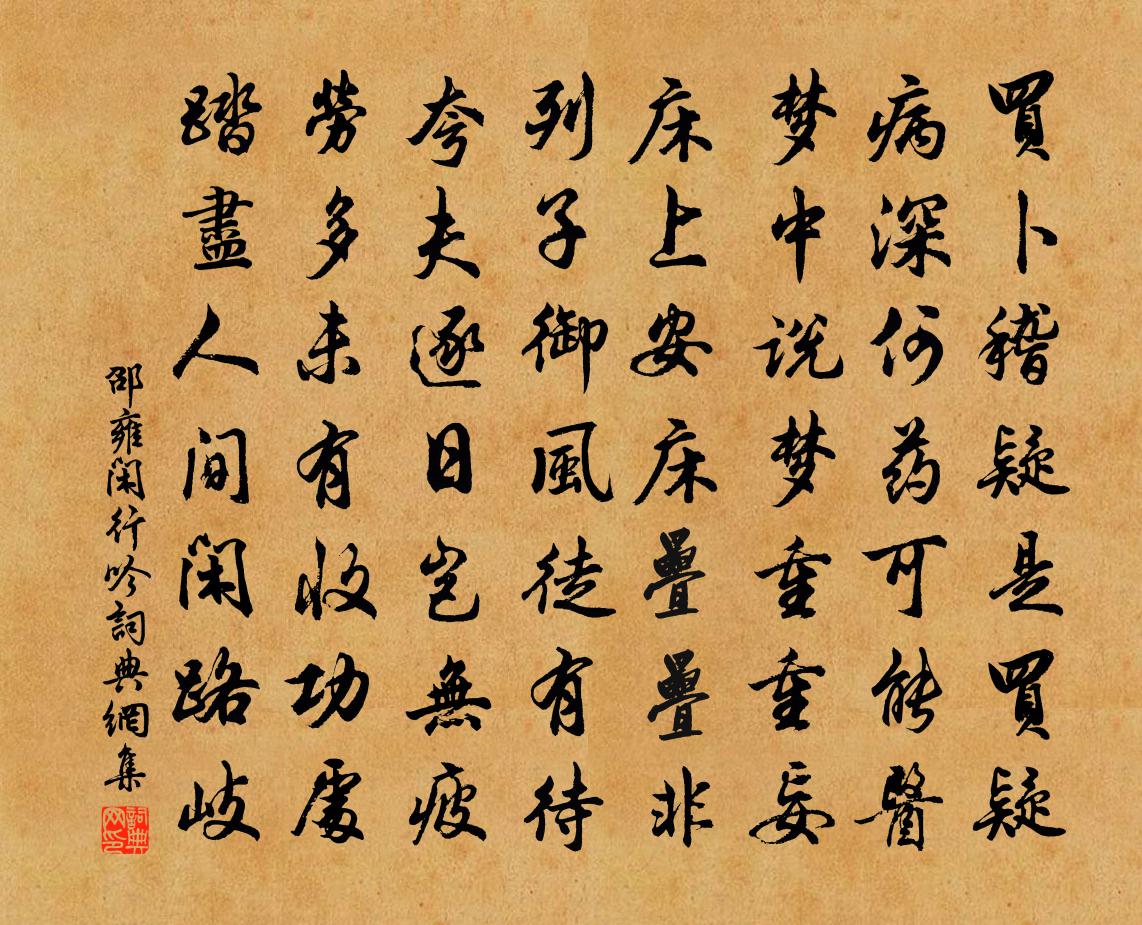 詩詞名句歷史字典書法欣賞書法字典國語詞典說文解字康熙字典古漢語字典標 題 作 者 詩 句 閒行吟作者:邵雍 朝代:宋代閒行吟原文買卜稽疑是買疑,病深何藥可能醫。夢中說夢重重妄,床上安床疊疊非。列子御風徒有待,夸夫逐日豈無疲。勞多未有收功處,踏盡人間閒路岐。詩詞問答問:閒行吟的作者是誰?答:邵雍問:閒行吟寫於哪個朝代?答:宋代邵雍閒行吟書法欣賞閒行吟書法作品詩詞推薦四怨三愁五情詩十二首。一怨曹鄴〔唐代〕美人如新花,許嫁還獨守。豈無青銅鏡,終日自疑醜。金陵陳月觀同年三首黎廷瑞〔宋代〕莫道桐花楝實清,比量腐鼠不堪爭。鬼應勿復揶揄汝,人亦真難駕馭卿。犬子何心求狗監,貛郎到處有魚羹。白雲寄題徐候雨山堂劉克莊〔宋代〕竹溪來索後村吟,讀記披圖已醒心。豈是沕淵行雨懶,亦非避地入山深。喜看素瀑飛青壁,不管蒼苔臥綠沉。西北雪歌陸游〔宋代〕黑雲黯黯如翻鴉,急霰颯颯疑投沙。初聞萬竅號地籟,已見六出飛天花。寧論異事吠群犬,且喜和氣連千家。穿簾視蘊文晁說之〔宋代〕飄零海角悟平生,豈料王孫肯遠行。遲日待君游化國,淒風要我到愁城。詩書灰燼寧無夢,翰墨馨香尚有情。聞道送僧歸護國寺黃宗旦〔宋代〕一瓶一缽是生涯,來扣樞扉帶礪家。寵服降從丹鳳闕,禪房歸掩赤城霞。五芝岩下傳心印,八桂峰前散雨花。還伴次韻芻父大篇蘇泂〔宋代〕我生兩腳半八區,歸來狹視東南隅。東南禹跡今綠蕪,百歲幾見人歐蘇。聞石蘊玉川含珠,山乃秀潤源不枯。胸蟠鷓鴣鄭谷〔唐代〕暖戲煙蕪錦翼齊,品流應得近山雞。雨昏青草湖邊過,花落黃陵廟裡啼。遊子乍聞征袖濕,佳人才唱翠眉低。相呼封泰山樂章。豫和佚名〔唐代〕樂已終,煙燎上。懷靈惠,結皇想。歸風疾,迴風爽。百福來,眾神往。乙丑改元開禧元日楊萬里〔宋代〕開禧元祀更元正,宿兩新收放曉晴。夜半梅花添一歲,夢中爆竹報殘更。方知人喜天亦喜,作麽鍾鳴雞未鳴。老子將母赴贛道西昌文天祥〔宋代〕重來鷗閣曉,帆影漲新晴。倚檻雲來去,閉簾花送迎。江湖春汗漫,歲月老崢嶸。手把忘憂草,夔夔繞太清。喜雪六首陳造〔宋代〕玉龍睡起長風激,盡蛻玉鱗漂八極。蓬仙帝女聚瑤台,剪水效祥誰所役。或疑天公陋塵域,幻作冰壺供一劇。是耶贈酒泉韓太守岑參〔唐代〕太守有能政,遙聞如古人。俸錢盡供客,家計常清貧。酒泉西望玉關道,千山萬磧皆白草。辭君走馬歸長安,憶君謁巫山廟薛濤〔唐代〕亂猿啼處訪高唐,路入煙霞草木香。山色未能忘宋玉,水聲猶是哭襄王。朝朝夜夜陽台下,為雨為雲楚國亡。惆悵呂吉父使君生日陳師道〔宋代〕司漏凌晨報曉簽,曈曈赫日上重檐。良辰也應純乾策,吉夢先符太卜占。棣萼同時升紫禁,棠陰由此駐彤襜。一杯踏莎行(跋伯時弟撫松寄傲詩集)張炎〔宋代〕水落槎枯,田荒玉碎。夜蘭秉燭驚相對。故家人物已無傳,一燈卻照清江外。色展天機,光搖海貝。錦囊日月奚童別離情所鍾十二章章四句送定叟弟之官嚴陵張栻〔宋代〕藐茲遺體重,相對子與予。祝子以自愛,念不忝厥初。逍遙詠宋太宗〔宋代〕道者強名立,清虛隱顯深。欲行千里路,別探一般心。景象空天遠,何勞意馬尋。玄談通智慧,曩動至從今。郊廟歌辭。祀雨師樂章。迎俎酌獻包佶〔唐代〕陽開幽蟄,躬奉郁鬯。禮備節應,震來靈降。動植求聲,飛沉允望。時康氣茂,惟神之貺。和白雲庵七首磬石黃庶〔宋代〕古樂破散鄭衛起,走入萬物不可名。山中惆悵莫能到,疑是舜時韶一聲。名句推薦天下無事,不可廢武佚名《百戰奇略·第十卷·忘戰》 目之於色也,有同美焉。孟子《孟子·告子章句上·第七節》 貨有高低三等價,客無遠近一般看吳承恩《西遊記·第八十四回》 春日宴,綠酒一杯歌一遍。馮延巳《長命女·春日宴》 野竹交淇水,秋瓜蔓帝邱。司馬光《送雲卿知衛州》 昔聞洞庭水,今上岳陽樓杜甫《登岳陽樓》 斷送落花三月雨,摧殘楊柳九秋霜。施耐庵《水滸傳·第十六回》 便做無情,莫也愁人苦朱淑真《蝶戀花·送春》 蒲生我池中,其葉何離離。甄宓《塘上行》 氣性乖張,多是夭亡之子;語言深刻,終為薄福之人。王永彬《圍爐夜話·第二九則》