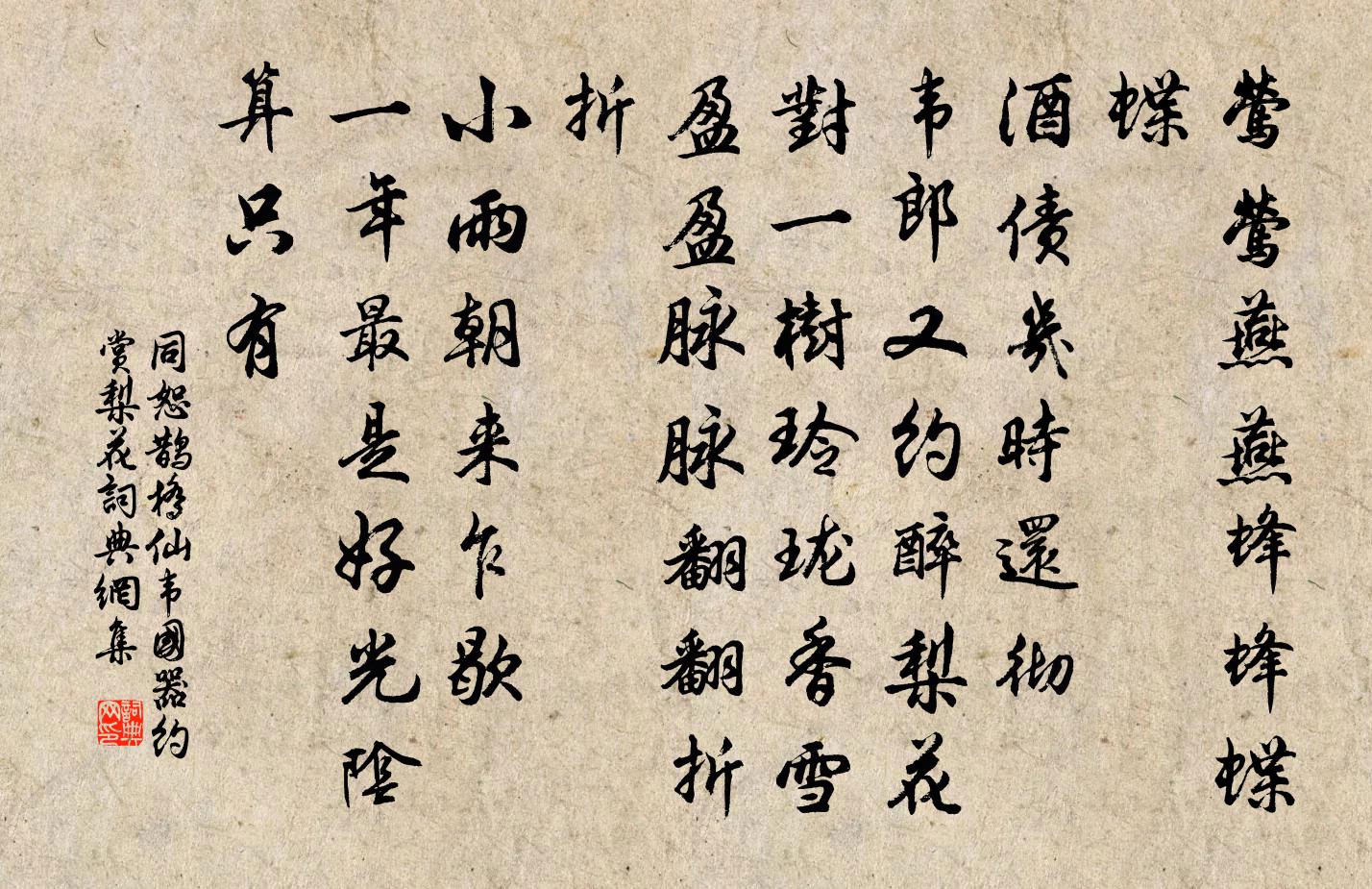 詩詞名句歷史字典書法欣賞書法字典國語詞典說文解字康熙字典古漢語字典標 題 作 者 詩 句 鵲橋仙 韋國器約賞梨花作者:同恕 朝代:元代鵲橋仙 韋國器約賞梨花原文鶯鶯燕燕,蜂蜂蝶蝶。酒債幾時還徹。韋郎又約醉梨花,對一樹、玲瓏香雪。盈盈脈脈,翻翻折折。小雨朝來乍歇。一年最是好光陰,算只有詩詞問答問:鵲橋仙 韋國器約賞梨花的作者是誰?答:同恕問:鵲橋仙 韋國器約賞梨花寫於哪個朝代?答:元代問:鵲橋仙 韋國器約賞梨花是什麼體裁?答:詞同恕鵲橋仙 韋國器約賞梨花書法欣賞鵲橋仙 韋國器約賞梨花書法作品詩詞推薦古寺偈陳堯佐〔宋代〕殿古寒爐空,流塵暗金碧。獨坐偶無人,又得真訊息。蓬萊客 本名秦樓月 贈岜山前譚二翁馬鈺〔元代〕譚公急。急迎物外逍遙客。逍遙客。專來緣化,幸無阻隔。焚燒船綱無心測。四方稱譽難名溺。難名溺。諸餘守舊陰晦殘春可惜二首宋庠〔宋代〕園林春去自無歡,宴幕經旬掩客盤。霧野關河非意失,曉樓風雨不時寒。空梁燕濕休矜舞,曲沼蛙鳴且為官。嵩少飛練鄧深〔宋代〕見說天孫巧一機,銀河練就雪爭輝。長風吹下三千尺,只恐 * 合得衣。玩螢火韋應物〔唐代〕時節變衰草,物色近新秋。度月影才斂,繞竹光複流。題舒女廟許渾〔唐代〕山樂來迎去不言,廟前高柳水禽喧。綺羅無色雨侵帳,珠翠有聲風繞幡。妝鏡尚疑山月滿,寢屏猶認野花繁。孤舟自嘆宋伯仁〔宋代〕又作淮南客,邊塵壓鬢毛。夜長蛩聒聒,家遠雁忉忉。把酒天徒問,推篷月正高。英雄四方誌,休戀故人袍。華之高壽魯齋先生七十金履祥〔宋代〕明明天子,宅此四國。寤寐幽人,旌旄幣帛。《虔州八境圖》八首蘇軾〔宋代〕濤頭寂寞打城還,章貢台前暮靄寒。倦客登臨無限思,孤雲落日是長安。句周邦彥〔宋代〕人從生處樂,誰向死前休。上晁主客陳師道〔宋代〕兩疏父子共含香,不獨家榮國有光。剩欲展懷因問疾,孰知相對只銜觴。年侵身要兼人健,節近花須滿意黃。從此酬應物見戲陳師道〔宋代〕扣門賞竹任推排,興盡歸舟挽不回。平世山林成偃蹇,新年詞句得參陪。醒心正賴揮毫疾,誤筆仍須送喜來。書省長思仙馬鈺〔元代〕夢軒轅。棄田園。難繼夷門孟四元。惟修性月圓。縛心猿。認根源。小小蛇兒俯視黿。陽純禮太原。寄梧守陶弼〔宋代〕川流八桂末,地勢九疑余。不憚勤酬唱,江通丙穴魚。傅推官勸農七絕句擬和其五登嶺鄭剛中〔宋代〕一懷天邊兩角雲,嶺頭都見嶺南春。莫懷小魯東山意,祗是早來平地人。擬題織錦圖秦觀〔宋代〕悲風鳴葉秋宵冷,寒絲縈手淚殘妝。微燭窺人悉斷腸,機翻雲錦妙成章。題屏風墨梅二首項安世〔宋代〕一段西山雪,中含太古梅。無香亦無色,免被百花猜。遊春羅與之〔宋代〕春濃無處不相宜,草暖雲昏二月時。蝶舞花梢風細細,鶯啼柳底日遲遲。模將景物歸詩卷,判得光陰付酒卮。個處和端式十題汀洲蘋司馬光〔宋代〕秋江□澹蕩,波急枝難定。參差碧葉繁,皎潔寒花靜。幽人吟不歸,獨立汀洲暝。吳門比月不雨司封使君深閔而精祈俄有佳應謹朱長文〔唐代〕一雨歡心幾萬家,預期春稻博流霞。低侵滬瀆田交岸,高傍支山水滿車。葉幄謾沾桃李實,是奩暗長芰荷花。豐年名句推薦永豐柳,無人盡日飛花雪。張先《千秋歲·數聲鶗鴂》 千里馬常有,而伯樂不常有。韓愈《馬說》 少年俠氣,交結五都雄。賀鑄《六州歌頭·少年俠氣》 意少一字則義闕,句長一言則辭妨劉勰《文心雕龍·書記》 欲為君盡君道,欲為臣盡臣道孟子《孟子·離婁章句上·第二節》 冬夜兮陶陶,雨雪兮冥冥。王逸《九思》 戀樹濕花飛不起,愁無比,和春付與東流水。朱服《漁家傲·小雨纖纖風細細》 啼時驚妾夢,不得到遼西。金昌緒《春怨 / 伊州歌》 生而富者驕,生而貴者傲。范曄《後漢書·列傳·崔駰列傳》 只言啼鳥堪求侶,無那春風欲送行。高適《夜別韋司士》