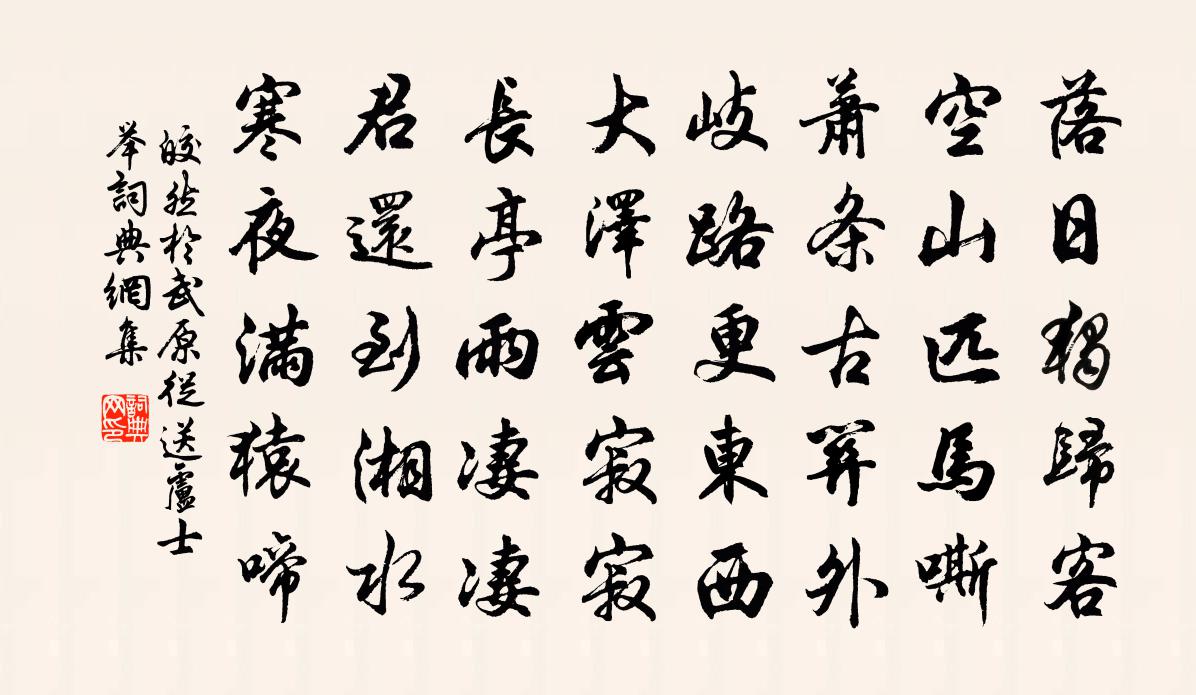 詩詞名句歷史字典書法欣賞書法字典國語詞典說文解字康熙字典古漢語字典標 題 作 者 詩 句 於武原從送盧士舉作者:皎然 朝代:唐代於武原從送盧士舉原文落日獨歸客,空山匹馬嘶。蕭條古關外,岐路更東西。大澤雲寂寂,長亭雨淒淒。君還到湘水,寒夜滿猿啼。詩詞問答問:於武原從送盧士舉的作者是誰?答:皎然問:於武原從送盧士舉寫於哪個朝代?答:唐代問:於武原從送盧士舉是什麼體裁?答:五律皎然於武原從送盧士舉書法欣賞於武原從送盧士舉書法作品注釋全唐詩:卷819-46詩詞推薦和崇清侍郎招飲超燕堂韻王邁〔宋代〕超燕堂開一面春,卻教寒畯亦充賓。西清班推名從前,南極躔中見老人。草聖已傳碑不朽,花神覺與思俱新。鄉邦長汀即事高元之〔宋代〕楊花剩得晴方好,榆莢其如世上分。花向喜中看更好,分明春色解欺人。寄范石湖五首王阮〔宋代〕彭澤歸來我自安,壺中尤覺太虛寬。世間萬事都忘盡,只有公盟不敢寒。晉謝混孫元晏〔唐代〕尚主當初偶未成,此時誰合更關情。可憐謝混風華在,千古翻傳禁臠名。秋日偶題杜牧〔唐代〕荷花兼柳葉,彼此不勝秋。玉露滴初泣,金風吹更愁。綠眉甘棄墜,紅臉恨飄流。嘆息是遊子,少年還白頭。水調歌頭(慶平交七月十七)方岳〔宋代〕世不乏季子,藉甚有休聲。芝蘭挺秀庭砌,廣廈萬間新。胸次金天爽豁,風骨玉堂清徹,才器更輪囷。勁節九秋斡好事近蘇軾〔宋代〕煙外倚危樓,初見遠燈明滅。卻跨玉虹歸去,看洞天星月。當時張范風流在,況一尊浮雪。莫問世間何事,與劍頭洛意楊億〔宋代〕蘅臯駐馬獨依依,寄恨微波帶減圍。淚跡不成雙玉箸,身輕誰賦六銖衣。穿針靜夜星榆出,擺手清晨雪絮飛。目斷秋思絕句陸游〔宋代〕一片雲生便作陰,東軒草樹共蕭森。秋風豈必關人事,自是衰翁感慨深。四聖觀周弼〔宋代〕小園寬占一山孤,別有牆遮古觀居。到了恩波攔不住,水窗游出放生魚。白公草堂楊時〔宋代〕爐峰裊裊曉煙輕,雲入屏幃一枕清。高興自應無世累,獨於妾馬未忘情。居厚弟示和詩複課十首劉克莊〔宋代〕病夫豈有力翹關,腹憤胸奇漫結蟠。昔臂靈旗窮塞下,今腰長鑱亂山間。秫田易了淵明醉,菊井難湔伯始顏。慚愧答妻馮暉〔唐代〕休說辦不辦,且看瓮里飛出雁。唐大饗拜洛樂章德和武則天〔唐代〕夕惕同龍契,晨兢當鳳扆。崇儒習舊規,偃伯循先旨。絕壤飛冠蓋,遐區麗山水。幸承三聖餘,忻屬千年始。小舟晚興四首楊萬里〔宋代〕蒻篷舊屋雨聲乾,蘆蕟新檐暖日眠。枕底席邊俱綠水,腳根頭上兩青天。晚興白居易〔唐代〕極浦收殘雨,高城駐落暉。山明虹半出,松暗鶴雙歸。將吏隨衙散,文書入務稀。閒吟倚新竹,筠粉污朱衣。黃超然參議和拙者去郡十五絕又以詩見寄屬痰吳芾〔宋代〕三復詩翁白雪篇,渴塵俄得醉心泉。高人固已追摩詰,好句還應壓玉川。快似涼風來木末,清如皓月出雲邊。呼兒滿庭芳趙佶〔宋代〕寰宇清夷,元宵游豫,為開臨御端門。暖風搖曳,香氣靄輕氛。十萬鉤陳燦錦,鈞台外、羅綺繽紛。歡聲里,燭龍誰學得徐積〔宋代〕飽則高歌醉即眠。只知頭白不知年。江繞屋,水隨船。買得風光不著錢。題方丈黃庭美〔宋代〕九重雲外步虛聲,十二時中太古情。為問當年赤松子,人生何處是功成。名句推薦落霞與孤鶩齊飛,秋水共長天一色。王勃《滕王閣序》 西湖春色歸,春水綠於染歐陽修《春日西湖寄謝法曹歌》 舊山松竹老,阻歸程。岳飛《小重山·昨夜寒蛩不住鳴》 小溪清水平如鏡,一葉飛來浪細生。徐璣《秋行》 萬壑樹參天,千山響杜鵑。王維《送梓州李使君》 長簟迎風早,空城澹月華韓翃《酬程延秋夜即事見贈》 恩疏寵不及,桃李傷春風。李白《上之回》 已訝衾枕冷,復見窗戶明。白居易《夜雪》 未晚先投宿,雞鳴早看天。佚名《增廣賢文·上集》 人棄我取,人取我與。司馬遷《史記·貨殖列傳》