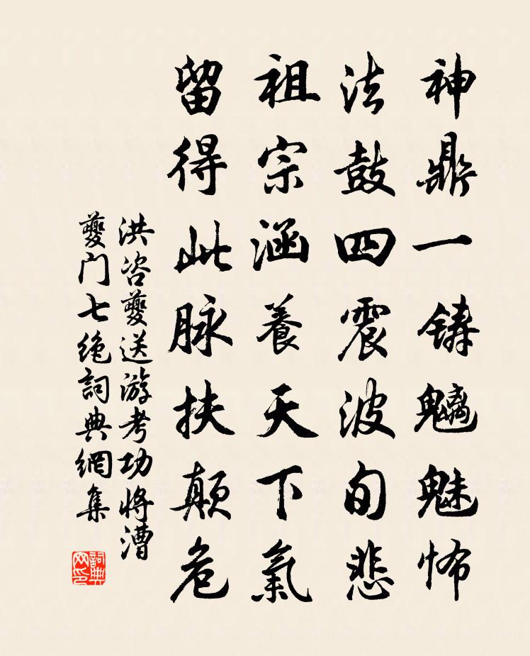 詩詞名句歷史字典書法欣賞書法字典國語詞典說文解字康熙字典古漢語字典標 題 作 者 詩 句 送游考功將漕夔門七絕作者:洪咨夔 朝代:宋代送游考功將漕夔門七絕原文神鼎一鑄魑魅怖,法鼓四震波旬悲。祖宗涵養天下氣,留得此脈扶顛危。詩詞問答問:送游考功將漕夔門七絕的作者是誰?答:洪咨夔問:送游考功將漕夔門七絕寫於哪個朝代?答:宋代洪咨夔送游考功將漕夔門七絕書法欣賞送游考功將漕夔門七絕書法作品詩詞推薦望湘人(春思)賀鑄〔宋代〕厭鶯聲到枕,花氣動簾,醉魂愁夢相半。被惜餘薰,帶驚剩眼。幾許傷春春晚。淚竹痕鮮,佩蘭香老,湘天濃暖。贈潘天游衛宗武〔宋代〕乾以健而運,如轂不停息。周流遍六虛,升降靡差忒。故能權四序,而以轉萬物。茲其氣之游,造化由是出。一元鶴鳴亭絕句四首辛棄疾〔宋代〕飽飯閒遊繞小溪,卻將往事細尋思。有時思到難思處,拍碎闌乾人不知。梅花楊萬里〔宋代〕花早春何力,香寒曉盡吹。月搖橫水影,雪帶入瓶枝。喜雨陸游〔宋代〕淅瀝檐聲枕上聞,攬衣起坐對爐熏。萬家歌舞豐年樂,未費烏龍一線雲。賀聖朝趙彥端〔宋代〕一江風月同君住。了不知秋去。賞心亭下,過帆如馬,墮楓如雨。相將莫問,興亡舊事,舉離觴誰訴。垂楊指點,勸農十首熊克〔宋代〕午村茅舍起炊煙,夫帶兒耕餒在田。赤飯黃羹須婦饁,往來莫憚走東阡。錦署楊備〔宋代〕人衣藍縷地衣紅,不念家家杼柚空。厥篚織文應歲貢,更翻新樣集機工。張虛靖圜庵扁曰歸鶴次韻袁桷〔元代〕招仙遊館構亭亭,萬疊松寒曉日青。玉局講殘春換劫,石台丹在草通靈。紅羊赤馬悲滄海, * 蒼龍儼大庭。為愛送光祿寺丞李德遠得請奉祠周必大〔宋代〕君家臨川我廬陵,兩郡相望宜相親。長安城中初結綬,石灰橋畔還卜鄰。扣門問道日不足,篝燈照夜論心曲。寸莛頌古一○一首釋子淳〔宋代〕爐湯爐炭幾何般,地獄三途未苦酸。須信新豐親切語,袈裟之下莫顢頇。秀野亭郭閶〔宋代〕插漢森森萬丈扶,一亭危瞰汨江隅。幽深石壁涵清泚,崒嵂雲山引翠蕪。變化陰晴詩作料,招呼豪傑酒為徒。客來緣識宋太宗〔宋代〕雅頌文章順化風,馨香不必在芳叢。陽和遠近隨田畝,春雨如膏有大功。酬夢得早秋夜對月見寄白居易〔唐代〕吾衰寡情趣,君病懶經過。其奈西樓上,新秋明月何?庭蕪淒白露,池色澹金波。況是初長夜,東城砧杵多。江上四首王令〔宋代〕山頭斫竹下作竿,系鉤沉水坐岸觀。餌微水濁魚不乾。棲遲終日或有得,歸去猶可妻子歡。遣興次韻和晁應之四首張耒〔宋代〕蓬門鳥雀啅黃昏,歸徑牛羊各有群。水闊魚龍陰後出,山空虎豹夜深聞。西來客引秦川雨,南去秋連楚澤雲。唐漢桃源行王維〔唐代〕漁舟逐水愛山春,兩岸桃花夾古津。坐看紅樹不知遠,行盡青溪忽值人。山口潛行始隈隩,山開曠望旋平陸。遙看句郭見義〔宋代〕半落半開梅好處,似無似有草生時。百字令 贈彈一弦子張文秀張可久〔元代〕一行秋思,記孫登當日,山中琴趣。誰識吾宗,父老子、自製寸金皮鼓。*截孤篁,絲抽獨繭,替盡琵琶譜。輕攏宿龍瑞山房次周雲隱韻黃庚〔宋代〕木葉秋容瘦,客懷思故鄉。淡雲微見月,薄露不成霜。忽忽朱顏改,悠悠白日長。空心仍獨夜,減盡昔年狂。名句推薦清夜何湛湛,孤燭映蘭幕。江淹《銅爵妓》 好夢欲成還又覺,綠窗但覺鶯啼曉。施耐庵《蝶戀花·一別家山音信杳》 雲無心以出岫,鳥倦飛而知還。陶淵明《歸去來兮辭·並序》 情如之何,暮塗為客,忍堪送君。吳文英《沁園春·送翁賓暘游鄂渚》 朱顏那有年年好,逞艷游、贏取如今韓疁《高陽台·除夜》 隱約遙峰,和淚謝娘眉嫵。史達祖《綺羅香·詠春雨》 晝成淒黯,雁飛過、垂楊轉青。吳文英《慶 * ·秋感》 興亡千古繁華夢,詩眼倦天涯。張可久《人月圓·山中書事》 微雨眾卉新,一雷驚蟄始。韋應物《觀田家》 首夏猶清和,芳草亦未歇。謝靈運《游赤石進帆海》