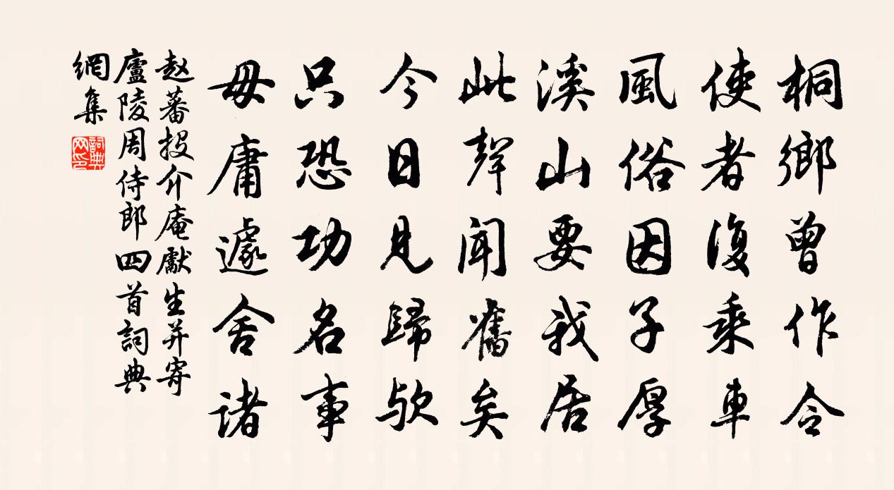 詩詞名句歷史字典書法欣賞書法字典國語詞典說文解字康熙字典古漢語字典標 題 作 者 詩 句 投介庵先生並寄廬陵周侍郎四首作者:趙蕃 朝代:宋代原文桐鄉曾作令,使者復乘車。風俗因子厚,溪山要我居。此聲聞舊矣,今日見歸歟。只恐功名事,毋庸遽舍諸。詩詞問答問:《投介庵先生並寄廬陵周侍郎四首》的作者是誰?答:趙蕃問:該詩寫於哪個朝代?答:宋代書法欣賞投介庵先生並寄廬陵周侍郎四首書法作品詩詞推薦初冬汪炎昶〔宋代〕城頭鍾斷漏初長,布被寒生一夜霜。已劇淒涼獨似較,後來風色更淒涼。水龍吟 傅淵道宅上賞紫牡丹張翥〔元代〕紫云何處飛來,仙家別有藏春洞。刻繒紋皺,鏤檀色膩,薰臍香重。穀雨初晴,榆煙新換,楝風微動。是花姑養就次韻荼槱二絕洪咨夔〔宋代〕愛春留得瓊英在,添竹扶將翠蔓高。更著金沙相間種,主人四壁錦周遭。感興何夢桂〔宋代〕擬將物化問漁樵,妙里無形本寂寥。大地雲生千嶂雨,中天月上九溟潮。山河劫運九中化,世界塵緣座上銷。此意山中雜興 其十王冕〔元代〕小艇橫河過,殘陽隔岸舂。水聲清繞屋,山氣冷侵窗。卸屐行花徑,攜書坐石缸。可知耕種好,只擬鹿門龐。華亭百詠望雲橋許尚〔宋代〕憶昨登臨日,卿雲正四翔。重來窮目力,天末起祥光。頌古三十八首釋慧方〔宋代〕捧來前面請安名,黃櫱高高喚一聲。剖出從前真面目,從茲佐得國風清。水龍吟劉克莊〔宋代〕當年玉立清揚,屋樑落月偏相照。而今衰颯,形骸百醜,情懷十拗。久已飾巾,尚堪扶杖,聽山東詔。盡後車載汝因游支硎寺寄邢端公皎然〔唐代〕大廈資多士,掄材得豫章。清門推問望,早歲騁康莊。作用方開物,聲名久擅場。丹延分塞郡,宿昔領戎行。始馭題趙團練畫江乾晚景四絕秦觀〔宋代〕鳥外雲峰晚,沙頭草樹晴。想初揮灑就,侍女一齊驚。九月五日具草酌同彥博審知成父集於普寧山半趙蕃〔宋代〕平生羞狗監,何啻失羊斟。與子風期尚,相要林壑深。分甘駒在谷,寧事鶴鳴陰。此日胡為樂,詩成改又吟。六年寒食洛下宴遊贈馮李二少尹白居易〔唐代〕豐年寒食節,美景洛陽城。三尹皆強健,七日盡晴明。東郊蹋青草,南園攀紫荊。風拆海榴艷,露墜木蘭英。假開水仙蘭洪咨夔〔宋代〕水仙瀟灑伴梅寒,鴻雁行中合數蘭。七里香花陪隸耳,涪翁醉眼被粗瞞。南還湘水言懷張九齡〔唐代〕拙宦今何有,勞歌念不成。十年乖夙志,一別悔前行。歸去田園老,倘來軒冕輕。江間稻正熟,林里桂初榮。魚意村樂黃敏求〔宋代〕槿籬圍里三間屋,棘塹周遭數畝山。雨後課兒耕種了,茅簷晴曝一冬閒。同永叔子聰游嵩山賦十二題其七天門梅堯臣〔宋代〕古壁何蒼蒼,穿雲玉梯出。欻然起青冥,卻立觀少室。前岩復後峰,陰晴狀非一。論盛孝章書 / 與曹公論盛孝章書孔融〔魏晉〕歲月不居,時節如流。五十之年,忽焉已至。公為始滿,融又過二。海內知識,零落殆盡,惟會稽盛孝章尚存。其雨中花慢姬翼〔元代〕一點靈源,澄湛照徹,多生浩劫情塵。有不夜壺天風物,亘古仍存。踞閫玉麟哮吼,對床石女談論。海童微念,寥朝中措(艮翁生日)劉克莊〔宋代〕仙風道骨北山翁。萬卷著胸中。渙若宦情冰釋,作□醉面桃紅。千林凍槁,一枝雪艷,訊息先通。顏色□青精飯,小松章孝標〔唐代〕爪葉鱗條龍不盤,梳風幕翠一庭寒。莫言只是人長短,須作浮雲向上看。名句推薦善禦敵者,正兵先合,而後扼之,此必勝之術也。尉繚《尉繚子·兵令上》 獨立寒秋,湘江北去,橘子洲頭。 * 《沁園春·長沙》 木蘭舟上,何處吳娃越艷:藕花紅照臉。孫光憲《河傳·風颭》 慷慨十年長劍在,登樓一笑暮山橫。崔允《花馬池詠》 粉骨碎身全不怕,要留清白在人間。于謙《石灰吟》 秋已盡,日猶長,仲宣懷遠更淒涼。李清照《鷓鴣天·寒日蕭蕭上瑣窗》 寒眼亂空闊,客意不勝秋。楊炎正《水調歌頭·登多景樓》 志忍私,然後能公;行忍情性,然後能修荀子《荀子·儒效》 放逐肯消亡國恨?歲時猶動楚人哀!查慎行《三閭祠》 不恥不若人,何若人有?孟子《孟子·盡心章句上·第七節》