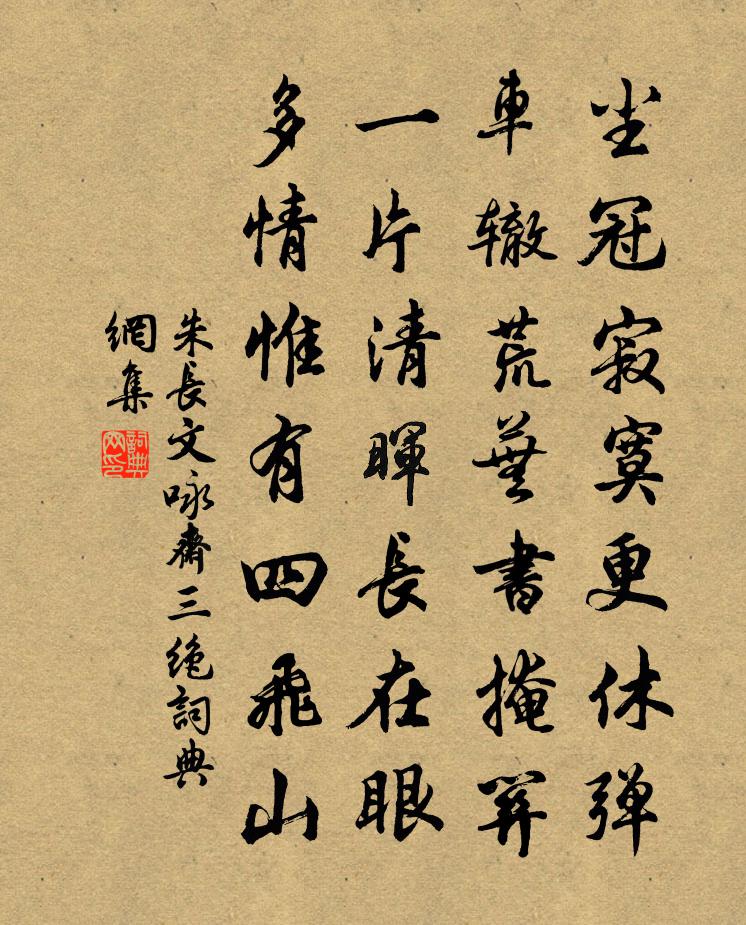 詩詞名句歷史字典書法欣賞書法字典國語詞典說文解字康熙字典古漢語字典標 題 作 者 詩 句 詠齋三絕作者:朱長文 朝代:唐代詠齋三絕原文塵冠寂寞更休彈,車轍荒蕪書掩關。一片清暉長在眼,多情惟有四飛山。詩詞問答問:詠齋三絕的作者是誰?答:朱長文問:詠齋三絕寫於哪個朝代?答:唐代朱長文詠齋三絕書法欣賞詠齋三絕書法作品詩詞推薦七月三日朱用和羅弘道同訪南山無竭師方回〔宋代〕振騎出喧闠,榜舟浮廣川。冠蓋二三子,謂我揚先鞭。翳翳杉漆塢,膴膴禾黍田。籬闖擁稚髻,擔觀駢旅肩。是日公齋四詠新竹皮日休〔唐代〕笠澤多異竹,移之植後楹。一架三百本,綠沈森冥冥。圓緊珊瑚節,釤利翡翠翎。儼若青帝仗,矗如紫姑屏。槭槭題博士袁公文苑像傅行簡〔宋代〕禽鳥春風樂與同,有將理趣道儒宗。兩朝褒賞衣冠舊,一德充融禮樂隆。天地無心馳電馬,人民有望慰雲龍。餘年大李曾伯〔宋代〕對劍花凝,笳葉卷,天宇塵清聲肅。樓船催解處,正日戈夕照,風旗西矗。虎戰龍爭,人非地是,形勢昔雄三國。水調歌頭程公許〔宋代〕駝褐倚禪榻,絲鬢揚茶煙。誰知老子方寸,歷歷著千年。試問汗青餘幾,一笑腰黃縈夢,我自樂天全。出處兩無累過寶應縣新開湖十首楊萬里〔宋代〕細雨初如弄隙塵,須臾化作舞空蚊。作團面旋還分散,只見輕煙與薄雲。龍蛻洞王宗賢〔宋代〕羽人游洞獲龍骸,知是鱗潛蛻骨來。岩穴嵌巉深數丈,驚人蛇虺隔凡才。木蘭花慢 別西湖兩詩僧盧祖皋〔宋代〕嫩寒催客棹,載酒去、載詩歸。正紅葉漫山,清泉漱石,多少心期。三生溪橋話別,悵薜蘿、猶惹翠雲衣。不似今對月六首白玉蟾〔宋代〕水澄熊白成壺酒,楓染猩紅滿路旗。坐待西風迎素月,青天笑我獨詩痴。奉酬襲美先輩初夏見寄次韻陸龜蒙〔唐代〕積雨晦皋圃,門前煙水平。蘋蘅增遙吹,枕席分余清。村旆詫酒美,賒來滿鋞程。未必減宣子,何羨謝公榮。借宅聽雪軒王冕〔元代〕飛來便與雨聲別,坐久甚憂天下寒。清極自然梅有韻,夜闌卻喜竹平安。洛陽處士門深閉,剡曲先生琴不彈。想在送曹稅李鹹用〔唐代〕摻袂向春風,何時約再逢。若教相見密,肯恨別離重。芳草漁家路,殘陽水寺鐘。落帆當此處,吟興不應慵。春盡蘇轍〔宋代〕春風過盡百花空,燕坐笙蕭起滅中。樹影連天開翠幕,鳥聲入耳當歌童。楞嚴十卷幾回讀,法酒三升是客同。試問次周益公韻樓鑰〔宋代〕別駕歸來自贛川,相迎方嘆別經年。為言相國珠璣語,寄問祠庭山澤仙。妙句聳觀親盥手,滿城爭玩日駢肩。退憐即事李流謙〔宋代〕雪巘雲林共莽然,世間那有此江天。曉檣攙日何時到,夜柁鳴風幾夕眠。閒卜家書燈似粟,略開旅抱酒如泉。輕鷗次韻張鵬飛三絕方回〔宋代〕舐犢區區笑老牛,阿瞞焉恤一楊彪。英雄誤理大床話,賣藥惟應學伯休。嘆庭前甘菊花杜甫〔唐代〕庭前甘菊移時晚,青蕊重陽不堪摘。明日蕭條醉盡醒,殘花爛熳開何益?籬邊野外多眾芳,採擷細瑣升中堂。念茲曲肱詩二十首白玉蟾〔宋代〕五雷深鎖玉清宮,白鶴呼風唳碧空。說著這般辛苦處,三千玉女蹙眉峰。贈孤峰長老戴復古〔宋代〕孤峰何處在住,惠遠舊林泉。日用無非道,心安即是禪。幽棲雲壑底,夢寐雪蓬邊。何日山 * ,同尋訪戴船。板黃釋紹曇〔宋代〕良工採得木千章,如析旃檀片片香。黃面瞿曇承蓋覆,拋磚打瓦又何妨。名句推薦落葉滿空山,何處尋行跡。韋應物《寄全椒山中道士》 北極懷明主,南溟作逐臣。宋之問《途中寒食題黃梅臨江驛寄崔融》 故國雖大,好戰必亡;天下雖安,忘戰必危。姜子牙《司馬法·仁本》 食其食者不毀其器,食其實者不折其枝劉安及其門客《淮南子·說林訓》 駐馬橋西,還系舊時芳樹。高觀國《玲瓏四犯·水外輕陰》 常人安於故習,學者溺於所聞。商鞅《商君書·更法》 淇則有岸,隰則有泮。佚名《氓》 風回雲斷雨初晴,返照湖邊暖復明。白居易《南湖早春》 智者不危眾以舉事,仁者不違義以要功。范曄《後漢書·列傳·竇融列傳》 青青河畔草,綿綿思遠道。佚名《飲馬長城窟行》
