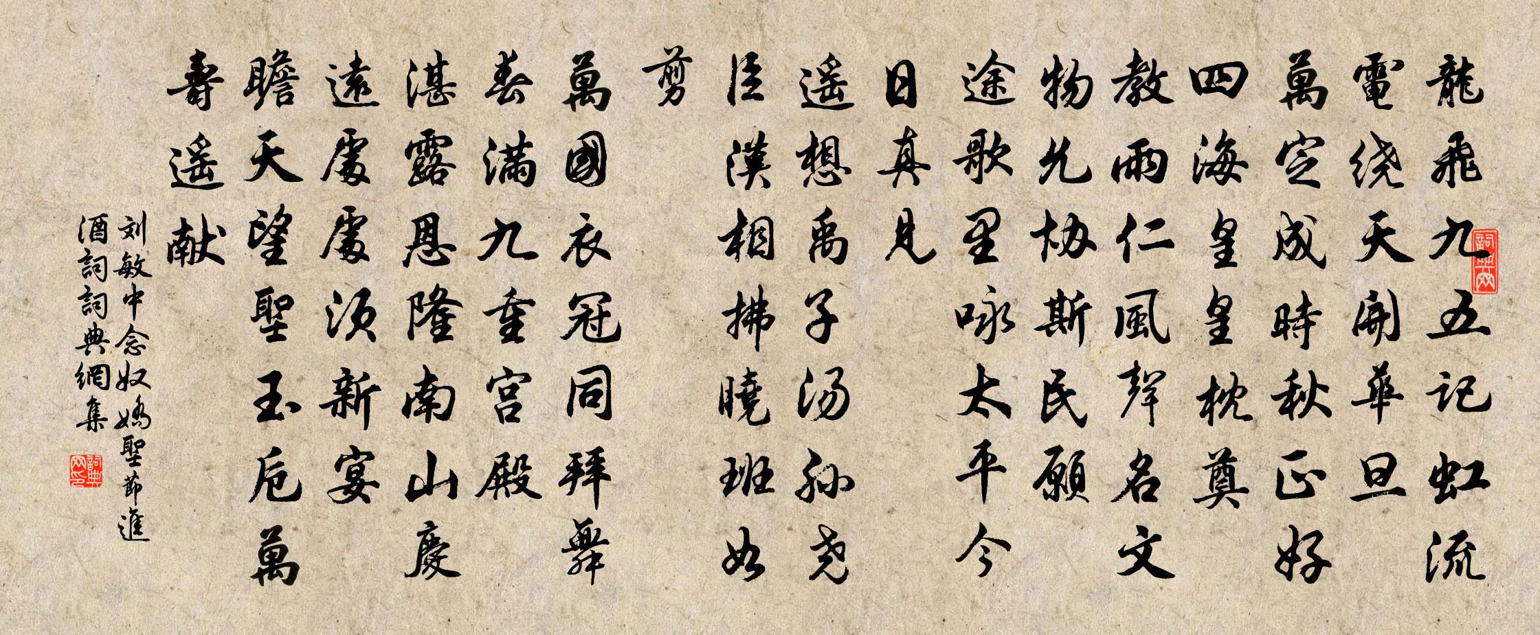詩詞名句歷史字典書法欣賞書法字典國語詞典說文解字康熙字典古漢語字典標 題 作 者 詩 句 念奴嬌 聖節進酒詞作者:劉敏中 朝代:元代念奴嬌 聖節進酒詞原文龍飛九五,記虹流電繞,天開華旦。萬定成時秋正好,四海皇皇枕奠。教雨仁風,聲名文物,允協斯民願。途歌里詠,太平今日真見。遙想禹子湯孫,堯臣漢相,拂曉班如剪。萬國衣冠同拜舞,春滿九重宮殿。湛露恩隆,南山慶遠,處處須新宴。瞻天望聖,玉卮萬壽遙獻。詩詞問答問:念奴嬌 聖節進酒詞的作者是誰?答:劉敏中問:念奴嬌 聖節進酒詞寫於哪個朝代?答:元代問:念奴嬌 聖節進酒詞是什麼體裁?答:詞劉敏中念奴嬌 聖節進酒詞書法欣賞念奴嬌 聖節進酒詞書法作品詩詞推薦大人生朝代諸兒五首以春風花草香為韻項安世〔宋代〕何物堪為壽,巢龜碧玉筒。龍洲多藕葉,上蔡足蕭業。日月供呼吸,乾坤共始終。年年冰凍解,綠髮戲春風。首春逢耕者柳宗元〔唐代〕南楚春候早,余寒已滋榮。土膏釋原野,白蟄競所營。綴景未及郊,穡人先偶耕。園林幽鳥囀,渚澤新泉清。農事杭州北郭戴氏荷池送侯愉崔國輔〔唐代〕秋近萬物肅,況當臨水時。折花贈歸客,離緒斷荷絲。誰謂江國永,故人感在茲。道存過北郭,情極望東菑。喬木詠史詩霸陵胡曾〔唐代〕原頭日落雪邊雲,猶放韓盧逐兔群。況是四方無事日,霸陵誰識舊將軍?奉贈王中允維杜甫〔唐代〕中允聲名久,如今契闊深。共傳收庾信,不比得陳琳。一病緣明主,三年獨此心。窮愁應有作,試誦白頭吟。梁三朝雅樂歌 需雅 五沈約〔南北朝〕擊鐘以俟惟大國,況乃御天流至德。侑食斯舉揚盛則,其禮不諐儀不忒。風猷所被深且塞。【中呂】普天樂_吳門客中九任昱〔元代〕吳門客中九秋天,三吳地,江空寒早,天遠書遲。 * 開,丹楓墜。流水行雲無拘系,好光陰枉自驅馳。塵心自洗偈頌七十六首釋師範〔宋代〕五月端午節,底事不須說。百怪盡潛蹤,群魔俱殄滅。大衍易吟四十首方回〔宋代〕屯初康險難,蒙上覺昏童。開闢乾坤後,君師大有功。諸子喻山水先秦諸子〔先秦〕子曰:“譬如為山,未成一簣,止,吾止也;譬如平地,雖覆一簣,進,吾往也。 《論語·子罕》 上不天則冬日雜興六首張耒〔宋代〕擊柝山城閉,疏燈野店扃。疾風鳴夜谷,晴水動浮星。霜翼歸何晚,鄰機織未停。短歌時自和,愁絕更誰聽。訴衷情劉秉忠〔元代〕山河縈帶九州橫。深谷幾為陵。千年萬年興廢,花月洛陽城。圖富貴,論功名。我無能。一壺春酒,數首新詩,實聞梅李處權〔宋代〕岩寺報梅開,可是知時節。映竹已蕭疏,臨流復清絕。正須幽士賞,莫縱狂僧折。山寒雲霧深,日暮更飛雪。會同年共樂台黃公度〔宋代〕蘭省三千士,莆陽十五人。此時鄉曲會,異日廟堂身。名塞乾坤隘,恩沾雨露新。天邊三雁遠,回首獨凝神。初入蘆山三首蘇軾〔宋代〕芒鞋青竹杖,自掛百錢游。可怪深山裡,人人識故侯。錦城方天瑞玄英先生後人得白雲山居圖仿佛桐仇遠〔宋代〕翼翼山千朵,蕭蕭屋數間。石崖不可度,門徑幾曾關。綠樹經秋在,白雲終日閒。依稀鏡湖曲,西島水迴環。四塊玉·閒適其四關漢卿〔元代〕南畝耕,東山臥。世態人情經歷多。閒將往事思量過,賢的是他,愚的是我,爭什麼!璩授京兆府參軍戲書以示兼呈獨孤郎權德輿〔唐代〕見爾府中趨,初官足慰吾。老牛還舐犢,凡鳥亦將雛。喜至翻成感,痴來或欲殊。因慚玉潤客,應笑此非夫。訪子虛不遇一首王阮〔宋代〕曉入千山與萬山,白雲深處款幽關。仙翁不許凡人識,走出紅塵不肯還。李思訓畫長江絕島圖蘇軾〔宋代〕山蒼蒼,江茫茫,大孤小孤江中央。崖崩路絕猿鳥去,惟有喬木攙天長。客舟何處來,棹歌中流聲抑揚。沙平風軟名句推薦透內閣香風陣陣,掩重門暮雨紛紛。王實甫《十二月過堯民歌·別情》 桂棹兮蘭枻,斵冰兮積雪;屈原《九歌》 搜句忌於顛倒,裁章貴於順序劉勰《文心雕龍·章句》 天涯海角悲涼地,記得當年全盛時。趙鼎《鷓鴣天·建康上元作》 丈夫一言許人,千金不易。司馬光《資治通鑑·唐紀二》 採得百花成蜜後,為誰辛苦為誰甜。羅隱《蜂》 鴻雁不堪愁里聽,雲山況是客中過。李頎《送魏萬之京》 東風灑雨露,會入天地春。李白《送郄昂謫巴中》 萬種思量,多方開解,只恁寂寞厭厭地。柳永《憶帝京·薄衾小枕涼天氣》 醉別復幾日,登臨遍池台。李白《魯郡東石門送杜二甫》