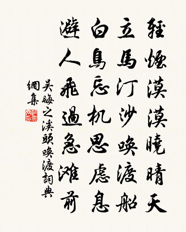 詩詞名句歷史字典書法欣賞書法字典國語詞典說文解字康熙字典古漢語字典標 題 作 者 詩 句 溪頭喚渡作者:吳晦之 朝代:宋代溪頭喚渡原文輕煙漠漠曉晴天,立馬汀沙喚渡船。白鳥忘機思慮息,避人飛過急灘前。詩詞問答問:溪頭喚渡的作者是誰?答:吳晦之問:溪頭喚渡寫於哪個朝代?答:宋代吳晦之溪頭喚渡書法欣賞溪頭喚渡書法作品詩詞推薦浣溪沙(至日帶湖)韓淲〔宋代〕愛日回春一線長。氛氳誰憶御爐香。孤城歲晚臥滄江。花底千官迎淑氣,湖陰十里寫晴光。剩拼華發醉為鄉。頌古三十三首釋師觀〔宋代〕要個無禪底國師,才涉毫芒便取誅。堪笑這僧垂手處,道無便見有偏枯。對紅香梅舒岳祥〔宋代〕雪裡紅梅樹,尊前白髮翁。莫求顏色似,風致許渠同。減字木蘭花(簡天牖)吳則禮〔宋代〕九年離別。夢裡相逢端怕說。攜手河梁。雁噭淮天如許長。鱸魚正美。白髮季鷹聊啟齒。後夜江乾。與把梅花子細示道光及安大師王安石〔宋代〕春日載陽,陟彼高岡。樂彼之園,維水泱泱。維筍及蒲,既生既育。拚飛維鳥,集於灌木。嚶其鳴矣,亂我世曲。夏夜韓偓〔唐代〕猛風飄電黑雲生,霎霎高林簇雨聲。夜久雨休風又定,斷雲流月卻斜明。黃致政輓詩二首王炎〔宋代〕祿養更迎侍,消搖介壽康。壯圖雖偃屈,潛德竟輝光。可惜今埋玉,無由自奠觴。他年觀上冢,千騎擁龍岡。虞美人 用李後主韻二首劉辰翁〔宋代〕梅梢臘盡春歸了。畢竟春寒少。亂山殘燭雪和風。猶勝陰山海上、窖群中。年光老去才情在。惟有華風改。醉中幸謝章季思惠鏡屏王遂〔宋代〕客從東南西,遺我古鏡屏。圓明絕點滓,表裹無遁形。雲是舊太守,思之我為銘。吾惛不能進,何敢陳諸庭。我聞和宋文淵送仲明舉西歸三首郭印〔宋代〕丈夫志萬里,耿耿抱長慮。青雲卻倦飛,功業何由樹。廟堂有先達,體國心焦勞。歸來掩關臥,茅檐日色高。次秦少游韻贈姚安世蘇軾〔宋代〕帝城如海欲尋難,肯舍漁舟到杏壇。剝啄扣君容膝戶,巍峨笑我切雲冠。問羊獨怪初平在,牧豕應同德曜看。肯把送周魯日辰州法曹陳傅良〔宋代〕團欒妻子是誰家,獨被飢驅天一涯。遠地豈無人晤語,長才能免世驚嗟。好於書作千年計,勿為官驅兩鬢華。為問於忽操王令〔宋代〕於忽乎,不可以為,其又奚為。椽櫨桷榱之累重,顧柱小之柰何。方風雨之晦陰,行者艱而莫休,居者坐以笑歌。威儀辭原妙〔元代〕山中坐。靜看落花墮。問何為,待結團*果。念奴嬌吳琚〔宋代〕我來浮玉,似憑陵滄海,躡金鰲背。又若騎鯨游汗漫,飛入八荒之外。鐘鼓傳聲,樓台倒影,不類人間世。徘徊吟荷花楊時〔宋代〕照眼紅雲斗晚霞,重重青蓋半傾斜。會須直跨三千仞,移取峰頭十丈花。金縷曲顧貞觀〔清代〕我亦飄零久!十年來,深恩負盡,死生師友。宿昔齊名非忝竊,只看杜陵窮瘦,曾不減,夜郎孱愁,薄命長辭知已贈何中立郭從周〔宋代〕三字從來月正圓,一麾從此出秦關。錢塘春色濃如酒,貪醉花間臥不還。顧況讀書堆郭岩〔宋代〕昔人何處讀書聲,此地猶存舊日名。衰草閉門黃葉冷,香林藏硤碧雲橫。地連檇李山河壯,江繞吳淞日夜鳴。陳跡暮秋書齊述懷寄守能師釋智圓〔宋代〕杜門無俗交,塵事任浩浩。空齋學佛外,六經恣論討。仁義志不移,貧病誰相惱。天命唯我樂,百神非吾禱。為文名句推薦花果山福地,水簾洞洞天。吳承恩《西遊記·第一回》 聖人之道,為而不爭。老子《老子·德經·第八十一章》 低花樹映小妝樓,春入眉心兩點愁。白居易《春詞》 行吟坐嘯獨悲秋,海霧江雲引暮愁。陳子龍《秋日雜感(十首選一)》 別夢依依到謝家,小廊回合曲闌斜。張泌《寄人》 去年今日臥燕台,銅鼓中宵隱地雷王守仁《元夕二首》 目妄視則淫,耳妄聽則惑,口妄言則亂。劉安及其門客《淮南子·主術訓》 不明察,不能燭私。韓非及後人《韓非子·孤憤》 多情卻被無情惱,今夜還如昨夜長。元好問《鷓鴣天·候館燈昏雨送涼》 有三秋桂子,十里荷花。柳永《望海潮·東南形勝》