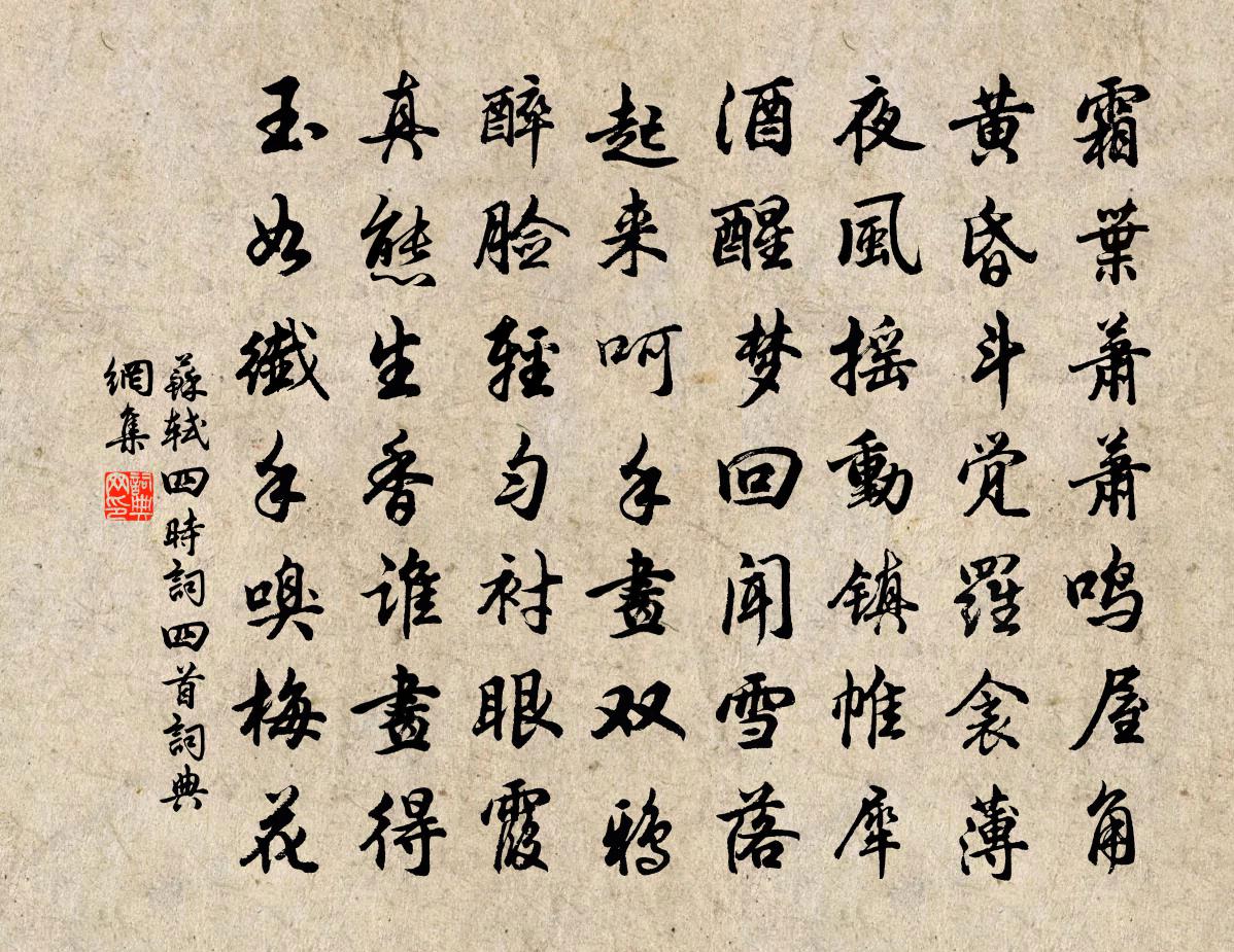霜葉蕭蕭鳴屋角,黃昏斗覺羅衾薄。夜風搖動鎮帷犀,酒醒夢回聞雪落。