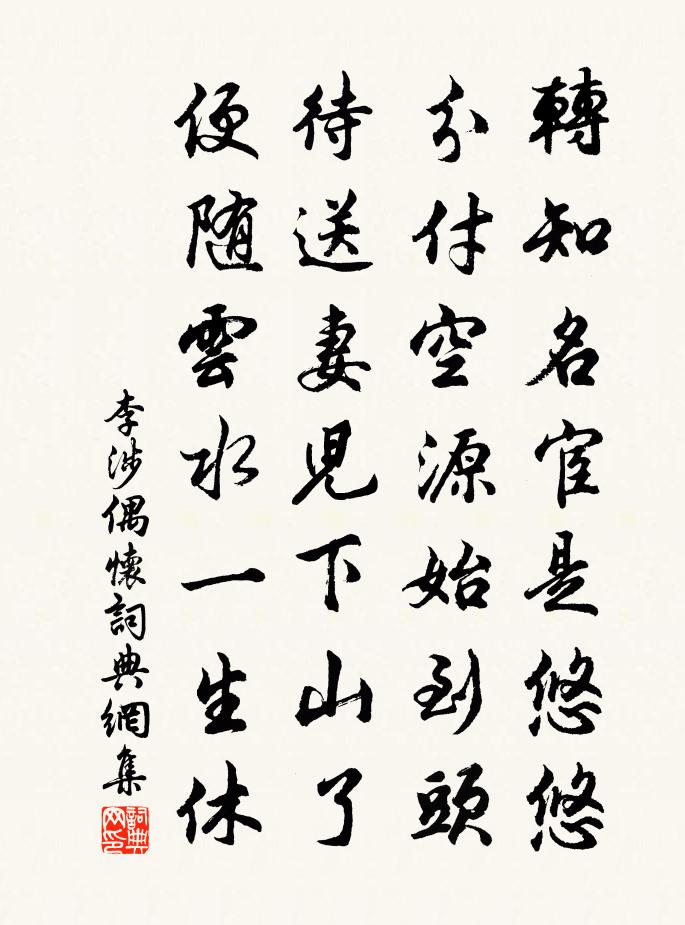 詩詞名句歷史字典書法欣賞書法字典國語詞典說文解字康熙字典古漢語字典標 題 作 者 詩 句 偶懷作者:李涉 朝代:唐代偶懷原文轉知名宦是悠悠,分付空源始到頭。待送妻兒下山了,便隨雲水一生休。詩詞問答問:偶懷的作者是誰?答:李涉問:偶懷寫於哪個朝代?答:唐代問:偶懷是什麼體裁?答:七絕李涉偶懷書法欣賞偶懷書法作品注釋全唐詩:卷477-61詩詞推薦詠塵林泳〔宋代〕野馬相吹生不盡,海犀能辟語成空。高埋旗鼓無邊黑,暗染衣冠日下紅。寧可濯纓歌濁水,莫教舉扇障西風。渾無宿虹縣驛張耒〔宋代〕長堤隘舟車,上下無暫歇。煎熬古驛門,聒聒爭瑣屑。東南淮浙富,輸饋日填咽。楚風習喧卑,吳舌動嘲哳。平生句晃詠之〔宋代〕當時雞犬皆霄漢,自是劉郎不得仙。傷心有恨關存歿,袖手無人問姓名。旌旗太一三山外,車馬長楊五柞中。喚得病起聞說貪山頗有泉石遠不能游王令〔宋代〕一病百志墮,起逢秋物闌。力弱未勝行,厭聞客言山。言山多在遠,雖近尚莫攀。拏深吾無舟,逐陸誰借鞍。不如寄吳山人釋法輝〔宋代〕夜召山翁酌,花間聊撫琴。酒香來竹外,古意入雲深。月色臨諸水,溪光射遠岑。擬教塵土客,對此滌煩襟。相如二首陳造〔宋代〕中宵卒卒去臨邛,賣酒壚邊混僦傭。想見令君醒後意,向人深悔謬為恭。田居四首秦觀〔宋代〕嚴冬百草枯,鄰曲富休暇。土井時一汲,柴車久停駕。寥寥場圃空,跕跕烏鳶下。孤榜傍橫塘,喧舂起旁舍。田家戲贈乾越尼子歌劉長卿〔唐代〕鄱陽女子年十五,家本秦人今在楚。厭向春江空浣沙,龍宮落髮披袈裟。五年持戒長一食,至今猶自顏如花。亭亭竹里桃花白玉蟾〔宋代〕風吹雨洗玉猗猗,雲捲霞舒錦陸離。竹夾桃花花映竹,雅如翠障繡西施。新市雜詠十首華岳〔宋代〕青衫搵淚向人啼,妾本秦樓浪子妻。流落南州歸不得,青樓今在畫橋西。賞海棠姜特立〔宋代〕海棠初破萼,紅艷欲無春。小插依霜鬢。花應恕老人。對酒白居易〔唐代〕未濟卦中休卜命,參同契里莫勞心。無如飲此銷愁物,一餉愁消直萬金。已亥雜詩 307龔自珍〔清代〕從此青山共露車,斷無隻夢墮天涯。黃梅淡冶山礬靚,猶及雙清好到家。覆巢行孟郊〔唐代〕荒城古木枝多枯,飛禽嗷嗷朝哺雛。枝傾巢覆雛墜地,烏鳶下啄更相呼。陽和發生均孕育,鳥獸有情知不足。枝危挽妹婿汪汻四首許月卿〔宋代〕奉禮徒員外,京師枉治中。二郎槐不做,四老橘成空。三鳳壁岩子,雙龍寶劍雄。萬人真莫贖,愁絕老坡翁。賀新郎(詠梅用甄龍友韻)洪咨夔〔宋代〕放了孤山鶴。向西湖、問訊水邊,嫩寒籬落。試粉盈盈微見面,一點芳心先著。正日暮、煙輕雲薄。欲攪清香和月摸魚兒莫崙〔宋代〕聽春教、燕顰鶯訴。朝朝花困風雨。六橋忘卻清明後,碧盡柳絲千縷。蜂蝶侶。正閒覓閒花,閒草閒歌舞。最憐西葉少保輓詞六首韓元吉〔宋代〕奧學余家法,宏村邁古風。剸煩樽俎上,禦侮笑談中。勳業中興殿,規模大駕營。哀聞父老泣,遺愛六州同。觀海林一龍〔宋代〕昔者吾夫子,浮海思乘桴。彼美魯仲連,蹈海恥帝呼。寥寥千載間,此意霜月孤。而我欲涉海,夫豈夫子徒。長風哭陳陶張喬〔唐代〕先生抱衰疾,不起茂陵間。夕臨諸孤少,荒居弔客還。遺文禪東嶽,留語葬鄉山。多雨銘旌故,殘燈素帳閒。樂章名句推薦相思處、青年如夢,乘鸞仙闕。文天祥《滿江紅·和王夫人滿江紅韻以庶幾後山妾薄命之意》 日夕涼風至,聞蟬但益悲。孟浩然《秦中感秋寄遠上人 / 秦中寄遠上人》 燕歸花謝,早因循、又過清明。納蘭性德《紅窗月·燕歸花謝》 世治不輕,世亂不沮;同弗與,異弗非也。戴聖《禮記·儒行》 夫孝,百行之冠,眾善之始也。范曄《後漢書·列傳·劉趙淳于江劉周趙列傳》 年年戰骨埋荒外,空見蒲桃入漢家。李頎《古從軍行》 春風不解禁楊花,蒙蒙亂撲行人面。晏殊《踏莎行·小徑紅稀》 算翠屏應是,兩眉餘恨倚黃昏。孔夷《南浦·旅懷》 舉頭紅日白雲低,四海五湖皆一望。唐寅《伯虎扮乞兒,作詩騙酒》 望處雨收雲斷,憑闌悄悄,目送秋光。柳永《玉蝴蝶·望處雨收雲斷》