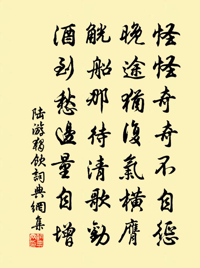 詩詞名句歷史字典書法欣賞書法字典國語詞典說文解字康熙字典古漢語字典標 題 作 者 詩 句 獨飲作者:陸游 朝代:宋代獨飲原文怪怪奇奇不自懲,晚途猶復氣橫膺。觥船那待清歌勸,酒到愁邊量自增。詩詞問答問:獨飲的作者是誰?答:陸游問:獨飲寫於哪個朝代?答:宋代問:陸游的名句有哪些?答:陸游名句大全陸游獨飲書法欣賞獨飲書法作品詩詞推薦東潭宴餞河南趙少府盧綸〔唐代〕十載奉戎軒,日聞君子言。方將賀榮爵,遽乃愴離尊。岸轉台閣麗,潭清弦管繁。松篁難晦節,雨露不私恩。坐使春晚村居陸游〔宋代〕一事元無可得忙?悠然半醉倚胡床。牡丹枝上青春老,燕子聲中白日長。身世已如風六鷁,文章仍似閏黃楊。太平次韻葉茵〔宋代〕時清嘆陸沈,楚澤伴漁吟。探索聖賢語,發明天地心。無機棋少著,有趣樹多陰。坐上皆知已,賡酬夜向深。和提刑郎中閱兵之什文同〔宋代〕曉營金革列周遭,大纛長牙擁帳高。虎豹用韜傳妙略,龍蛇供陣役群豪。言初撫處如蕭纊,恩盡均時若楚醪。敢謂思不見曹鄴〔唐代〕但見出門蹤,不見入門跡。卻笑山頭女,無端化為石。偈頌一百四十一首釋師範〔宋代〕朝碌碌,暮悠悠。非懈怠,非精修。華亭船子,北地趙州。溪庵十首劉克莊〔宋代〕村深保社雜樵漁,歲晚溪翁此卜居。門下諸生皆去矣,塚旁二客定誰歟。即今不惜頻投轄,他日毋煩更下車。卻笑黑白何咎釋智愚〔宋代〕世事亂如麻,情人未到家。連延深院雨,滴碎後庭花。舊話幾時別,音書未有涯。暝煙將四合,何處起胡笳。先天易吟三十首方回〔宋代〕子半至午半,南方旋北方。往來分逆順,治亂判陰陽。舟中坐讀鳶飛魚躍王遂〔宋代〕欲晦又明天外山,水邊鷗鳥去復還。流行儘是鬼神跡,妙處不在鳶鳥間。梅陳元晉〔宋代〕吾敬林隱君,終老梅花鄉。孤山足佳處,不願白玉堂。古來貧賤交,富貴渠相忘。歲寒誰古心,搖搖桃李場。罾魚孔武仲〔宋代〕野色星輝半有無,曲江舟子夜罾魚。紅鱗躍網無錢買,惆悵天涯尺素書。待青城道人不至陸游〔宋代〕我亦從來薄世緣,偶然採藥到西川。慵追萬里騎鯨客,且伴千年化鶴僊。金鼎養丹暾海日,玉壺取酒醉江天。朝來太常引劉燕歌〔元代〕故人別我出陽關,無計鎖雕鞍。今古別離難,蹙損了蛾眉遠山。一尊別酒,一聲杜宇,寂寞又春殘。明月小樓間,和運司園亭水閣孫甫〔宋代〕小閣聯雪峰,憑欄憙幽玩。紅接海棠洲,綠對篔簹岸。有時開罇罍,波影侵几案。何須架長虹,然後沖霄漢。雜詠一百首墨翟劉克莊〔宋代〕墨子城無恙,公輸械有窮。要須能壁立,未可恃梯攻。寫梅楊公遠〔宋代〕為渠模寫未為難,只要稀疎不要繁。雪月風煙俱屬我,一時收拾付毫端。小孤山傅文翁〔宋代〕灩澦拓瞿塘,二孤障瀾蠡。大哉神禹功,天地相終始。次張學錄韻十首陳造〔宋代〕廣文無酒錢,到官倏改火。清譚坐蕭齋,惟子屢過我。投老高翥〔宋代〕投老才營一把茅,前臨官路後林坳。最宜雞犬無鄰舍,好放牛羊有近郊。春韭采來勝市食,秋鱸留取續山餚。吾廬名句推薦父母在,不遠遊,遊必有方。孔子弟子《論語·里仁篇》 楊柳風柔,海棠月淡,獨自倚闌時。薩都剌《小闌乾·去年人在鳳凰池》 有熊有羆,有貓有虎,慶既令居,韓姞燕譽。佚名《韓奕》 鵝湖山下稻粱肥,豚柵雞棲半掩扉。王駕《社日》 一觴雖獨盡,杯盡壺自傾。陶淵明《飲酒·其四》 親戚或余悲,他人亦已歌。陶淵明《擬輓歌辭三首》 夢回芳草思依依,天遠雁聲稀。李煜《喜遷鶯·曉月墜》 別夢依依到謝家,小廊回合曲闌斜。張泌《寄人》 悵望千秋一灑淚,蕭條異代不同時。杜甫《詠懷古蹟五首·其二》 君子內省不疚,無惡於志。君子之所不可及者,其唯人之所不見乎。子思《中庸·第三十三章》