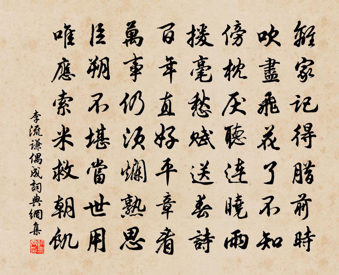 詩詞名句歷史字典書法欣賞書法字典國語詞典說文解字康熙字典古漢語字典標 題 作 者 詩 句 偶成作者:李流謙 朝代:宋代偶成原文離家記得臘前時,吹盡飛花了不知。傍枕厭聽連曉雨,援毫愁賦送春詩。百年直好平章看,萬事仍須爛熟思。臣朔不堪當世用,唯應索米救朝飢。詩詞問答問:偶成的作者是誰?答:李流謙問:偶成寫於哪個朝代?答:宋代李流謙偶成書法欣賞偶成書法作品詩詞推薦隆興書堂自警三十五首陳淳〔宋代〕茫茫八極內,何莫非斯人。苟非富道義,何異彼黔民。風入松王吉昌〔元代〕乾坤兩卦上天梯。分柔健高低。六關爻變推天道,斡璇璣、日月東西。妙采精華成液,通神息,飲刀圭。溶溶金水詠史下謝安陳普〔宋代〕臨安猿鶴共清吟,猶作投機叩齒音。商鞅禹文無辨別,冶城數語是何心。游景德王炎〔宋代〕老怯鶯花笑,春殘一出遊。城隅尋古寺,柳下系扁舟。身健聊乘興,心閒不著愁。支郎能款語,清坐小遲留。水調歌頭(為張敬夫直閣壽)侯置〔宋代〕天地孕沖氣,霜雪實嘉平。粹然經世材具,應為聖時生。妙處為仁受用。顛倒縱橫無壅。一笑泮春冰。袖手無一語次韻鄭逢辰直閣遷新居趙彥端〔宋代〕生當帶索守林廬,不合輕拋種樹書。賀燕得公真是樂,弊貂將我竟何如。殊鄉更覺鄰為貴,晚歲深期燭有餘。上下泊上虞驛來日行四首陳造〔宋代〕溪山可圖畫,風物憶吾鄉。漁艇鷗鶩亂,茅茨菱芡香。疏梅二首張耒〔宋代〕疏梅落寒晴,高柳暗春夕。低星上蒼寒,遠鍾韻澄寂。頗私朝市間,更得闤闠僻。且復罷經過,深泥濺馬臆。別李參軍張喬〔唐代〕王孫游不遇,況我五湖人。野店難投宿,漁家獨問津。嶺分中夜月,江隔兩鄉春。靜想 * ,還應寄此身。曲江林寬〔唐代〕曲江初碧草初青,萬轂千蹄匝岸行。傾國妖姬雲鬢重,薄徒公子雪衫輕。瓊鐫狒犭術繞觥舞,金蹙辟邪拏撥鳴。柳呼沱河范成大〔宋代〕聞道河神解造冰,曾扶陽九見中興。如今爛被胡膻涴,不似滄浪可濯纓。奉和御製左丞相說右丞相璟太子少傅乾曜同日上官…賜詩裴光庭〔唐代〕樂賢聞往誥,褒德偶茲辰。端揆升元老,師謀擇累仁。紫庭崇讓畢,粉署禮容陳。既荷恩榮舊,俱承寵命新。天文寄汶上梅堯臣〔宋代〕大第未嘗身一至,人猜巧宦我應非。彈冠不讀先賢傳,說劍休更短後衣。瘦馬青袍三十載,故人朱轂幾多違。功名秋夕懷趙師秀徐璣〔宋代〕冷落生愁思,衰懷得句稀。如何秋夜雨,不念故人歸。蛩響砌尤靜,雲疏月尚微。惟憐籬下菊,漸漸可相依。稻飯陸游〔宋代〕買得烏犍遇歲穰,此身永免屬官倉。塘南塘北九千頃,八月村村稻飯香。梅花徐介軒〔宋代〕香梅爛漫見紅梅,白白朱朱取次開。料得故園春色滿,有人花下正徘徊。家兄孟修父輸賦南還虞集〔元代〕大兄五月來作客,八年不見頭總白。五人兄弟四人在,每憶中郎淚沾臆。我家蜀西忠孝門,無田無宅惟花存。兄雖劉後溪和雁湖即事詩十絕見示次韻洪咨夔〔宋代〕斷煙落日護林丘,三數人家屋打頭。見說春來寒更甚,補窗塞戶勝防秋。武德殿朝退望九衢春色曹松〔唐代〕玉殿朝初退,天街一看春。南山初過雨,北闕淨無塵。夾道夭桃滿,連溝御柳新。蘇舒同舜澤,煦嫗並堯仁。佳氣游禪寂寺訪隱居杜耒〔宋代〕官閒仍暇日,乘興共尋芳。久雨山蹊潤,新晴花氣香。春偏藏古寺,水漸滿閒塘。忽有隱居者,留人看海棠。名句推薦行路難!行路難!多歧路,今安在?李白《行路難三首》 愛而知其惡,憎而知其善。戴聖《禮記·曲禮上》 法之不行,自於貴戚。司馬遷《史記·秦本紀》 歲暮陰陽催短景,天涯霜雪霽寒宵。杜甫《閣夜》 明朝事與孤煙冷,做滿湖、風雨愁人。吳文英《渡江雲三犯·西湖清明》 懸衡而知平,設規而知圓。韓非及後人《韓非子·飾邪》 南朝千古傷心事,猶唱後庭花。吳激《人月圓·南朝千古傷心事》 露從今夜白,月是故鄉明。杜甫《月夜憶舍弟》 天意憐幽草,人間重晚晴。李商隱《晚晴》 事有所出,功有所止。劉向《戰國策·趙二·武靈王平晝閒居》