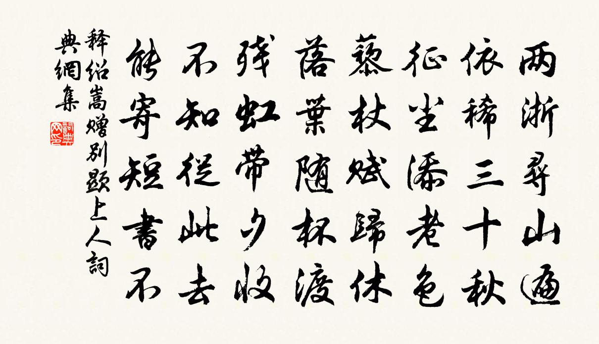 詩詞名句歷史字典書法欣賞書法字典國語詞典說文解字康熙字典古漢語字典標 題 作 者 詩 句 贈別顯上人作者:釋紹嵩 朝代:宋代贈別顯上人原文兩浙尋山遍,依稀三十秋。征塵添老色,藜杖賦歸休。落葉隨杯渡,殘虹帶夕收。不知從此去,能寄短書不。詩詞問答問:贈別顯上人的作者是誰?答:釋紹嵩問:贈別顯上人寫於哪個朝代?答:宋代釋紹嵩贈別顯上人書法欣賞贈別顯上人書法作品詩詞推薦隨州邢恕〔宋代〕荊楚西南地,清明咫尺天。遠山猶帶雪,高柳已藏煙。自嘆三首文天祥〔宋代〕疾病連三次,形容落九分。幾成白宰相,誰識故將軍。暗坐羞紅日,閒眠想白雲。蒼蒼竟何意,未肯喪斯文。瑪瑙坡四詠釋智圓〔宋代〕瑪瑙坡前樹,春來亦著華。雨晴煙乍斂,濃艷斗朝霞。吳中即事釋斯植〔宋代〕世事交情淺,傷心獨倚欄。海雲經雨重,秦樹入秋殘。潮落吳天遠,風生夢澤寒。英雄千古地,回首是長安。和三兄游湖韓維〔宋代〕竹陰回抱柳陰敷,石色青青潤不枯。暫到已經風力勁,更清須待月輪孤。波涵天影迷高下,雲覆山光變有無。暑退次韻梅山弟醉吟七首陳著〔宋代〕隱處是甪里先生,放游是司馬子長。試問梅山老居士,判斷兩家誰最香。浪淘沙李振祖〔宋代〕春在畫橋西。畫舫輕移。粉香何處度漣漪。認得一船楊柳外,簾影垂垂。誰倚碧闌低。酒暈雙眉。鴛鴦並浴燕交飛滿庭芳(梅)佚名〔宋代〕東閣官梅,玉欄朱檻,未如山館疏籬。水邊竹外,斜出兩三枝。最好西湖月下,林處士、著意吟時。何須說,揚州題九歌圖章甫〔宋代〕大夫放逐沅湘濱,嘗作九歌祠鬼神。鬼神幽遠不可見,餚酒芬芳猶福人。餐菊佩蘭君不識,從彼讒人為鬼蜮。楚江頌古三十六首釋惟一〔宋代〕不堪提掇死貓頭,日炙風吹臭未休。底事罕逢人著價,只緣貴重世無儔。如夢令·點滴空階疏雨王國維〔清代〕點滴空階疏雨。迢遞嚴城更鼓。睡淺夢初成,又被東風吹去。無據。無據。斜漢垂垂欲曙。秦樓月(和張文伯雪)王之道〔宋代〕雲不捲。澆愁莫放金杯淺。金杯淺。新詞麗句,要人裁翦。酒酣思致天同遠。臨風捉筆綸巾岸。綸巾岸。詩成歸去送人及第歸海東張喬〔唐代〕東風日邊起,草木一時春。自笑中華路,年年送遠人。鄧州西軒書事十首陳與義〔宋代〕莫嫌啖蔗佳境遠,橄欖甜苦亦相併。都將壯節供辛苦,準擬殘年看太平。和微之詩二十三首和朝回與王鍊師游南山下白居易〔唐代〕藹藹春景餘,峨峨夏雲初。躞蹀退朝騎,飄颻隨風裾。晨從四丞相,入拜白玉除。暮與一道士,出尋青溪居。吏隱明發陳公徑過摩舍那灘石峰下十首楊萬里〔宋代〕地迥人絕影,山僻虎留跡。下有無底潭,上有欲落石。是間一逕橫,來以萬松直。樹從何時有,陳公所手植。陳公題新庵壁間趙蕃〔宋代〕道人庭宇知何有,幾個修篁一樹梅。說似庵門莫深閉,斷無俗客此間來。仲春過龍舒法華山尋誦經道者舊庵釋正覺〔宋代〕支逕入窮谷,來尋道者庵。梵音今默默,華雨尚毿毿。夜白月半屋,寒青燈一龕。夢隨歌吹去,借路過江南。【十二月】 正月佚名〔元代〕年時節,元夜時,雲鬢插小桃枝。今年早,不見你,淚珠兒,滴滿了春衫袖兒。 二月 踏青去,二月時,則不小園陳宓〔宋代〕小園何事得佳名,環似莆溪一水清。帖帖飛鳶迷上下,翩翩遊艇探空明。杯盤白處松生影,衣袂涼時竹有聲。更約名句推薦孤客傷逝湍,徒旅苦奔峭。謝靈運《七里瀨》 綠葉兮素華,芳菲菲兮襲予;屈原《九歌》 不教而誅,則刑繁而邪不勝;教而不誅,則奸民不懲。荀子《荀子·富國》 春風知別苦,不遣柳條青。李白《勞勞亭》 拼將一死酬知己,致令千秋仰義名。羅貫中《三國演義·第五十回》 夸而有節,飾而不誣劉勰《文心雕龍·誇飾》 對酒當歌,人生幾何!曹操《短歌行》 誰知江上酒,還與故人傾。周紫芝《臨江仙·送光州曾使君》 一去二三里,煙村四五家。邵雍《山村詠懷》 胡未滅,鬢先秋。淚空流。陸游《訴衷情·當年萬里覓封侯》