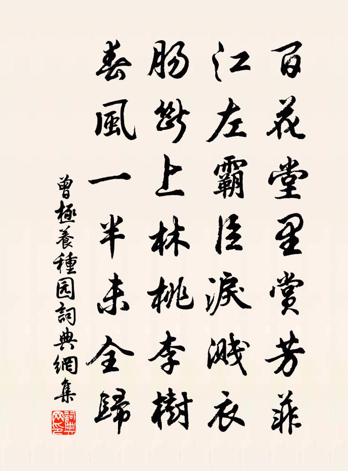詩詞名句歷史字典書法欣賞書法字典國語詞典說文解字康熙字典古漢語字典標 題 作 者 詩 句 養種園作者:曾極 朝代:宋代養種園原文百花堂里賞芳菲,江左霸臣淚濺衣。腸斷上林桃李樹,春風一半未全歸。詩詞問答問:養種園的作者是誰?答:曾極問:養種園寫於哪個朝代?答:宋代曾極養種園書法欣賞養種園書法作品詩詞推薦送鄭長源韋應物〔唐代〕少年一相見,飛轡河洛間。歡游不知罷,中路忽言還。泠泠鵾弦哀,悄悄冬夜閒。丈夫雖耿介,遠別多苦顏。君行賀新郎劉子寰〔宋代〕柱杖毛凌高絕。毛望千山隱毛隱,波瀾毛動搖天末。下有白雲平遠壑,湧起潮頭噴雪。浸絕島、孤峰出沒。赤縣神別施君叔異鄧肅〔宋代〕泮水儒生急寸祿,白袍乾人如立鵠。爭注蟲魚股置錐,世外語言不到目。我嫌人醉還啜醨,常嗟心跡兩相離。邂逅時魚徐璣〔宋代〕風晴霜氣合,沙渚夜鳴榔。獨喜鱗兼細,時看寸有長。月斜寒動影,水碧靜傅香。可愛漁翁樂,溪梅秋第芳。又和劉景文韻蘇軾〔宋代〕牡丹松檜一時栽,付與春風自在開。試問壁間題字客,幾人不為看花來。過洞庭二首孔武仲〔宋代〕杳杳湖天極目中,波光日暮兩陶溶。舟離廟步灣環水,帆指東山縹緲峰。昔日南征期飲馬,今朝北去想騎龍。歸來客枕王大受〔宋代〕山居猿狖最多情,嘯月旋風伴醉醒。昨夜靈敏聲霜外,元來不比在家聽。一落索秦觀〔宋代〕楊花終日飛舞,奈久長難駐。海潮雖是暫時來,卻有個、堪憑處。紫府碧云為路,好相將歸去。肯如薄倖五更風,拜霞嶼待制伯祖墓下仇遠〔宋代〕難尋華表與豐碑,三尺墳台山四圍。翁仲多年蒼佩剝,子孫寒食紙錢稀。瘦藤拔地長蛇走,灌木維垣野鼠肥。遠也逍遙詠宋太宗〔宋代〕世利貪拘束,欺心自不知。一真求意在,四敘絕參差。頓悟超諸聖,娛情改換痴。生前如似夢,願重細推之。依韻和雪竇山曇穎長老見寄梅堯臣〔宋代〕處山無厭山,林鳥正關關。月入潭心白,花明谷口閒。採薪能自至,流水不知還。聞欲觀滄海,高峰峻亦攀。聽武道士彈賀若蘇軾〔宋代〕清風終日自開簾,涼月今宵肯掛檐。琴里若能知賀若,詩中定合愛陶潛。苦晝短李賀〔唐代〕飛光飛光,勸爾一杯酒。吾不識青天高,黃地厚。唯見月寒日暖,來煎人壽。食熊則肥,食蛙則瘦。神君何在,太家釀酒鄉四首曾幾〔宋代〕醉鄉論石仍論斗,如此山重水複何。我覺去人殊不遠,從來杯勺不能多。挽李中甫使君孫應時〔宋代〕圭玉身無玷,春風物自熙。學非隨俗尚,心故有天知。里社成鄒魯,交遊不惠夷。思君兼眾美,凋落使人悲。【正宮】端正好_漁樂釣艇小張可久〔元代〕漁樂釣艇小苫寒波,蓑笠軟遮風雨,打魚人活計蕭疏。儂家鸚鵡洲邊住,對江景真堪趣。【滾繡球】黃蘆岸似錦鋪欲雪王安石〔宋代〕天上雲驕未肯同,晚來雪意已填空。欲開新酒邀嘉客,更待天花落坐中。繼淨頭歸天衣故里釋紹曇〔宋代〕歸訪荊溪舊釣蓑,看長空雁影沉破。臨風一掃無蹤跡,淨地豈容人放屙。郊廟歌辭。漢宗廟樂舞辭。靈長舞佚名〔唐代〕天降祥,漢祚昌。火炎上,水靈長。建廟社,潔蒸嘗。羅鍾石,儼珩璜。陳玉豆,酌金觴。氣昭感,德馨香。祗洛依韻和吳正仲赤目見寄梅堯臣〔宋代〕尋常不病眼,青白看人多。暫見朱成碧,難逢扁與和。金篦舊說在,訶子古方磨。我自苦風痹,思君那得過。名句推薦佳人重勸千長壽。柏葉椒花芬翠袖。毛滂《玉樓春·己卯歲元日》 廄馬散連山,軍容威絕域。李白《君子有所思行》 何處營巢夏將半,茅檐煙里語雙雙。杜牧《村舍燕》 樹大招風風撼樹,人為名高名喪人。吳承恩《西遊記·第三十三回》 舉觴酹先酒,為我驅憂煩。柳宗元《飲酒》 千年忠義氣,日星光。離騷讀罷總堪傷。舒頔《小重山·端午》 惟有今宵,皓彩皆同普。郭應祥《醉落魄·丙寅中秋》 時靸雙鴛響,廊葉秋聲。吳文英《八聲甘州·靈岩陪庾幕諸公游》 凡是人,皆須愛。天同覆,地同載。李毓秀《弟子規·泛愛眾》 報導先生歸也,杏花春雨江南。虞集《風入松·寄柯敬仲》