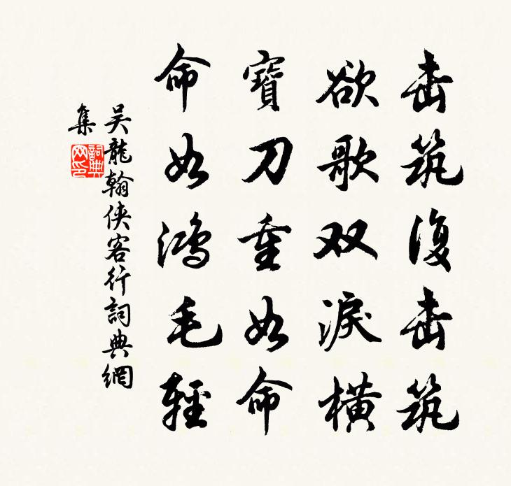 詩詞名句歷史字典書法欣賞書法字典國語詞典說文解字康熙字典古漢語字典標 題 作 者 詩 句 俠客行作者:吳龍翰 朝代:宋代俠客行原文擊築復擊築,欲歌雙淚橫。寶刀重如命,命如鴻毛輕。詩詞問答問:俠客行的作者是誰?答:吳龍翰問:俠客行寫於哪個朝代?答:宋代吳龍翰俠客行書法欣賞俠客行書法作品詩詞推薦減字木蘭花蘇軾〔宋代〕銀箏旋品。不用纏頭千尺錦。妙思如泉。一洗閒愁十五年。為公少止。起舞屬公公莫起。風裡銀山。擺撼魚龍我自題棋山徐俛〔宋代〕風馭雲轉□渺茫,石奇松老尚蒼蒼。留題盡有爭先意,誰識棋山是道場。暮春感懷吳芾〔宋代〕是處兵戈滿,誰言宇宙寬。戰聲驚膽破,春色入心酸。北狩江天遠,東巡海氣寒。野人元任運,愁夢亦隨鑾。寄峽州使君郭郎中三首趙蕃〔宋代〕契自西台敘,親從昭德論。名聲蓋前輩,牢落愧清門。既見未知日,因風聊自存。只愁千裡面,識我故塵昏。無題三首馬廷鸞〔宋代〕口語甘時心獨異,中邊甜處味方宜。詩情合薦東坡老,慚愧當年蜜荔枝。版築求賢圖唐寅〔明代〕聖主求賢按畫圖,頃將天秩界胥徙。精神不是能玄會,顏色安知非濫竽。哭王注司空曙〔唐代〕已嘆漳濱臥,何言駐隙難。異才傷促短,諸友哭門闌。古道松聲暮,荒阡草色寒。延陵今葬子,空使魯人觀。留題越州石氏山齋晏殊〔宋代〕書仙十閣壯儒宮,靈越山川實拋雄。岫柏亞香侵幾席,岩花回影入簾櫳。千秋碧鎖東南竹,一水清含旦暮風。文酒秋日登山長孫佐輔〔唐代〕逐勝不怯寒,秋山閒獨登。依稀小徑通,深處逢來僧。側石擁寒溜,欹松懸古藤。明書問知友,興詠將誰能。客中呈幼度范成大〔宋代〕手板頭銜意已慵,墨池書枕興無窮。釀泥深巷五更雨,吹酒小樓三面風。草色有無春最好,客心去住水長東。今朝胡姬年十五擬劉越石張憲〔元代〕胡姬年十五,芍藥正含葩。何處相逢好,并州賣酒家。面開春月滿,眉抹遠山斜。一笑既相許,何須羅扇遮。芳草李中〔唐代〕二月正綿綿,離情被爾牽。四郊初過雨,萬里正鋪煙。眷戀殘花惹,留連醉客眠。飄香是杜若,最憶楚江邊。朱主簿請贊釋宗杲〔宋代〕龐老曾升馬祖堂,西江吸盡更無雙。而今妙喜朱居士,覿面分明不覆藏。三和劉克莊〔宋代〕歲晚文園渴疾深,相瞻北斗不堪斟。幸無封禪書留藁,豈有長門賦賣金。它日友人定郊謚,當時酒客誦雄箴。箕山送丘宗卿帥蜀陳傅良〔宋代〕嘗陪諸老後,亦與晚進游。有能一夕話,可洗萬古愁。昔君尚青衫,今我已白頭。闕下何匆匆,蜀江正悠悠。一請水檻杜甫〔唐代〕蒼江多風飆,雲雨晝夜飛。茅軒駕巨浪,焉得不低垂。遊子久在外,門戶無人持。高岸尚如谷,何傷浮柱奇支。扶花石詩十一章鄧肅〔宋代〕浮花浪蕊自朱白,月窟鬼方更奇絕。繽紛萬里來如雲,上林玉砌酣春色。酬於汝錫曉雪見寄王建〔唐代〕欲明天色白漫漫,打葉穿簾雪未乾。薄落階前人踏盡,差池樹里鳥銜殘。旋銷迎暖沾牆少,斜舞遮春到地難。勞動次韻陳侍郎李察院瀟湘八景圖漁村落照喻良能〔宋代〕亂山深處水邊村,小艇初歸未掩門。吹火煮魚傾濁酒,半規斜日照黃昏。贈林尚仁陳必復〔宋代〕溪邊著吟屋,亦足老生涯。洗硯渾池水,敲棋落案花。客來多載酒,童去自煎茶。愛爾丰標異,逢人滿口夸。名句推薦醉翁之意不在酒,在乎山水之間也。歐陽修《醉翁亭記》 燈火紙窗修竹里,讀書聲。陳繼儒《浣溪沙·初夏夜飲歸》 雪岸叢梅發,春泥百草生。杜甫《陪裴使君登岳陽樓》 坐開桑落酒,來把菊花枝。杜甫《九日楊奉先會白水崔明府》 執子之手,與子偕老。詩經《擊鼓》 一朵江梅春帶雪。玉軟雲嬌,姑射肌膚潔。趙鼎《蝶戀花·一朵江梅春帶雪》 君子和而不流;強哉矯。中立而不倚;強哉矯。國有道,不變塞焉;強哉矯。國無道,至死不變;強哉矯。子思《中庸·第十章》 煙水初銷見萬家,東風吹柳萬條斜。竇鞏《襄陽寒食寄宇文籍》 寧不知傾城與傾國。佳人難再得。李延年《李延年歌》 人悄悄,簾外月朧明。岳飛《小重山·昨夜寒蛩不住鳴》