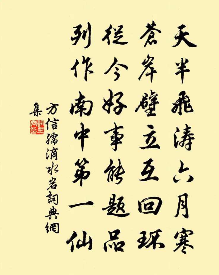 詩詞名句歷史字典書法欣賞書法字典國語詞典說文解字康熙字典古漢語字典標 題 作 者 詩 句 滴水岩作者:方信孺 朝代:宋代滴水岩原文天半飛濤六月寒,蒼岸壁立互迴環。從今好事能題品,列作南中第一仙。詩詞問答問:滴水岩的作者是誰?答:方信孺問:滴水岩寫於哪個朝代?答:宋代方信孺滴水岩書法欣賞滴水岩書法作品詩詞推薦次韻仲成叔加雙桂橋許月卿〔宋代〕展墓歸來春水服,橋頭望月正如鉤。橋成未用問誰住,意遠應同逐水流。天外雁鳧何足許,人間鹿豕可仝游。須知絕句六十四首張伯端〔宋代〕敲竹喚龜吞玉芝,鼓琴招鳳飲刀圭。近來透體金光現,不與常人話此規。蝃蝀佚名〔先秦〕蝃蝀在東,莫之敢指。女子有行,遠父母兄弟。朝隮於西,崇朝其雨。女子有行,遠兄弟父母。乃如之人也,懷婚述懷劉沆〔宋代〕虎生三日便窺牛,獵犬寧能掉尾求。若不去登黃閣貴,便須來伴赤松游。奴顏婢舌誠堪恥,羊狠狼貪自合羞。三尺水調歌頭 代贈醫者葛道夫吳存〔元代〕欲問花長生藥,花句漏有丹花砂。只今花醫國妙手,還屬葛仙家。出入聖神工巧,操縱溫涼寒熱,功用妙無涯。談送范安撫喜雨詩項安世〔宋代〕一寸甘腴一寸金,只今誰可旱天霖。贖鍰盡免疲民血,重役新寬戰士心。蛇制電光開九闔,龍呼雲氣出重陰。書生宴清都·初春盧祖皋〔宋代〕春訊飛瓊管。風日薄、度牆啼鳥聲亂。江城次第,笙歌翠合,綺羅香暖。溶溶澗淥冰泮。醉夢裡、年華暗換。料黛次韻鑒中八詠於石〔宋代〕蓬萊失左股,負以垂天翼。中有仙人居,珠宮燦瑤席。凝雲不飛去,化作輪囷石。彈琴坐石上,長憶三山客。年老逢春十三首邵雍〔宋代〕年老逢春莫厭頻,更頻能見風回春。須將酒盞強留客,卻恐花枝解笑人。世態不堪新間舊,物情難免假疑真。誰雲青城縣何子方使君同年園池范成大〔宋代〕榿塍芋壟意中行,浩蕩薰風不計程。雨腳背人歸玉壘,江聲隨馬入青城。五橋今日新知路,千佛當年舊綴名。水竹正月晦日,自英州舍舟出陸,北風大作楊萬里〔宋代〕北風吹得山石裂,北風凍得人骨折。南來何曾識此寒,便恐明朝丈深雪。今朝幸不就船行,白浪打船君更驚。只是蘇幕遮張繼先〔宋代〕先天生,後天久。道有真詮,諦聽當時受。恰是迷天迷望斗。只恐微軀,薄倖隨枯朽。義榮見示禪月山居詩盥讀數過六根洒然但余素鄭剛中〔宋代〕瓜滿前疇菜滿畦,赤松屋北寺居西。不村不郭常安穩,非律非禪自整齊。靜見游魚潭底樂,任從幽鳥葉間啼。此心歲晚私感宋祁〔宋代〕已嗟官落魄,更值歲崢嶸。一絓區中累,千慚谷口耕。休文偏恨瘦,夷甫太鍾情。借問長安米,侏儒有底榮。日月無情徐夤〔唐代〕日月無情也有情,朝升夕沒照均平。雖催前代英雄死,還促後來賢聖生。三尺靈烏金借耀,一輪飛鏡水饒清。憑誰長相思江總〔隋代〕長相思。久離別。征夫去遠芳音滅。湘水深。隴頭咽。紅羅斗帳里。綠綺清弦絕。逶迤百尺樓。愁思三秋結。驀山溪仲殊〔宋代〕清江平淡,疏雨和煙染。春在廣寒宮,付江梅、先開素艷。年年第一,相見越溪東,雲體態,雪精神,不把年華占挽仁宗皇帝辭五首鄭獬〔宋代〕四海一明鑑,舟車萬里通。名王花賜綬,戰士錦韜弓。孝武曾疲戰,明皇亦召戎。爭如四十載,終始太平中。次洪監簿惠詩韻五首姜特立〔宋代〕自古詩人失意多,偶然歲晚慰蹉跎。如今世味都如蠟,水際林間自日喔。送治楊司直袁燮〔宋代〕岷蜀古多士,聲名爭頡頏。近代推三蘇,奮發眉之陽。君侯亦眉人,源委故深長。少日隨遊宦,中年擅詞場。笑談名句推薦綠池落盡紅蕖卻,荷葉猶開最小錢。楊萬里《秋涼晚步》 教子弟求顯榮,不如教子弟立品行。王永彬《圍爐夜話·第四五則》 玉不琢,不成器;人不學,不知道。戴聖《禮記·學記》 何期今日酒,忽對故園花。文森《九日》 越人語天姥,雲霞明滅或可睹。李白《夢遊天姥吟留別 / 別東魯諸公》 乖僻自是,悔誤必多;頹惰自甘,家道難成。朱柏廬《朱子家訓·全文》 駸駸嬌眼開仍,悄無人至還凝佇。文徵明《青玉案·庭下石榴花亂吐》 山有扶蘇,隰有荷華。佚名《山有扶蘇》 詩酒趁年華。蘇軾《望江南·超然台作》 春思遠,誰嘆賞、國香風味。周密《繡鸞鳳花犯·賦水仙》