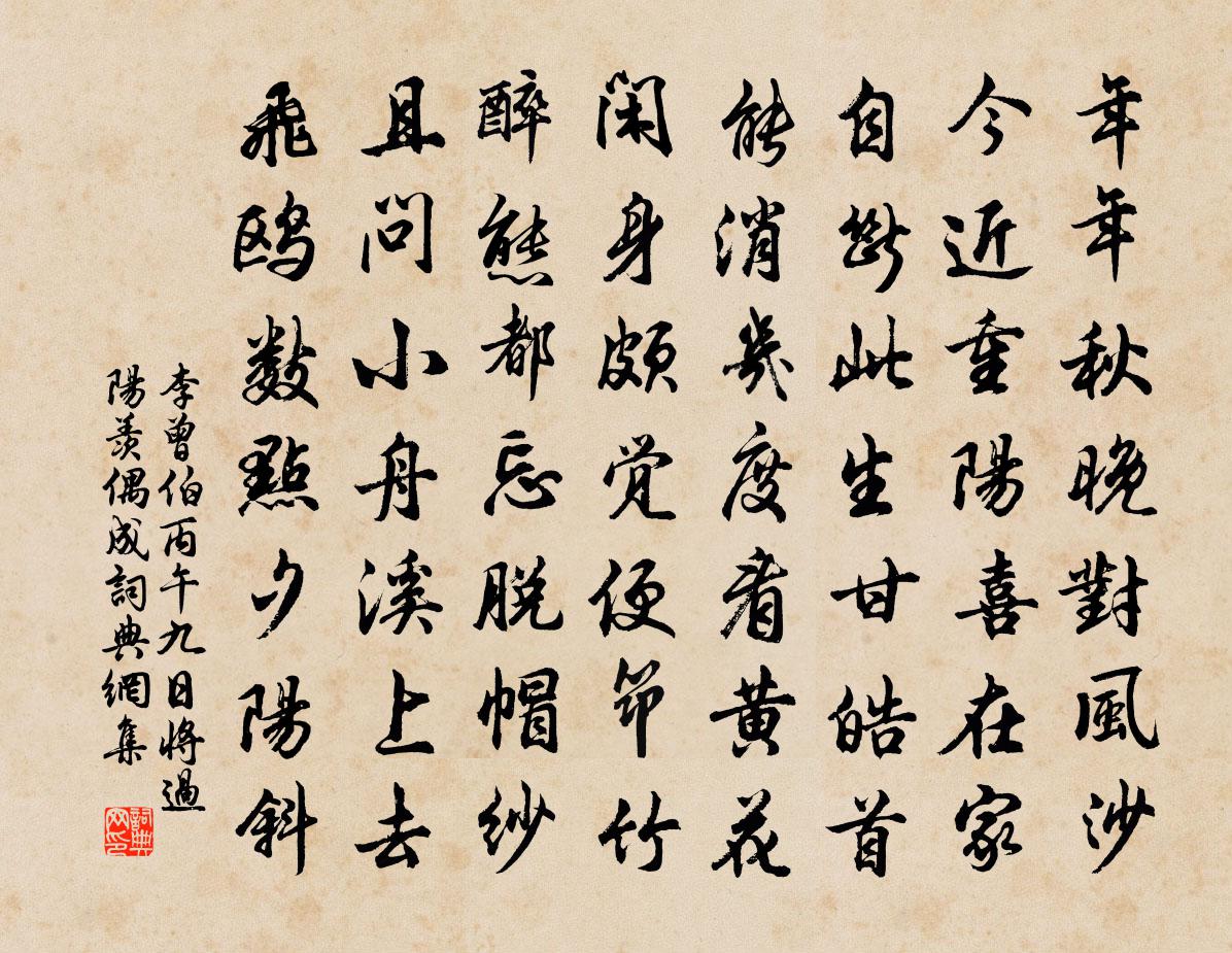 詩詞名句歷史字典書法欣賞書法字典國語詞典說文解字康熙字典古漢語字典標 題 作 者 詩 句 丙午九日將過陽羨偶成作者:李曾伯 朝代:宋代丙午九日將過陽羨偶成原文年年秋晚對風沙,今近重陽喜在家。自斷此生甘皓首,能消幾度看黃花。閒身頗覺便筇竹,醉態都忘脫帽紗。且問小舟溪上去,飛鷗數點夕陽斜。詩詞問答問:丙午九日將過陽羨偶成的作者是誰?答:李曾伯問:丙午九日將過陽羨偶成寫於哪個朝代?答:宋代李曾伯丙午九日將過陽羨偶成書法欣賞丙午九日將過陽羨偶成書法作品詩詞推薦山居雜興張次賢〔宋代〕深林樹色翠重重,一枕蘧蘧蝶翅濃。好鳥乍啼驚夢覺,可人山色人簾櫳。句丁謂〔宋代〕白雪芬芳玉有香。行住坐臥三十二頌釋印肅〔宋代〕主賓交接未開言,便過茶湯應口邊。察理聆音非外物,吉他歡喜萬千年。逍遙令高道寬〔元代〕君問道,只要穀神通。但把乾坤為鼎器,兩般訊息妙無窮。湛湛越澄清。瑤池客,方外運玄功。放下萬緣都不掛,秋夕杜牧〔唐代〕紅燭秋光冷畫屏,輕羅小扇撲流螢。天階夜色涼如水,坐看牽牛織女星。和易秀才春日見寄李中〔唐代〕每恨多流落,吾徒不易親。相逢千里客,共醉百花春。小檻山當面,閒階柳拂塵。何時卜西上,明月桂枝新。東郊別業耿湋〔唐代〕東皋占薄田,耕種過餘年。護藥栽山刺,澆蔬引竹泉。晚雷期稔歲,重霧報晴天。若問幽人意,思齊沮溺賢。端午帖子皇帝合六首歐陽修〔宋代〕彩索盤中結,楊梅棕里紅。宮闈九重樂,風俗萬方同。道中即事方岳〔宋代〕上到春山頂{左寧右頁}頭,更攜煙雨入吾州。梅花便作鄉人看,飛落酒杯相勸酬。敬和九鎖步虛詞龍吟鎖趙汝湜〔宋代〕矯首東方宮,變化何由尋。神用妙難擬,飈電赫森森。雨施不為功,雲從本無心。人間謾懷想,戛缽希雷吟。偈二首釋雲賁〔宋代〕鬧籃方喜得抽頭,退鼓而今打未休。莫把乳峰千丈雪,重來換我一雙眸。趙大監時賞第一百一十九文天祥〔宋代〕豪傑貴勳業,宗支神翹後。平生白羽扇,欝結回我首。金陵道上釋斯植〔宋代〕一望江山去不回,斷碑荒草舊宮台。六朝陳跡皆如夢,夜夜寒潮送月來。書廬山劉顗宮苑屋壁三絕蘇轍〔宋代〕此山岩谷不知重,赤眼浮圖自一峰。芒蹻隨僧踐黃葉,曉光消雪墮長松。石泉試飲先師錫,午飯歸尋下寺鐘。勝處遣興次韻鄧深〔宋代〕山閣舂容丈尺間,元無俗事撓清閒。有時把筆抄新句,整日開窗對舊山。葉帳靜看青似染,禽言細聽字終蠻。可憐次韻程安撫蟹二首陳造〔宋代〕物生不學螭蟠泥,禍及乃諉造化兒。良材厚味庸自保,熊斃以掌豹以皮。雄戟介甲亦壯矣,乘流未可聽所之。託身句孫升〔宋代〕若與蛟龍爭角黍,應同漁父啜糟醨。鷓鴣引 為樂籍張惠英賦王惲〔元代〕秋水芙蓉鏡里仙。一枝明玉濯煙鬟。鶯初解語調柔石,柳不勝嬌拂畫闌。催疊鼓,按弓彎。樓心低月怯清寒。人生大道歌白玉蟾〔宋代〕烏飛金,兔走玉,三界一粒粟。山河大地幾年塵,陰陽顛倒入玄谷。人生石火電光中,數枚客鵲枝頭宿。桑田滄海過龜峰楊萬里〔宋代〕大龜昂首瞻南天,仙人赤腳騎龜肩。小龜一雙走隨母,指爪穿盡追不前。仙人不知卜何事,蹈脫綠毛紛滿地。老夫名句推薦庭中有奇樹,綠葉發華滋。佚名《庭中有奇樹》 香醪欲醉茱萸節,壯志還為出塞歌。石茂華《九月九日登長城關》 菱葉縈波荷颭風,荷花深處小船通。白居易《採蓮曲》 算明朝、未了重陽,紫萸應耐看。吳文英《霜花腴·重陽前一日泛石湖》 失之毫釐,差以千里。班固《漢書·傳·東方朔傳》 人歸山郭暗,雁下蘆洲白。韋應物《夕次盱眙縣》 雲母屏風燭影深,長河漸落曉星沉。李商隱《嫦娥》 低頭獨長嘆,此嘆無人喻。白居易《買花 / 牡丹》 綺席象床寒玉枕,美人何處醉黃花。汪元量《望江南·幽州九日》 白骨露於野,千里無雞鳴。曹操《蒿里行》