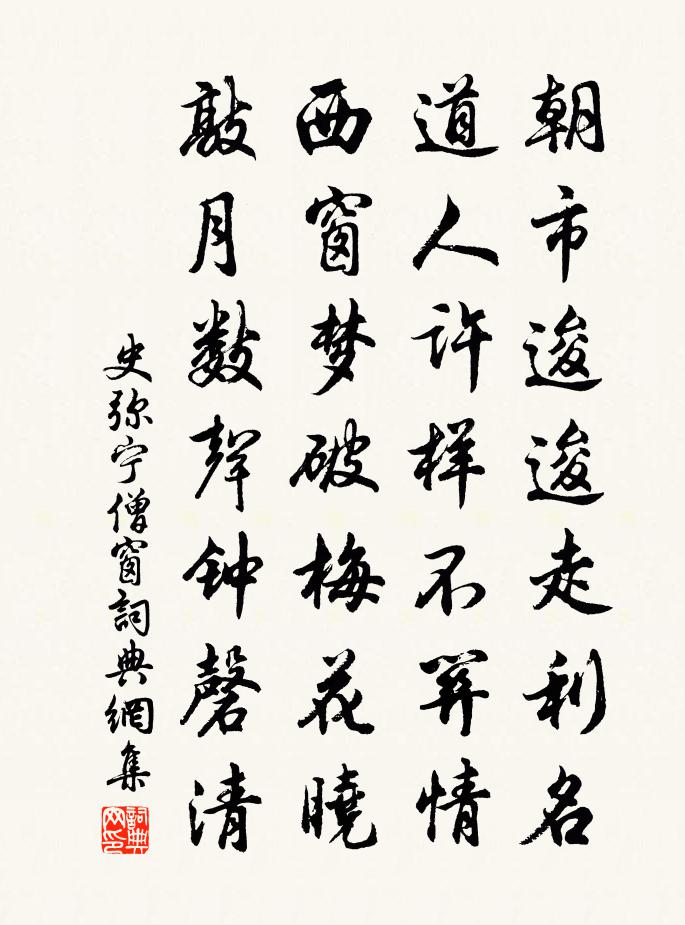 詩詞名句歷史字典書法欣賞書法字典國語詞典說文解字康熙字典古漢語字典標 題 作 者 詩 句 僧窗作者:史彌寧 朝代:宋代僧窗原文朝市逡逡走利名,道人許樣不關情。西窗夢破梅花曉,敲月數聲鐘磬清。詩詞問答問:僧窗的作者是誰?答:史彌寧問:僧窗寫於哪個朝代?答:宋代史彌寧僧窗書法欣賞僧窗書法作品詩詞推薦挽史允叟慈母王氏陳著〔宋代〕彼美蘭儀盎粹溫,誰知肅肅范閨門。生榮夢視金花誥,死瞑培成玉樹根。中一袝嚴家稱禮,終三年制子權恩。我來河南受代前一日希深示詩梅堯臣〔宋代〕我昔在桐鄉,伊人頗欣戴。今來佐洛南,事事為時背。自愧居下流,無能謝前輩。固乏橫草功,當蒙及瓜代。且遺臨江仙(坐悟)劉辰翁〔宋代〕我去就他甚易,他來認我良難。悟時到處是壺天。古詩尋一句,危坐看香菸。金玉滿堂不守,菁華歲月空遷。從今柳集亡食蝦蟆詩因有作晁說之〔宋代〕我讀柳侯詩,不見蝦蟆篇。所亡諒非一,撫卷為慨然。不應流落人,吟詠亦不前。問爾胸中奇,何以能棄捐。湯湯驀山溪陳瓘〔宋代〕扁舟東去,極目滄波渺。千古送殘紅,到如今、東流未了。午潮方去,江月照還生,千帆起,玉繩低,枕上鶯聲曉麴生訪宿白居易〔唐代〕西齋寂已暮,叩門聲嘀嘀。知是君宿來,自拂塵埃席。村家何所有?茶果迎來客。貧靜似僧居,竹林依四壁。廚燈書懷寄呈諸友黃庚〔宋代〕寂寞茅檐下,窮居更待時。吾儕貧可忍,餘子俗難醫。風月最宜酒,江山多是詩。廣文無鄭老,誰與共襟期。寒食釋斯植〔宋代〕江南江北紙錢飛,處處人家拜冢時。杜宇不禁寒食雨,五更啼血上花枝。禪人寫真求贊釋正覺〔宋代〕口方鼻直,眉棱眼深。未填溝壑,還礙叢林。萬象無得剩法,三世不見閒心。字雁沒而寒煙淡淡,華鱗潛而秋水沈賀周總管岸軒遷居回任劉鑒〔宋代〕就第開藩自古難,旌門累世況團圞。肯邀父老為鄰舍,更約交遊說歲寒。千里春風棠蔽芾,一窗秋月竹平安。鄉人木蘭花慢 至大戊申八月二十五日,同疏仙萬許有壬〔元代〕雲左瓶丞未老休瓶致,指清露堂扁,命予二人分賦長短句,予得清字,皆即瓶成章,喜甚,榜之堂上。疏仙其甥也至大雷聯句何遜〔南北朝〕高談會良夕。滿酒對羈情。閔閔風煙動。蕭蕭江雨聲。密雲窮浦暗。飛電遠洲明。若非今宴適。詎使客愁輕。遙舟陳文正黃庭帖贊岳珂〔宋代〕隆興聖主臨盛朝,元臣堂堂冠蟬貂。鎮撫百度服天驕,九鼎安固屹莫搖。凜然遺墨松後凋,美錦不裼璞不雕。百年贈徐子虛畫魚王佐才〔宋代〕我嘗放意游江湖,喜從釣叟觀真魚。有時臨溪行復坐,秋水無風魚自如。鱗鱗鬣滑隨上下,迴旋戲躍形皆殊。兩兩重過惟貞上人院朱慶餘〔唐代〕老去唯求靜,都忘外學名。掃床秋葉滿,對客遠雲生。香閤閒留宿,晴階暖共行。窗西暮山色,依舊入詩情。郊廟歌辭。周郊祀樂章。禋順樂佚名〔唐代〕黃彝將獻,特牲預迎。既修昭事,潛達明誠。留題積善院許將〔宋代〕為愛山居樂,居山又憶家。菊黃來日蕊,梅白去時花。水闊離情遠,霜晴別恨賒。前程回首望,空指暮天霞。入閩道中戴復古〔宋代〕山中寂寞去程賒,莫惜頻頻到酒家。行李蕭然還不倍,擔頭顛倒插梅花。挽趙東岩簡叔彥侯四首王邁〔宋代〕夔州歸後聖於詩,到墨池來字更奇。岳後前驅護丹灶,湘靈起舞聽朱徽。經行一夢遊仙枕,遺愛千年隨淚碑。俗物和感應王祠趙希逢〔宋代〕無端治世苦幽囚,千古空貽善類羞。格是愛君身敢恤,勢須苦口疾方瘳。明祠償鑒長非罪,異日焉知廣侯。一片忠名句推薦高館張燈酒復清,夜鍾殘月雁歸聲。高適《夜別韋司士》 拼將一死酬知己,致令千秋仰義名。羅貫中《三國演義·第五十回》 賢而多財,則損其志;愚而多財,則益其過。司馬光《資治通鑑·漢紀·漢紀十七》 心病終須心藥治,解鈴還是系鈴人。曹雪芹《紅樓夢·第九十回》 天長地久有時盡,此恨綿綿無絕期。白居易《長恨歌》 千里之行,始於足下。老子《老子·德經·第六十四章》 越鳥巢乾後,歸飛體更輕。李商隱《晚晴》 臣聞君子樂得其志,小人樂得其事。姜子牙《六韜·文韜·文師》 水漲魚天拍柳橋。雲鳩拖雨過江皋。周邦彥《浣溪沙·水漲魚天拍柳橋》 荷笠帶斜陽,青山獨歸遠。劉長卿《送靈澈上人》
