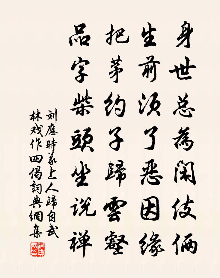 詩詞名句歷史字典書法欣賞書法字典國語詞典說文解字康熙字典古漢語字典標 題 作 者 詩 句 義上人歸自武林戲作四偈作者:劉應時 朝代:宋代義上人歸自武林戲作四偈原文身世總為閒伎倆,生前須了惡因緣。把茅約子歸雲壑,品字柴頭坐說禪。詩詞問答問:義上人歸自武林戲作四偈的作者是誰?答:劉應時問:義上人歸自武林戲作四偈寫於哪個朝代?答:宋代劉應時義上人歸自武林戲作四偈書法欣賞義上人歸自武林戲作四偈書法作品詩詞推薦偈頌七首釋思岳〔宋代〕誰道霜風只一般,今年寒勝去年寒。夜來得個真訊息,無限鮎魚上竹竿。竹溪直院盛稱起予草堂詩之善暇日覽之多有可劉克莊〔宋代〕汲汲懷人夢,皇皇救世功。有心哉魯叟,所見者周公。政績簡編在,精神寤寐通。宛如尚為左,忘卻已遷東。鳳去次韻鄧志宏三月辛卯大雨雹蘇籀〔宋代〕剝圭碎璧崑山頹,天容黯慘凝不開。隨和抵鵲虎兕吼,陽愆陰伏推從來。雀鼠懷安怖入壁,聲侔海翻星隕石。疾雷河傳令 知縣董德夫小王哲〔元代〕德夫知縣。坐上將余便。索河傳令。堂下落花,你咱分明親見。稍知空,這攀緣,都不戀。爭如修取來生善。早悟春晴鄭剛中〔宋代〕午夢悠揚一蝶輕,隔窗驚覺搗茶聲。偶然樽酒得佳趣,半夜花間燈火明。送津赴紹興倅八首吳芾〔宋代〕出仕曾塵侍從班,退休還得老湖山。已慚過分無池望,只願吾兒相對閒。初聞貶謫,續喜量移,登乾越亭贈鄭校書劉長卿〔唐代〕青青草色滿江洲,萬里傷心水自流。越鳥豈知南國遠,江花獨向北人愁。生涯已逐滄浪去,冤氣初逢渙汗收。何事春日有懷諸友楊時〔宋代〕憑几無聊晝掩扉,芬芬晴氣減春衣。隔簾相應鶯初語,背日連飛雁北歸。莫逆交遊千里別,遠來音信兩年稀。追尋秋霜閣徐良弼〔宋代〕秋霜閣下水潺潺,一片清泉漱玉寒。試把塵襟來此濯,要看披腹吐琅玕。吊靈均詞皎然〔唐代〕昧天道兮有無,聽汨渚兮躊躇。期靈均兮若存,問神理兮何如。願君精兮為月,出孤影兮示予。天獨何兮有君,君與太常丞丁晦甫敖陶孫〔宋代〕負昔嘗為李公客,坐覺金氣肅東南。鉤間棘句護帖妥,獨立卻視何巘巘。此公行世有步里,十不五試驚愚凡。尺書悶歌行十二首楊萬里〔宋代〕問來鄔子到南康,水路都來兩日強。屈指行程誰道遠?如今不敢問都昌。萍鄉絕句阮閱〔宋代〕春盡江南歸已遲,湘南風雨度花時。無因剪取湘江色,攜看江屏畫竹枝。出真州文天祥〔宋代〕天地沉沉夜泝舟,鬼神未覺走何州。明朝遣間應無是,莫恐元戎逐客不。南鄉子 至元六年九月十四日,李重山憲副壽宋褧〔元代〕風憲至山南,遂大宴合樂。重山號梅庭主人,所居官舍,即舊水犀亭,久桂宇散秋香。咫尺梅庭十月陽。紅葉黃花清塘曲楊維楨〔元代〕相值清塘道,儂家似沫鄉。清塘無限好,相約采芳塘。洛陽道五首獻呂四郎中儲光羲〔唐代〕洛水春冰開,洛城春水綠。朝看大道上,落花亂馬足。劇孟不知名,千金買寶劍。出入平津邸,自言嬌且艷。大道再題江橫蒲壽宬〔宋代〕一榻虛明懷抱幽,水天無際望悠悠。潮來不覺沙洲沒,浪打只疑茅屋浮。何處漁人橫短笛,有時嫠婦泣孤舟。忘機題桑子鋪石壁孫沖〔宋代〕峨峨溪畔石,迢迢石邊路。寄言名利徒,清閒誠足慕。春花嘆王默〔宋代〕春花復春花花,紅紅花間白白花。相看花待明發,已不如昨日。雨露費濡染,秉芳幾何時。姚魏殿春事,濃綠已盈名句推薦七國三邊未到憂,十三身襲富平侯李商隱《富平少侯》 罔游於逸,罔淫于樂。佚名《尚書·虞書·大禹謨》 世事一場大夢,人生幾度秋涼?蘇軾《西江月·世事一場大夢》 橫笛和愁聽,斜枝倚病看。崔道融《梅花》 無事不登三寶殿馮夢龍《警世通言·卷二十八》 夕陽西下,斷腸人在天涯。馬致遠《天淨沙·秋思》 三五年時三五月,可憐杯酒不曾消。黃景仁《綺懷》 言極則怒,怒則說者危。呂不韋《呂氏春秋·論·貴直論》 黃葉仍風雨,青樓自管弦。李商隱《風雨》 自古聖賢盡貧賤,何況我輩孤且直!鮑照《擬行路難·其六》