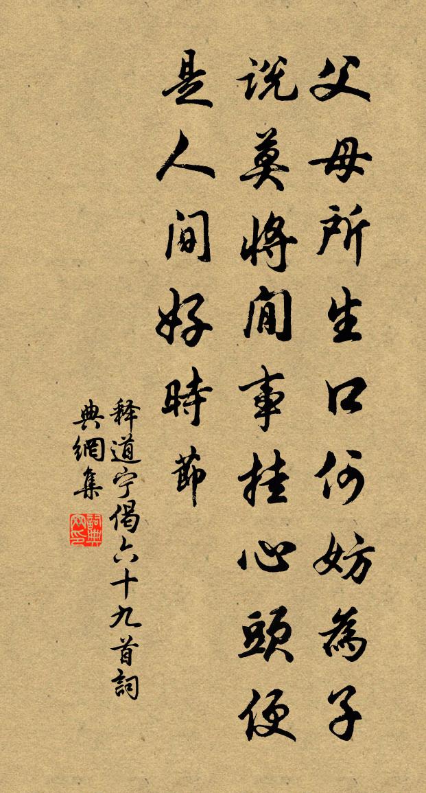 詩詞名句歷史字典書法欣賞書法字典國語詞典說文解字康熙字典古漢語字典標 題 作 者 詩 句 偈六十九首作者:釋道寧 朝代:宋代偈六十九首原文父母所生口,何妨為子說。莫將閒事掛心頭,便是人間好時節。詩詞問答問:偈六十九首的作者是誰?答:釋道寧問:偈六十九首寫於哪個朝代?答:宋代釋道寧偈六十九首書法欣賞偈六十九首書法作品詩詞推薦紅牙板歌楊維楨〔元代〕百花樓前花倡樂作,花長鼻彎彎花舞金絡花。生憐為齒焚雄軀,枯魄應節如何虞?良工削出紅冰片,脫木生前豈容廟之神元稹〔唐代〕我馬煩兮釋我車,神之廟兮山之阿。予一拜而一祝,祝予心之無涯。涕汍瀾而零落,神寂默而無嘩。神兮神兮,奈題未開牡丹孫魴〔唐代〕青苞雖小葉雖疏,貴氣高情便有餘。渾未盛時猶若此,算應開日合何如。尋芳蝶已棲丹檻,襯落苔先染石渠。無限輞川集二十首孟城坳裴迪〔唐代〕結廬古城下,時登古城上。古城非疇昔,今人自來往。對菊丁高林〔宋代〕幾本僅成畦,山晴手自栽。花逢新過雁,根帶舊移苔。正色通騷籍,清香入酒杯。儻無陶靖節,今古為誰開。緣識宋太宗〔宋代〕如夢復性坐,尋思境外忙。因緣開利鈍,語默自清涼。晚坐新亭對溪山有感二首錢時〔宋代〕莫道壺中日月長,壺中日月只尋常。乾坤今古無窮妙,是我庭前一草芒。送秦秘監以顯謨知潼川魏了翁〔宋代〕杜侯歸未幾,又送秦侯歸。錦衣赫相望,里閈生光輝。僅存二三士,去意不可羈。王張屢乞身,余亦五請祠。豈不讀曲歌·打殺長鳴雞南朝民歌〔南北朝〕打殺長鳴雞,彈去烏臼鳥。願得連暝不復曙,一年都一曉。風流子康與之〔宋代〕結客少年場。繁華夢,當日賞風光。紅燈九街,買移花市,畫樓十里,特地梅妝。醉魂盪,龍跳撝萬字,鯨飲吸三木芙蓉李春伯〔宋代〕甚疑牡丹業,但病皮骨老。不宜入水看,只可隔水眺。清明遣興呈郭次張李洪〔宋代〕倦遊佳節負清明,禁籞芳菲未遍經。楊柳堆煙猶冉弱,杏花著雨半飄零。街頭車馬來還去,客里壺觴醉復醒。賸喜立春日晨起對積雪張九齡〔唐代〕忽對林亭雪,瑤華處處開。今年迎氣始,昨夜伴春回。玉潤窗前竹,花繁院裡梅。東郊齋祭所,應見五神來。句錢惟濟〔宋代〕鳳簫通碧落,星石辨靈源。通泉驛南去通泉縣十五里山水作杜甫〔唐代〕溪行衣自濕,亭午氣始散。冬溫蚊蚋在,人遠鳧鴨亂。登頓生曾陰,奇支傾出高岸。驛樓衰柳側,縣郭輕煙畔。一臨江仙(詠熟水)易少夫人〔宋代〕何處甘泉來席上,嫩黃初湯銀瓶。月團嘗罷有餘清。惠山名品在,歌舞暫留停。欲賞壑源新氣味,不應兼進豨苓。王家琵琶張祜〔唐代〕金屑檀槽玉腕明,子弦輕撚為多情。只愁拍盡涼州破,畫出風雷是撥聲。甲戌廷對後到洞霄丙戌假守新安又得寄徑成詩汪立中〔宋代〕憶昔尋幽興未終,重來洞府訪仙翁。十年塵世身將隱,千年華陽路暗通。山水只如前日好,松杉似與老人同。明朝偈頌一百二十三首釋崇岳〔宋代〕達磨達磨,不識這個。直指單傳,胡揮亂做。沈園二首陸游〔宋代〕城上斜陽畫角哀,沈園非復舊池台,傷心橋下春波綠,曾是驚鴻照影來。夢斷香消四十年,沈園柳老不吹綿。此身名句推薦柳外輕雷池上雨,雨聲滴碎荷聲。小樓西角斷虹明。歐陽修《臨江仙·柳外輕雷池上雨》 將贍才力,務在博見劉勰《文心雕龍·事類》 冰泮寒塘水綠,雨余百草皆生。韋應物《三台》 斷虹霽雨,淨秋空,山染修眉新綠。黃庭堅《念奴嬌·斷虹霽雨》 梅子黃時日日晴,小溪泛盡卻山行曾幾《三衢道中》 如今風雨西樓夜,不聽清歌也淚垂。周紫芝《鷓鴣天·一點殘紅欲盡時》 有理言自壯,負屈聲必高。馮夢龍《警世通言·卷十五》 清露晨流,新桐初引,多少遊春意。李清照《念奴嬌·春情》 夢斷香消四十年,沈園柳老不吹綿。陸游《沈園二首》 落花人獨立,微雨燕雙飛。晏幾道《臨江仙·夢後樓台高鎖》