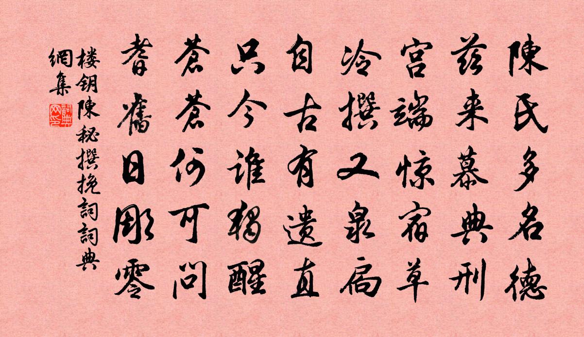 詩詞名句歷史字典書法欣賞書法字典國語詞典說文解字康熙字典古漢語字典標 題 作 者 詩 句 陳秘撰輓詞作者:樓鑰 朝代:宋代陳秘撰輓詞原文陳氏多名德,茲來慕典刑。宮端驚宿草,冷撰又泉扃。自古有遺直,只今誰獨醒。蒼蒼何可問,耆舊日彫零。詩詞問答問:陳秘撰輓詞的作者是誰?答:樓鑰問:陳秘撰輓詞寫於哪個朝代?答:宋代樓鑰陳秘撰輓詞書法欣賞陳秘撰輓詞書法作品詩詞推薦溪上釋文珦〔宋代〕散策清溪岸,茅檐事事幽。燕巢春始壘,蛛網雨來收。翁媼能留客,兒童不識愁。興長歸徑晚,回首問群鷗。李西清先生創凌霄觀於潼川紅樓之上賦計敬和程公許〔宋代〕丈人氣湖海,合臥百尺樓。引袖麾八極,無處豁前眸。肯以治城志,而忘天下憂。窘步爭徑捷,危炊迷劍頭。攀天秋夜俞桂〔宋代〕月華如水淨無塵,千里相思總一心。絡緯籬邊吟不徹,做成秋意十分深。蘭溪(在蘄州西)杜牧〔唐代〕蘭溪春盡碧泱泱,映水蘭花雨發香。楚國大夫憔悴日,應尋此路去瀟湘。酬張相公見寄貫休〔唐代〕周郎懷抱好知音,常愛山僧物外心。閉戶不知芳草歇,無能唯擬住山深。感通未合三生石,騷雅歡擎九轉金。但似酬楊八副使將赴湖南途中見寄一絕劉禹錫〔唐代〕知逐征南冠楚材,遠勞書信到陽台。明朝若上君山上,一道巴江自此來。蝶戀花(初夏)趙長卿〔宋代〕亂疊青錢荷葉小。濃綠陰陰,學語雛鶯巧。小樹飛花芳徑草。堆紅襯碧於中好。梅子弄黃枝上早。春已歸時,戲蝶和宋中丞夏日游福賢觀天長寺寺即陳左相宅所王維〔唐代〕已相殷王國,空餘尚父谿。釣磯開月殿,築道出雲梯。積水浮香象,深山鳴白雞。虛空陳伎樂,衣服制虹霓。墨點恣逍遙姬翼〔元代〕圖名圖利,爭人競我。開眼後、一場**。誰高誰下,誰強誰弱。閻老子、一般籠里。事事俱休,般般打破。無拘宋氏五女(若芬五女:若華、若昭、若倫、若憲、若茵)王建〔唐代〕五女誓終養,貞孝內自持。兔絲自縈紆,不上青松枝。晨昏在親傍,閒則讀書詩。自得聖人心,不因儒者知。少年殘句但令有婦如康子蘇軾〔宋代〕但令有婦如康子,安問生兒比仲謀。感懷五首趙蕃〔宋代〕新霜迫人寒,落葉無停枝。長夜不得旦,四壁崩莫維。床根蟋蟀親,幽怨如陳辭。感我平生心,搔頭半成絲。錢塘江三首吳潛〔宋代〕扁舟東下白雲鄉,一水牽愁萬里長。多謝白鷗閒不去,知余機事近來忘。贈李安撫徐伉〔宋代〕尚書八座貴,大使十州雄。欲得瘡痍痤,先憐杼軸空。仁民兼愛物,時雨及春風。掃花游/掃地游張半湖〔宋代〕柳絲曳綠,正豆雨初晴,水天朱夏。石榴綻也。看猩紅萬點,倚亭敧榭。鎖闥深中,料想酒闌歌罷。日將下。是那桐柏觀夏竦〔宋代〕鳥道寒藤結,洞門蒼蘚深。樓台在山畔,松檜出雲心。土暖春長在,峰高月易沉。羽衣祠太乙,香冷石壇陰。天上月曹勛〔宋代〕皎皎天上月,隨人如有情。何當背銀燭,充我如絕纓。登玉清盧照鄰〔唐代〕絕頂橫臨日,孤峰半倚天。裴回拜真老,萬里見風煙。次韻庭誨按秋課出城黃庭堅〔宋代〕風鳴落意地,露著晚瓜田。官道奔車氣,經家煮棗煙。獲人歌挃挃,公子騎翩翩。旁舍末隱舉,明秋願有年。遣興示彥博李流謙〔宋代〕信腳隨藤杖,穿林復過橋。聊休讀書眼,小縱坐禪腰。老木成陰遍,枯泉赴汲遙。龍孫吾手種,先我到雲霄。名句推薦寒笛對京口,故人在襄陽。劉昚虛《暮秋揚子江寄孟浩然》 明月皎皎照我床,星漢西流夜未央。曹丕《燕歌行二首·其一》 月華如練,長是人千里。范仲淹《御街行·秋日懷舊》 還作江南會,翻疑夢裡逢。戴叔倫《客夜與故人偶集 / 江鄉故人偶集客舍》 勇於敢則殺,勇於不敢則活。文子《文子·卷五·道德》 賈生年少虛垂淚,王粲春來更遠遊。李商隱《安定城樓》 雨色秋來寒,風嚴清江爽。李白《酬裴侍御對雨感時見贈》 父母呼,應勿緩。父母命,行勿懶。李毓秀《弟子規·入則孝》 菊暗荷枯一夜霜。新苞綠葉照林光。蘇軾《浣溪沙·詠橘》 正身直行,眾邪自息。劉安及其門客《淮南子·繆稱訓》