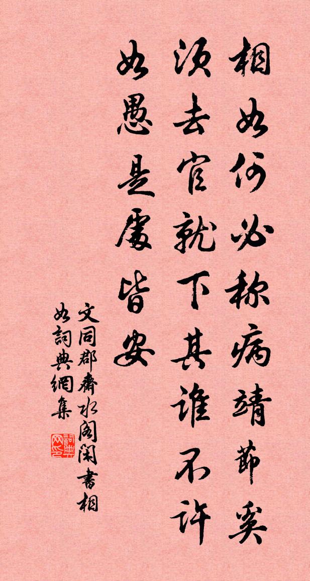詩詞名句歷史字典書法欣賞書法字典國語詞典說文解字康熙字典古漢語字典標 題 作 者 詩 句 郡齋水閣閒書相如作者:文同 朝代:宋代郡齋水閣閒書相如原文相如何必稱病,靖節奚須去官。就下其誰不許,如愚是處皆安。詩詞問答問:郡齋水閣閒書相如的作者是誰?答:文同問:郡齋水閣閒書相如寫於哪個朝代?答:宋代文同郡齋水閣閒書相如書法欣賞郡齋水閣閒書相如書法作品詩詞推薦讀朱先生雲谷詩趙蕃〔宋代〕昔在龍門勝,只今雲谷居。吾州端不遠,曷日從籃輿。題劉氏所藏展子虔感應觀音二首黃庭堅〔宋代〕群盜挽弓江簸船,丹青當在普通前。誰能與作赤挽板,老筆猶堪壽百年。漁家傲歐陽修〔宋代〕九月霜秋秋已盡。烘林敗葉紅相映。惟有東籬 * 盛。遺金粉。人家簾幕重陽近。曉日陰陰晴未定。授衣時節輕寒公無出門李賀〔唐代〕天迷迷,地密密。熊虺食人魂,雪霜斷人骨。嗾犬狺狺相索索,舐掌偏宜佩蘭客。帝遣乘軒災自息,玉星點劍黃金秋雨二首張耒〔宋代〕離披衰柳已無蟬,黃葉閉門風雨天。陶令無錢難得醉,竹窗過午枕書眠。句時定欽〔宋代〕白雲黃鶴自來去,綠水青山無古今。鮮歡吟邵雍〔宋代〕生不爭名與爭利。夫君何故鮮歡意。以道自重固有之,非理相干是無謂。白日升天恐虛傳,金貂換酒可曾醉。誰雲題上虞縣信芳堂戴復古〔宋代〕河陽種桃彭澤柳,歲歲春風夸不朽。何如君種一池蓮,開向五月六月天。紅妝當暑清無汗,綠葉染風香不斷。坐令江城與秋岩同賦董嗣杲〔宋代〕江柳青青暗古津,悲歌不獨是商人。愁生獨醉重關晚,夢破相思故國春。聲跡衰遲難應世,山林枯朽易全身。歸期海棠陸游〔宋代〕月下看荼醾,燭下看海棠。此是看花法,不可輕傳揚。荼醾暗處看,紛紛滿架雪。海棠明處看,滴滴萬點血。癸未生日蘇轍〔宋代〕我生本無生,安有六十五。生來逐世法,妄謂得此數。隨流登中朝,失腳墮南土。人言我當喜,亦言我當懼。我心思則堂先生文天祥〔宋代〕白須老子宿招提,香積廚邊供晚炊。借問魚羹何處少,北風安得似南枝。贈黃山胡公求白鷳李白〔唐代〕請以雙白璧,買君雙白鷳。白鷳白如錦,白雪恥容顏。照影玉潭裡,刷毛琪樹間。夜棲寒月靜,朝步落花間。我願冬至後西湖泛舟看斷冰偶成長句李郢〔唐代〕一陽生後陰飆竭,湖上層冰看折時。雲母扇搖當殿色,珊瑚樹碎滿盤枝。斜汀藻動魚應覺,極浦波生雁未知。山影小長乾曲崔國輔〔唐代〕月暗送潮風,相尋路不通。菱歌唱不徹,知在此塘中。葡萄唐彥謙〔唐代〕金谷風露涼,綠珠醉初醒。珠帳夜不收,月明墮清影。灩澦堆范成大〔宋代〕灩澦之石誰劖鐫?惡駭天下形眇然。客行五月潦始漲,但見匹馬浮黃湍。時時吐沫作濆淖,灂灂有聲如粥煎。蜀江櫂歌九章寄彭鶴林白玉蟾〔宋代〕岸上酒旗舞,寒蕪生秋風。誰家六七童,手持金芙蓉。登垂虹亭二首張元乾〔宋代〕熠熠流螢火,垂垂倒飲虹。行雲吞皎月,飛電掃長空。壯觀江邊雨,醒人水上風。須臾風雨過,萬事笑談中。詠漁父徐僑〔宋代〕只把絲綸當酒金,世間萬事不關心。月移篷影醒未醒,人在蘆花深更深。名句推薦我見君來,頓覺吾廬,溪山美哉。辛棄疾《沁園春·和吳尉子似》 明朝掛帆席,楓葉落紛紛。李白《夜泊牛渚懷古》 上無不智,臣無至賢。來俊臣《羅織經·事上卷第二》 蕃漢斷訊息,死生長別離。張籍《沒蕃故人》 畢竟年年用著來,何似休歸去。如晦《楚天遙過清江引·有意送春歸》 子貢之無諂,原思之坐弦,是賢人守貧窮之法。王永彬《圍爐夜話·第四九則》 東風且伴薔薇住,到薔薇、春已堪憐。張炎《高陽台·西湖春感》 江上小堂巢翡翠,花邊高冢臥麒麟。杜甫《曲江二首》 飛蓬各自遠,且盡手中杯。李白《魯郡東石門送杜二甫》 怪見溪童出門望,雀聲先我到山家。劉因《山家·馬蹄踏水亂明霞》