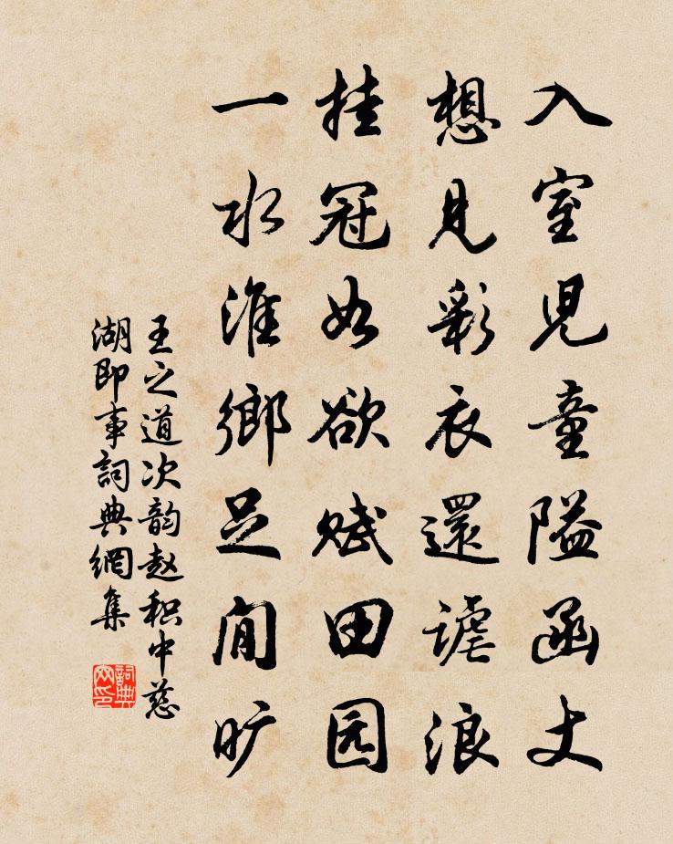 詩詞名句歷史字典書法欣賞書法字典國語詞典說文解字康熙字典古漢語字典標 題 作 者 詩 句 次韻趙積中慈湖即事作者:王之道 朝代:宋代次韻趙積中慈湖即事原文入室兒童隘函丈,想見彩衣還謔浪。掛冠如欲賦田園,一水淮鄉足閒曠。詩詞問答問:次韻趙積中慈湖即事的作者是誰?答:王之道問:次韻趙積中慈湖即事寫於哪個朝代?答:宋代王之道次韻趙積中慈湖即事書法欣賞次韻趙積中慈湖即事書法作品詩詞推薦座上復借韻送岢嵐軍通判葉朝奉蘇軾〔宋代〕雲間踏白看纏旗,莫忘西湖把酒時。夢裡吳山連越嶠,樽前羌婦雜胡兒。夕烽過後人初醉,春雁來時雪未滋。為問唐多令(城歸泊湖山)陳著〔宋代〕倦枕寄漁鄉。篷低被怯霜。月窺人、多少思量。自是欲眠眠不穩,禁聽得、雁聲雙。和夢早催行。歸來梅竹窗。小宋神宗光緒〔清代〕神宗本是英明主,安石原非側媚臣。 可惜有才偏執拗,終教新法病斯民。和趙宮管看梅三首蘇泂〔宋代〕縛屋疏疏傍柳塘,詩腸渾不畏田荒。今年天賜清修福,只晏梅花一味香。與歐陽伯威同飲遇卿江樓趙蕃〔宋代〕不上江樓又兩春,人間到處略知津。勞君置酒仍呼客,快語端能洗劫塵。雜曲歌辭。古別離孟雲卿〔唐代〕朝日上高台,離人怨秋草。但見萬里天,不見萬里道。君行本迢遠,苦樂良難保。宿昔夢同衾,憂心常傾倒。含酸四十二叔祖母劉氏太孺人輓詞楊萬里〔宋代〕夫人自七十,有母尚期頤。不遣千山訃,猶應一病遲。孝留天下口,身立女中師。到得君羹美,翻令穎谷悲。擬魏太子鄴中集詩 陳琳謝靈運〔南北朝〕袁本初書記之士,故述喪亂事多。皇漢逢屯邅,天下遭氛慝。董氏淪關西,袁家擁河北。單民易周章,窘身就羈勒復見官軍詩樓鑰〔宋代〕元帥平京邑,聲聲夾道聞。不圖當此日,復得見官軍。將鉞來何莫,壺漿意已勤。重瞻貔虎士,盡掃犬羊群。王旅歷代詩泰楊簡〔宋代〕始皇繼周稱皇帝,傳子胡亥為二世。子嬰灞上降漢王,四十餘年非久計。林正甫與子中春並命為御史正甫按刑浙東道別虞儔〔宋代〕銜命宮陵偶一回,山 * 上得徘徊。溟鵬好在思摶擊,乘雁何嘗計去來。萬壑千岩況秋色,明珠白璧更塵埃。相逢登塔二首袁燮〔宋代〕遠望巍峨聳百尋,今朝特達快登臨。最高未是真高處,無盡應須更盡心。挽湯丞相夫人二首項安世〔宋代〕冊府連天漢,恩榮四十年。山河開象服,夙夜贊合躔。鸞鵠諸孫峙,箕裘令子傅。夫人無一恨,可以見重泉。挽石應之提刑孫應時〔宋代〕芹泮清燈夜,山亭皂蓋春。重更雙使節,總為兩淮民。德意人人浹,工夫事事新。帝城車馬外,才此寄經論。憶江南馮延巳〔唐代〕今日相逢花未發,正是去年,別離時節。東風次第有花開,恁時須約卻重來。重來不怕花堪折,只怕明年,花發人塞上郭震〔唐代〕塞外虜塵飛,頻年出武威。死生隨玉劍,辛苦向金微。久戍人將老,長征馬不肥。仍聞酒泉郡,已合數重圍。夜坐觀小兒作擬毛詩欣然有賦陸游〔宋代〕北風城頭鼓紞紞,徂歲崢嶸正多感。老夫假寐角巾低,樨子高吟兩髦髧。衰遲笑我藏袖手,狂率憐渠滿軀膽。旋炊夜閱篋中書偶得李德遠數帖因思昔相從時所言陸游〔宋代〕早歲傳聞月旦評,殿門邂逅眼偏明。當時一坐推談止,今日叢林見話行。老臥煙村身偶在,夜開蠹紙淚如傾。豈知木蘭花(送張中行·般涉調)張先〔宋代〕插花勸酒鹽橋館。召節促行龍闕遠。吳船漸起晚潮生,蠻榼未空寒日短。慶門奕世隆宸眷。歸到月陂梅已綻。有情故相國潁公輓歌辭三首司馬光〔宋代〕儒衣臨絕塞,廟略運奇兵。緩帶羌塵靜,靈旗海霧清。公心結明主,陰德庇群生。名遂身仍退,人間五福並。名句推薦燕子歸來依舊忙。憶君王,月破黃昏人斷腸。謝克家《憶君王·依依宮柳拂宮牆》 臨下以簡,御眾以寬;罰弗及嗣,賞延於世。佚名《尚書·虞書·大禹謨》 高館張燈酒復清,夜鍾殘月雁歸聲。高適《夜別韋司士》 問姓驚初見,稱名憶舊容。李益《喜見外弟又言別》 誰教歲歲紅蓮夜,兩處沉吟各自知。姜夔《鷓鴣天·元夕有所夢》 教人學而執有命,是猶命人葆而去其冠也。墨子《墨子·48章 公孟》 愁顏與衰鬢,明日又逢春。戴叔倫《除夜宿石頭驛》 雲銷雨霽,彩徹區明。王勃《滕王閣序》 冉冉秋光留不住,滿階紅葉暮。李煜《謝新恩·冉冉秋光留不住》 朽木不可雕也,糞土之牆不可圬也!佚名《宰予晝寢》