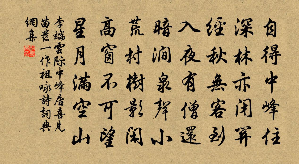 詩詞名句歷史字典書法欣賞書法字典國語詞典說文解字康熙字典古漢語字典標 題 作 者 詩 句 雲際中峰居喜見苗發(一作祖詠詩)作者:李端 朝代:唐代原文自得中峰住,深林亦閉關。經秋無客到,入夜有僧還。暗澗泉聲小,荒村樹影閒。高窗不可望,星月滿空山。詩詞問答問:《雲際中峰居喜見苗發(一作祖詠詩)》的作者是誰?答:李端問:該詩寫於哪個朝代?答:唐代書法欣賞雲際中峰居喜見苗發(一作祖詠詩)書法作品注釋全唐詩:卷285_138詩詞推薦頌古五十三首釋文禮〔宋代〕從來六個不知音,一個全拋惡浪深。義斷情忘無處覓,三千剎海冷沉沉。秋霽 繼古韻述懷王丹桂〔元代〕肥遁人家,對東南萬里、鯨海橫碧。蘭苑芝田,暖香風送,不滅鳳城春色。壽松徑里。綠茵嫩□紋如織。又還是。送程提乾趙蕃〔宋代〕尚書曾剖上饒符,我姊亦歸高郵掾。與公既親亦有故,此地經行幾相見。十年幕府持旌麾,日月計之無乃遲。治世憶秦娥許有壬〔元代〕山雞唱。少年中夜心悲壯。心悲壯。世間何事,不來眉上。迷途未遠奚惆悵。五湖煙水春搖盪。春搖盪。誰知平地詠史宋庠〔宋代〕袁褚才名自古稀,可嗟高節晚相違。遲行便足為丞相,枉受黃羅乳母衣。熙寧蜡祭十三首佚名〔宋代〕靈之來下,擴景乘光。靈之回御,景龍以驤。鑒我休德,降嘏產祥。大田多稼,以惠無疆。杏園(此後並校書郎已前詩)元稹〔唐代〕浩浩長安車馬塵,狂風吹送每年春。門前本是虛空界,何事栽花誤世人。頌古釋道顏〔宋代〕半夜墨漆黑,捉得一個賊。點火照來看,元是王大伯。丁巳春言事四歸和朱子云賜詩韻姚勉〔宋代〕鯉魚書來上誰字,鬥牛光中湖海士。梅花臘雪曾會面,桃李春風一彈指。剝書得詩意雄傑,鍾呂驚聞箏笛耳。懦夫田居四首秦觀〔宋代〕雞號四鄰起,結束赴中原。戒婦預為黍,呼兒隨掩門。犁鋤帶晨景,道路更笑喧。宿潦濯芒屨,野芳簪髻根。霽色閨怨四首趙蕃〔宋代〕紅芳不可待,綠蔭忽已成。妾貌愧花好,郎姿如柳明。寄溧水宰李仲鎮曹勛〔宋代〕不見李君久,水雲魚雁沉。調官聊制錦,得句剩關心。每訪民情悅,相望春事深。故鄉與賢者,北首重登臨。瓜趙汝績〔宋代〕冰泉浸綠玉,霜刃破黃金。涼冷消晚暑,清甘洗渴心。王方叔喪耦姜特立〔宋代〕人生大患身為素,火宅啼號更累身。聞道中郎唯有女,不妨半世作閒人。謝柳太博惠鶴范仲淹〔宋代〕新詩遺鶴指真經,對此仙標詎敢輕。萬里華亭思去伴,千年遼海識歸程。雞群與處曾非辱,鵬路將翔孰謂榮。獨愛甲午歲朝寓桂林,記去年是日泊桐江,謁嚴子范成大〔宋代〕去年曉纜解江皋,也把屠蘇泛濁醪。一席飽風漁浦闊,千山封雪釣台高。將軍老矣鳴孤劍,客子歸哉詠大刀。早晚減字木蘭花侯置〔宋代〕春酲拚卻。鶗鴂一聲花雨落。密炬紅殘。人在青羅步障間。天公薄相。慣得柳綿高百丈。彩筆題詩。休誦騷人九辨十六觀經頌上品中生釋遵式〔宋代〕不必受持方等經,解第一義明因果。紫金台現命終時,自見身於台上坐。自九里平水至雲門陶山歷龍瑞禹祠而歸凡四日陸游〔宋代〕細雨如絲映晚暉,店家小憩換征衣。春農耕罷負犁去,村社祭余懷肉歸。黃犢自依殘照臥,白鷗爭傍小灘飛。道邊李堅甫淨居雜題一十三首秋軒文同〔宋代〕清飈動蕭瑟,翠樾減婆娑。卻愛夜來月,滿窗寒影多。名句推薦榮非己莫恃,禍惟他勿縱。來俊臣《羅織經·瓜蔓卷第十二》 柏台霜威寒逼人,熱海炎氣為之薄。岑參《熱海行送崔侍御還京》 自昔佳人多薄命,對古來、一片傷心月。辛棄疾《賀新郎·用前韻送杜叔高》 石欄斜點筆,桐葉坐題詩杜甫《重過何氏五首》 快上西樓,怕天放、浮雲遮月。辛棄疾《滿江紅·中秋寄遠》 珠玉在側,覺我形穢。劉義慶《世說新語·容止》 金槳木蘭船,戲采江南蓮。劉孝威《採蓮曲·金槳木蘭船》 彊弩之極,矢不能穿魯縞;衝風之末,力不能漂鴻毛。司馬遷《史記·七十列傳·韓長孺列傳》 淮南秋雨夜,高齋聞雁來。韋應物《聞雁》 我心匪石,不可轉也。佚名《柏舟》
