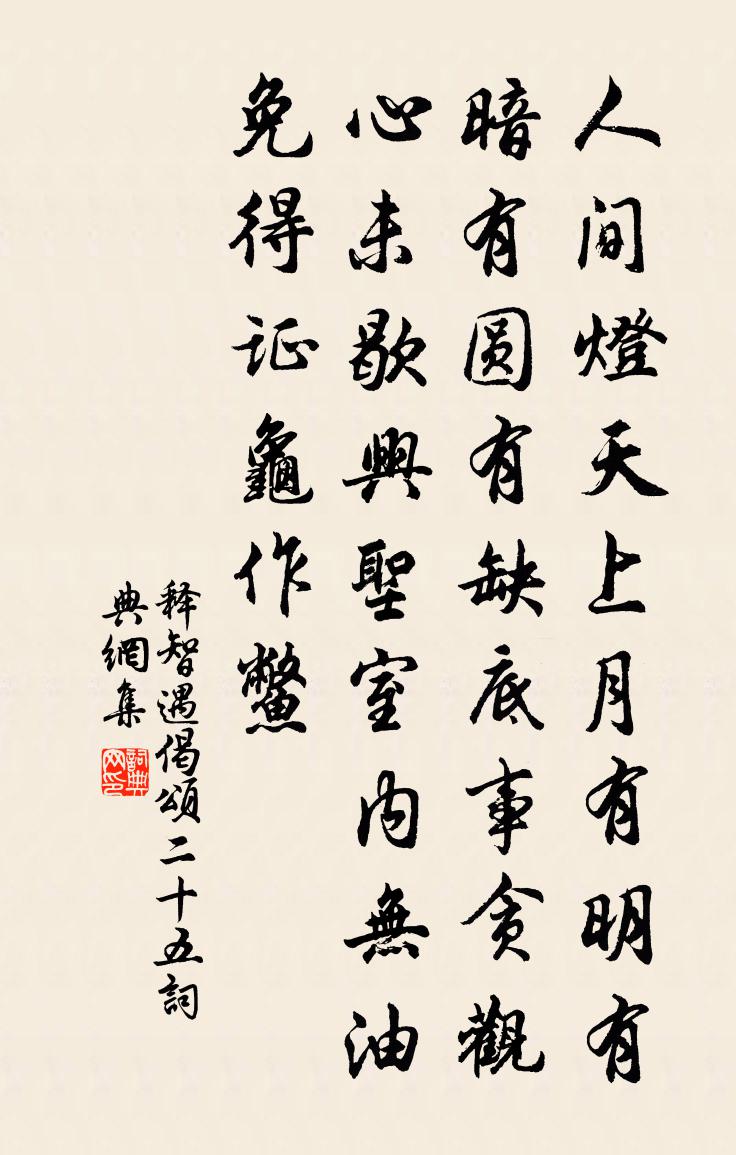 詩詞名句歷史字典書法欣賞書法字典國語詞典說文解字康熙字典古漢語字典標 題 作 者 詩 句 偈頌二十五作者:釋智遇 朝代:宋代偈頌二十五原文人間燈,天上月。有明有暗,有圓有缺,底事貪觀心未歇。興聖室內無油,免得證龜作鱉。詩詞問答問:偈頌二十五的作者是誰?答:釋智遇問:偈頌二十五寫於哪個朝代?答:宋代釋智遇偈頌二十五書法欣賞偈頌二十五書法作品詩詞推薦和學士吳元昭釋彌光〔宋代〕通身一穿金鎖骨,正眼觀來猶剩物。縱使當機覿面提,敢保敢士猶未徹。和郭帚齋詠龜泉劉黻〔宋代〕鎔出形模造化工,石龜中有冽泉通。來從西峽蝦蟆碚,靜鎮南源瑪瑙宮。潤澤一城消眾渴,澄波千古照孤忠。貪廉感舊寄上芸叟侍郎晁說之〔宋代〕於越茫茫羈旅久,函秦落落笑談中。曲江煙月新春夢,寒食人家故國風。此際一樽曾邂逅,他時相見更從容。丈人鷓鴣天王詵〔宋代〕才子陰風度遠關。清愁曾向畫圖看。山銜斗柄三星沒,雪共月明千里寒。新路陌,舊江乾。崎嶇誰嘆客程難。臨風送和甫至龍安微雨因寄吳氏女子王安石〔宋代〕荒煙涼雨助人悲,淚染衣巾不自知。除卻春風沙際綠,一如看汝過江時。洞天春侯善淵〔元代〕道要仙機,頓悟方知,物物盡捐。見本來一性,沖開昊境,朗如秋月,清似寒泉。湛湛澄澄,纖塵不染,出入龍鄉題李昭訓山水牟融〔唐代〕卜築藏修地自偏,尊前詩酒集群賢。半岩松暝時藏鶴,一枕秋聲夜聽泉。風月謾勞酬逸興,漁樵隨處度流年。南州依韻奉和永叔感興五首梅堯臣〔宋代〕唧唧復唧唧,長沙何太息。秋風入破衣,瘦婦思補刺。手中把長線,無帛縫不得。夜夜憂向寒,斗柄漸垂北。嫁夫得曾蛩秀才所附滁州歐陽永叔書答意梅堯臣〔宋代〕客從淮上來,往問故人信。袖銜藤紙書,題字遠已認。既喜開其封,固覺減吾吝。新詩不作寄,乃見子所慎。向來為客何應龍〔宋代〕初秋為客暮秋歸,一檐輕囊半是詩。試問客情何處惡,五更孤店酒醒時。命里文天祥〔宋代〕熊羆十萬建行台,單騎誰教免胄來。一日捉將沙漠去,遭逢碧眼老回回。崔文學甲攜文見過蕭然有出塵之姿問之則孫介蘇軾〔宋代〕象服盛簪珥,豈是邢夫人。敝衣破冠履,可憐范叔貧。君看崔員外,晚就觀國賓。當年頗赫赫,翁媼爭為姻。(事新亭梅偶作吳則禮〔宋代〕衡門宿昔只棲遲,慚愧三堂春事奇。為有叢筠傍流水,故教疏影作橫枝。香羅未辦凌波去,素魄休論啼鴃時。乞與偈頌一百五十首釋心月〔宋代〕四月十五,雲龍風虎。掃蕩欃槍,肅清寰宇。五月十五,松巒竹塢。明月作龕,白雲閉戶。即今六月十五,毒蛇橫和樂天秋涼閒臥劉禹錫〔唐代〕暑退人體輕,雨餘天色改。荷珠貫索斷,竹粉殘妝在。高僧掃室請,逸客登樓待。槐柳漸蕭疏,閒門少光彩。贈玉隆都監周抱一姚勉〔宋代〕一別丹霞洞,何年到此邦。犬隨燒藥鼎,鶴伴改詩窗。談柄風生席,清標月在江。西山聞欲隱,來訪鹿門龐。洞仙歌(梅)晁補之〔宋代〕年年青眼。為江梅腸斷。一句新詩思無限。向碧瓊枝上,白玉葩中、春猶淺。一點龍香清遠。誰拋傾國艷。昨夜前夜宴惜別白居易〔唐代〕笙歌旖旎曲終頭,轉作離聲滿座愁。箏怨朱弦從此斷,燭啼紅淚為誰流?夜長似歲嘆宜盡,醉未如泥飲莫休。何況枕上陸游〔宋代〕窗紙蕭蕭印月痕,數聲新雁過江村。孤愁不與夢俱斷,羸老豈知身尚存?世事萬端歸蠹簡,秋風百感集清樽。荷鋤漁具詩笭箵陸龜蒙〔唐代〕誰謂笭箵小,我謂笭箵大。盛魚自足餐,寘璧能為害。時將刷蘋浪,又取懸藤帶。不及腰上金,何勞問蓍蔡。名句推薦良禽擇木而棲,賢臣擇主而事。羅貫中《三國演義·第三回》 梅子黃時日日晴,小溪泛盡卻山行曾幾《三衢道中》 一事真,百事真。馮夢龍《醒世恆言·卷十六》 轡壓馬頭金錯落,鞍籠駝背錦斕班。金德淑《望江南·春睡起》 大道如青天,我獨不得出。李白《行路難三首》 候館梅殘,溪橋柳細。歐陽修《踏莎行·候館梅殘》 近來何處有吾愁,何處還知吾樂。辛棄疾《念奴嬌·賦雨岩》 半死梧桐老病身,重泉一念一傷神。白居易《為薛台悼亡》 害人之心不可有,防人之心不可無!佚名《增廣賢文·下集》 猶喜閏前霜未下,菊邊依舊舞身輕。司空圖《白菊三首》