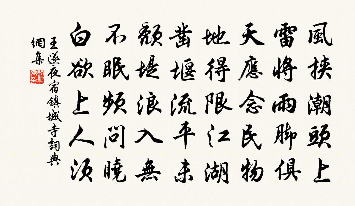 詩詞名句歷史字典書法欣賞書法字典國語詞典說文解字康熙字典古漢語字典標 題 作 者 詩 句 夜宿鎮城寺作者:王遂 朝代:宋代夜宿鎮城寺原文風挾潮頭上,雷將雨腳俱。天應念民物,地得限江湖。鑿堰流平未,頹堤浪入無。不眠頻問曉,白欲上人須。詩詞問答問:夜宿鎮城寺的作者是誰?答:王遂問:夜宿鎮城寺寫於哪個朝代?答:宋代王遂夜宿鎮城寺書法欣賞夜宿鎮城寺書法作品詩詞推薦和李校書新題樂府十二首立部伎元稹〔唐代〕胡部新聲錦筵坐,中庭漢振高音播。太宗廟樂傳子孫,取類群凶陣初破。戢戢攢槍霜雪耀,騰騰擊鼓雲雷磨。初疑桂隱紀詠茂光台張鎡〔宋代〕風日清美時,月露澄爽際。能來此徜徉,掃除聞見翳。胡地曲王鎡〔宋代〕槍旗獵獵動風纓,土雨如雲殺氣腥。認得打圍枯草際,霜雕飛趁海東青。故蘄州玉刑部閣老輓歌五首楊億〔宋代〕奏稿應盈篋,藏書復幾車。門人誰漬酒,天子想投瓜。旅櫬關山闊,銘旌道路賒。趨庭有令子,清白自傳家。示張子昭朱昱〔宋代〕西日未心東雨來,南軒相對北窗開。茫茫移穴蟻旋磨,擾擾出檐蚊聚雷。三宿定成桑下戀,一篇聊向雨中催。忘形贈張南史錢起〔唐代〕紫泥何日到滄洲,笑向東陽沈隱侯。黛色晴峰雲外出,縠文江水縣前流。使臣自欲 * 道,才子非關厭薄游。溪畔春莫雙清亭小酌懷張孟幼宋褧〔元代〕二十年前入汴州,梵王仙館涉春秋。家家庭院森湖玉,處處簾櫳映海榴。金馬石渠傷遠別,丘山華屋動新愁。誰憐送丘丹歸江東李端〔唐代〕故山霜落久,才子憶荊扉。旅舍尋人別,秋風逐雁歸。夢愁楓葉盡,醉惜菊花稀。肯學求名者,經年未拂衣。題郁孤台文天祥〔宋代〕城郭春聲闊,樓台晝影遲。並天浮雪界,蓋海出雲旗。風雨十年夢,江湖湖城思。倚闌時北顧,空翠濕朝曦。度關山曹操〔魏晉〕天地間,人為貴。立君牧民,為之軌則。車轍馬跡,經緯四極。黜陟幽明,黎庶繁息。於鑠賢聖,總統邦域。封建題枯嶁圖馮楫〔宋代〕形骸在此,其人何在。乃知一靈,不屬皮袋,張思濟縣尉創舞翠亭袁說友〔宋代〕新築成時秋事高,滿天風下岧嶢。佳名欲奪雙溪景,淡墨須煩六幅綃。一簇穿楊夸箭羽,幾番伐鼓動溪潮。此亭政逆旅行陸游〔宋代〕古者謂死為歸人,此身未死均是客。家為逆旅身在途,久寓遽歸初不擇。逆旅相看隨薄厚,非意相干寧足責?世間酬新仲見和二首胡寅〔宋代〕自喜逢端友,初蒙賞異收。不議吾好辯,更請慎其餘。術業須三代,宗風謝一如。與公俱目擊,紙上亦蘧廬。中書侍郎贈銀青光祿大夫傅欽之輓辭三首蘇頌〔宋代〕平生出處與迍通,五十年中事事同。晚歲金門陪末議,一朝華簀見將終。晉賢已失蒼生望,魯國還嗟我道窮。衰病陪王卿郎中游南池韋應物〔唐代〕鵷鴻俱失侶,同為此地游。露浥荷花氣,風散柳園秋。菸草凝衰嶼,星漢泛歸流。林高初上月,塘深未轉舟。清言錢舜舉瓜畫方回〔宋代〕老錢工作趙昌花,殘綠依稀姤五瓜。正叔晦翁凡六說,始知輔嗣大爭差。六合道中劉過〔宋代〕十年曾記此來游,有策中原一戰收。蒲柳易凋嫌勢去,金湯無用卒和休。非風仿佛鳴刁斗,缺月參差照敵樓。廟食十離詩。珠離掌薛濤〔唐代〕皎潔圓明內外通,清光似照水晶宮。只緣一點玷相穢,不得終宵在掌中。風李商隱〔唐代〕撩釵盤孔雀,惱帶拂鴛鴦。羅薦誰教近,齋時鎖洞房。名句推薦勿貪意外之財,勿飲過量之酒。朱柏廬《朱子家訓·全文》 笑殺陶淵明,不飲杯中酒。李白《嘲王歷陽不肯飲酒》 今夜不知何處宿,平沙萬里絕人煙。岑參《磧中作》 遊子春衫已試單,桃花飛盡野梅酸。吳濤《絕句·遊子春衫已試單》 相思無因見,悵望涼風前。李白《折荷有贈》 此馬非凡馬,房星本是星。李賀《馬詩二十三首·其四》 知恩不報,非為人也。施耐庵《水滸傳·第二十回》 落霞與孤鶩齊飛,秋水共長天一色。王勃《滕王閣序》 迴廊一寸相思地,落月成孤倚。納蘭性德《虞美人·銀床淅瀝青梧老》 鄉書何處達?歸雁洛陽邊。王灣《次北固山下》