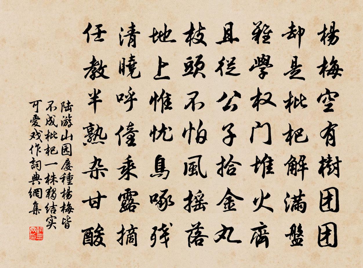 楊梅空有樹團團,卻是枇杷解滿盤。難學權門堆火齊,且從公子拾金丸。