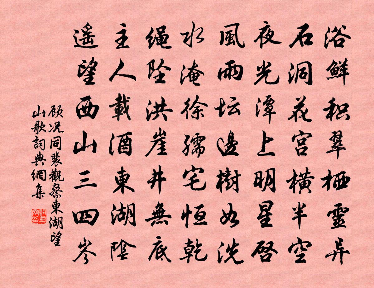 詩詞名句歷史字典書法欣賞書法字典國語詞典說文解字康熙字典古漢語字典標 題 作 者 詩 句 同裴觀察東湖望山歌作者:顧況 朝代:唐代同裴觀察東湖望山歌原文浴鮮積翠棲靈異,石洞花宮橫半空。夜光潭上明星啟,風雨壇邊樹如洗。水淹徐孺宅恆乾,繩墜洪崖井無底。主人載酒東湖陰,遙望西山三四岑。詩詞問答問:同裴觀察東湖望山歌的作者是誰?答:顧況問:同裴觀察東湖望山歌寫於哪個朝代?答:唐代問:同裴觀察東湖望山歌是什麼體裁?答:七古顧況同裴觀察東湖望山歌書法欣賞同裴觀察東湖望山歌書法作品注釋全唐詩:卷265_18詩詞推薦感春連文鳳〔宋代〕賞心未足事多違,啼鳥聲聲怨夕暉。客夢一番芳草歇,人生幾度落花飛。病難為別鄉情遠,老不禁愁酒力微。猶記偈頌九十三首釋梵琮〔宋代〕雲霞飛片片,流水自茫茫。剪斷五色線,補作春衣裳。知有者全身披搭,不知有者且莫輕狂。莫莫莫莫,老僧與汝辛酉除夕陸游〔宋代〕衰境遇白雞,自分墮幽墟;造物偶見寬,俯仰復歲除。駸駸迫耄期,凜凜無根株,孰知尚堅頑,壯者有不如。銅瓶題許介之詩草劉克莊〔宋代〕我留鳶跕外,君住雁回邊。走仆行千里,敲門授一編。真妍非粉黛,至巧謝雕鐫。何必周丞相,男兒要自傳。送千乘千能兩侄還鄉蘇軾〔宋代〕治生不求富,讀書不求官。譬如飲不醉,陶然有餘歡。君看龐德公,白首終泥蟠。豈無子孫念,顧獨遺以安。鹿門句李簡〔宋代〕向來紅與紫,隨流去如雲。雖有故枝在,花落何紛紛。次盧國華提刑所寄韻樓鑰〔宋代〕持節歸來上粉闈,只今一節又何之。樂天好句追長慶,元亮高風挹義熙。我恨別多仍會多,君雖去速豈來遲。閩山秋興亭韓揚〔宋代〕賈載嘗為郡,名亭建此邦。近山連大別,遠水接長江。待月憑東檻,來薰起北窗。四時皆有興,秋興獨難降。用東坡三峽橋韻贈源上人王之道〔宋代〕解衣振林霏,欹枕聽檐溜。飢腸欲雷鳴,病耳忽牛斗。自嗟兵火余,十載困難右。崎嶇窮水石,邂逅遍岩竇。山游梅花十詠欲開張至龍〔宋代〕凝成姑射姿,幽潔世所獨。春近迫芳心,羞澀破唇玉。宿鄭州王維〔唐代〕朝與周人辭。暮投鄭人宿。他鄉絕儔侶。孤客親僮僕。宛洛望不見。秋霖晦平陸。田父草際歸。村童雨中牧。主人東都冬日會諸同年宴鄭家林亭(得先字)白居易〔唐代〕盛時陪上第,暇日會群賢。桂折因同樹,鶯遷各異年。賓階紛組佩,妓席儼花鈿。促膝齊榮賤,差肩次後先。助歌包顒叟輓詞二首葉適〔宋代〕風沙江上宅,斥鹵望中村。密竹元遮徑,崇蘭早映門。笑談看磊落,材力可騰掀。誰復知心事,滄波霧雨昏。同鄭子野訪王隱居戴復古〔宋代〕聯騎來尋失馬翁,相期投宿此山中。一庭花影三更月,萬壑松聲半夜風。共把酒杯眠不得,劇談世事恨無窮。明朝寄蕭大山兄弟樂雷發〔宋代〕梅花好處共心期,曾擷天葩寄夢思。兄弟自為千古計,江湖方誦二蕭詩。貪泉定喜逢廉吏,倭國何因拜老師。剩擬重雲李觀疾贈之韓愈〔唐代〕夭行失其度,陰氣來乾陽。重雲閉白日,炎燠成寒涼。小人但咨怨,君子惟憂傷。飲食為減少,身體豈寧康。此志櫟閘吳大帝廟樂雷發〔宋代〕赤壁濡須事已虛,且依櫟閘酹芳壺。九原尚擬吞銅雀,千載今惟記赤烏。湘浦有人修舊祀,荊州無地展雄圖。定知費壺天人一理堂連文鳳〔宋代〕高高下下兩無窮,盡在壺天一色中。俯仰不堪供一笑,何當相與問洪蒙。益壽美金花侯善淵〔元代〕除貪絕愛。性靜心清明寶界。寶界華陽。換質琅然雪隱霜。虛白晃耀。軒外澄神憑自照。照破昏衢。顯出圓通五彩紫陽觀和家兄作陳阜〔宋代〕相將到靈觀,正值雨初晴。花近香逾妙,峰遙色更清。鶴盤雲外影,磬和澗中聲。再拜真人像,還丹願指明。名句推薦步轉迴廊,半落梅花婉娩香。蘇軾《減字木蘭花·春月》 大丈夫處世,當埽除天下范曄《後漢書·列傳·陳王列傳》 善有善報,惡有惡報。不是不報,時候未到。佚名《增廣賢文·上集》 深村時節好,應為去年豐。范成大《寒食郊行書事》 名利之不宜得者竟得之,福終為禍;困窮之最難耐者能耐之,苦定回甘。王永彬《圍爐夜話·第十則》 流丸止於甌臾,流言止於知者。荀子《荀子·大略》 誰向若耶溪上,倩美人西去,麋鹿姑蘇。辛棄疾《漢宮春·會稽蓬萊閣懷古》 渭北春天樹,江東日暮雲。杜甫《春日憶李白》 浮雲不系名居易,造化無為字樂天李忱《吊白居易》 士有妒友,則賢交不親。荀子《荀子·大略》