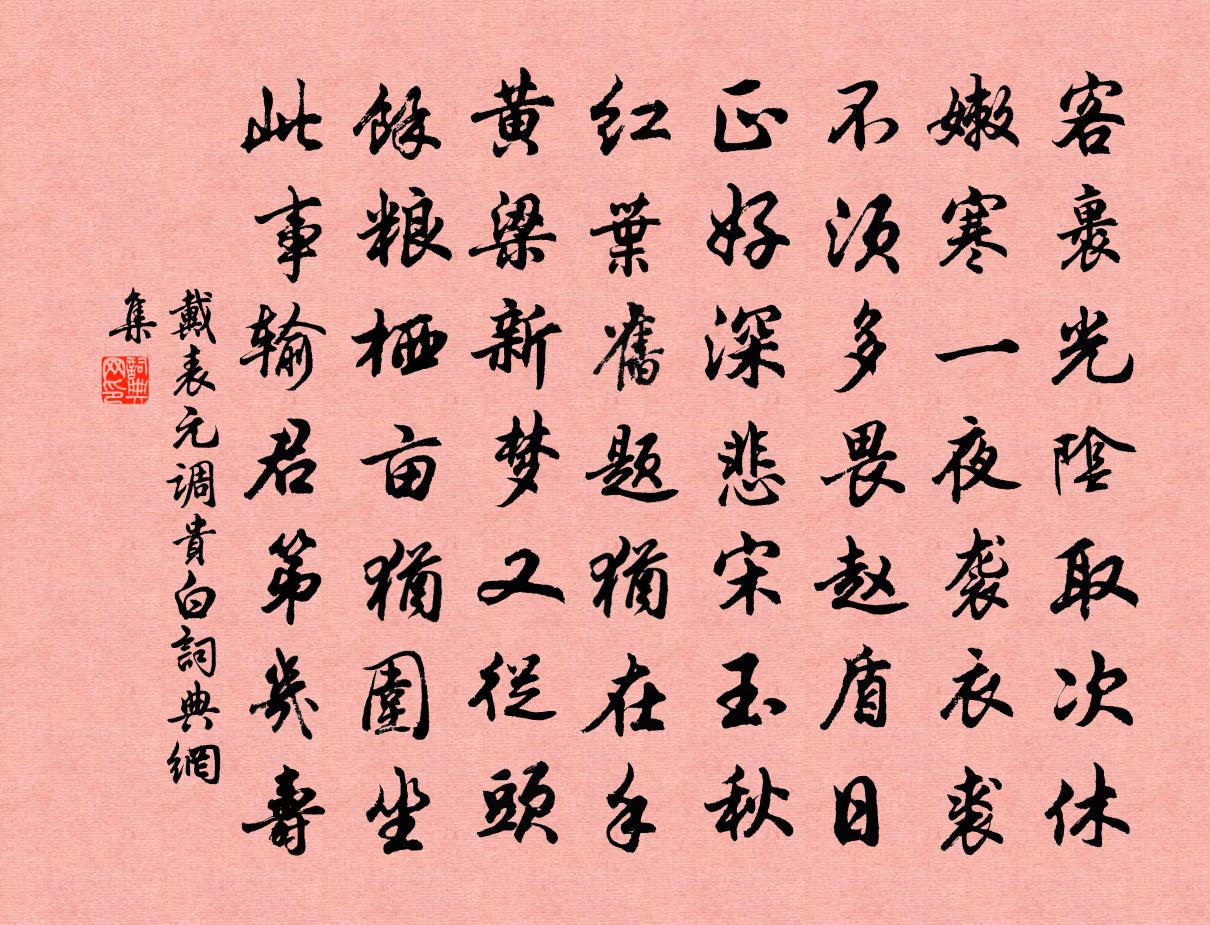 詩詞名句歷史字典書法欣賞書法字典國語詞典說文解字康熙字典古漢語字典標 題 作 者 詩 句 調貴白作者:戴表元 朝代:宋代調貴白原文客裹光陰取次休,嫩寒一夜襲衣裘。不須多畏趙盾日,正好深悲宋玉秋。紅葉舊題猶在手,黃梁新夢又從頭。餘糧棲畝猶圍坐,此事輸君第幾壽。詩詞問答問:調貴白的作者是誰?答:戴表元問:調貴白寫於哪個朝代?答:宋代戴表元調貴白書法欣賞調貴白書法作品詩詞推薦時事感慨王同祖〔宋代〕壯心如鐵氣填膺,萬里中原尚虜塵。一枕西風兩行淚,封疆誰是死綏人。賀收復秦原諸州詩白敏中〔唐代〕一詔皇城四海頒,醜戎無數束身還。戍樓吹笛人休戰,牧野嘶風馬自閒。河水九盤收數曲,天山千里鎖諸關。西邊四月上澣日同寮約游西湖十絕張鎡〔宋代〕豐樂樓前未夕暉,可堪魚鑰限城扉。詩成快向歸時寫,丹墨明朝與興違。彭城三詠之一戲馬台歌賀鑄〔宋代〕秦蛇已中斷,劉項方龍戰。叱吒沮風雲,睢盱走霆電。鴻溝一畫天地開,楚王洗劍東歸來。新都形勝控淮泗,籠山感舊張良臣〔宋代〕三十六陂春水綠,四十九年人事非。楊子江頭永嘉後,吳儂盪槳北人稀。復賦河冰四絕蘇轍〔宋代〕輕紈破碎佩環流,顛倒鏘鳴亂觸舟。解紼投篙曾不顧,不知何處擁汀洲。登丹陽樓(一作郎士元詩)張繼〔唐代〕寒皋那可望,旅客又初還。迢遞高樓上,蕭疏涼野間。暮晴依遠水,秋興屬連山。浮客時相見,霜凋朱翠顏。送青陽上人游越孟郊〔唐代〕秋風吹白髮,微官自蕭索。江僧何用嘆,溪縣饒寂寞。楚思物皆清,越山勝非薄。時看鏡中月,獨向衣上落。多謝昔陳北山趙南塘二老各有觀物十詠筆力高妙暮劉克莊〔宋代〕天不生斯物,將如凍者何。為誰忙作繭,到底化為蛾。種至春還育,功於世最多。香閨不知織,歲歲賜香羅。除夜寄羅評事同年王禹偁〔宋代〕除夜在天涯,共君同憶歸。夢中傾壽酒,堂下著斑衣。臘雪通宵舞,梅花到處飛。更堪洞庭宿,愁思倍依依。立春內中帖子詞夫人閣王珪〔唐代〕金縷新幡翠鳳翹,側商催酒轉宮腰。玉欄風急花零亂,始覺春寒第一朝。緣識宋太宗〔宋代〕如來千百億,化身本是真。駈駈煩惱不解嗔,我不能談說,沿舊卻知新。挽陳司直二首劉克莊〔宋代〕隆乾事契姑休論,歲晚相看成兩翁。吾女偶沾郊霈下,君兒亦脫縣灘中。清伊高會耆英少,碧瀨新丘伉儷同。我有送蔡元翰賢良昆仲宋祁〔宋代〕美箭出東南,之子裒然秀。綽綽令兄弟,茂器偕年就。九流無近討,六藝乃遐究。詔書求異等,二惠茲來觀。牘均養家苦馬鈺〔元代〕思微妙,想塵緣。兩般搜尋要精研。但知空,向道堅。心清淨,意通玄。自然知道沒言傳。達無為,作大仙。謝楊履道送銀茄四首黃庭堅〔宋代〕白金作顆非椎成,中有萬粟嚼輕冰。戎州夏畦少蔬供,感君來飯在家僧。偈傾一百三十三首釋法薰〔宋代〕前佛紀綱,後佛性命。衲僧腰間古曆日,定是三年逢一閏,不知東平打破鏡。送何子溫移亳州三首陳師道〔宋代〕青衿曾誦賦,皓首始登門。意得寧論晚,心交不待言。向來期北上,可復改南轅。畫地數佳政,叢談何處村。游長蘆李流謙〔宋代〕他年天眼識褕褘,千柱如今鏁夕暉。笑說老禪操一葦。戲呼靈媼授三歸。波濤齧岸蛟龍惡,荻竹抽萌鱠縷肥。曲水題王德淵水西藁舒岳祥〔宋代〕子有婉微句,藏之平淡間。想子無慍色,熙熙發容顏。吉人罕暴戾,詳緩心自閒。吾知子用意,欲拘陶韋還。欲以名句推薦自是人生長恨水長東。李煜《相見歡·林花謝了春紅》 今朝有酒今朝醉,明日愁來明日愁。羅隱《自遣》 春秋代序,陰陽慘舒,物色之動,心亦搖焉。劉勰《文心雕龍·物色》 田田初出水,菡萏念嬌蕊。龔翔麟《菩薩蠻·題畫》 以小人之慮,度君子之心。劉義慶《世說新語·雅量》 憶昔霍將軍,連年此征討。高適《登百丈峰二首》 霜雪兮漼溰,冰凍兮洛澤。王逸《九思》 棘枝風哭酸,桐葉霜顏高。孟郊《秋懷十五首》 雨過月華生,冷徹鴛鴦浦。柳永《甘草子·秋暮》 紅燭背,繡簾垂,夢長君不知。溫庭筠《更漏子·柳絲長》