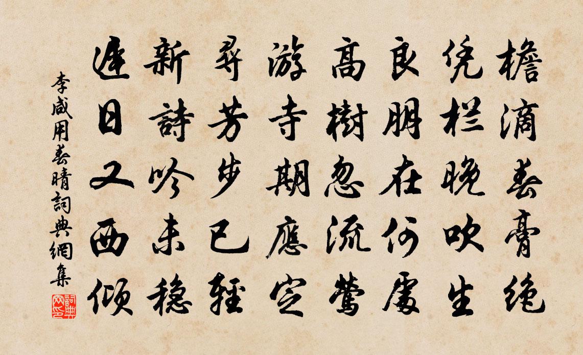 詩詞名句歷史字典書法欣賞書法字典國語詞典說文解字康熙字典古漢語字典標 題 作 者 詩 句 春晴作者:李鹹用 朝代:唐代春晴原文檐滴春膏絕,憑欄晚吹生。良朋在何處,高樹忽流鶯。游寺期應定,尋芳步已輕。新詩吟未穩,遲日又西傾。詩詞問答問:春晴的作者是誰?答:李鹹用問:春晴寫於哪個朝代?答:唐代問:春晴是什麼體裁?答:五律李鹹用春晴書法欣賞春晴書法作品注釋全唐詩:卷645-50詩詞推薦讀謝安傳黃庭堅〔宋代〕傾敗秦師琰與玄,矯情不顧驛書傳。持危又幸桓溫死,太傅功名亦偶然。寄江西魏按察李思衍〔宋代〕雙氣光收紫氣沈,六絲轡動使華臨。寒生柏府風霜面,清照梅花玉雪心。一道秋江澄濁浪,千崖曉色破頑陰。水天延陵道中即事三絕朱南傑〔宋代〕小立青簾賣酒家,味雖薄薄勝空茶。今年春滿疏籬外,數輕紅出杏花。題孫方叔石泉亭黎廷瑞〔宋代〕君不見山上石,可以搘明堂而柱宣室。又不見石上泉,可以蘇大旱而至豐年。君隱非山隱於市,安有萬丈蒼崖千太燈花石延年〔宋代〕回鱗抱雙蒂,倒鳳吐丹榮。冰宇寒生暈,風疏動有聲。燼垂金藕細,影透玉荷清。斗帳依東壁,誰人夢不成。宿芙蓉驛方岳〔宋代〕鳳皇山下芙蓉驛,零落殘碑半蝕苔。黃鳥有時穿戶過,青山地數摺溪回。麥秋天氣半明暗,蠶月人家忌往來。俯仰了恩典座釋祖欽〔宋代〕十二時中,承誰恩力。俯仰折旋,不須外覓。著衣吃飯,一了便了。開眼天明,是誰不曉。大地沙門隻眼睛,丈六題靈陽宮李覯〔宋代〕費君投杖處,行客過彷徨。水面風雷散,沙頭草木荒。一壺誰世界,千古共淒涼。大塊偏勞我,燒丹未有方。六州歌頭(吊武穆鄂王忠烈廟)李訦〔宋代〕高皇神武,善駕馭豪英。攘北狄,驅群盜,命天膺。救蒼生。奈夢繞沙漠,隔溫情,屈和好,召大將,歸兵柄,列次劉孟元見贄韻二首羅椅〔宋代〕不見碧瑤叟,年齡二十餘。兒今亦耆舊,孫復抱詩書。後浪催人老,長箋不我疏。眼中誰有此,雅雅更魚魚。贈瑄上人王灼〔宋代〕諸公爭談詩,健舌秋河傾。袖手但兀坐,欲語不敢聲。獨喜圓顱師,嗜好與我並,相見不言他,古律同細評。愛惜題延慶觀六時泉王之望〔宋代〕千尺高崖屏翠琰,六時甘露雨真珠,梯岩穿壑身親到,始信仙靈境界殊。秋夜舟中作趙湘〔唐代〕酒醒身計正悠悠,澤國如萍信水流。獨夜聽鴻深浦宿,壞篷連雨一燈秋。年來自覺新詩澹,江上誰憐舊業優。腸斷題孟處士宅張祜〔唐代〕高才何必貴,下位不妨賢。孟簡雖持節,襄陽屬浩然。皇甫郎中親家翁赴任絳州宴送出城贈別白居易〔唐代〕慕賢入室交先定,結援通家好復成。新婦不嫌貧活計,嬌孫同慰老心情。洛橋歌酒今朝散,絳路風煙幾日行?欲識送大淵宰安溪七言三首劉克莊〔宋代〕吾觀明府毫端妙,傳得尊公肘後方。番俗尚歌漢東柳,莆人不剪召南棠。威驅未若心懷惠,內荏徒然外抑強。想見送彭大老提舶泉南孫應時〔宋代〕眼觀榮辱等虛空,強著衣冠與世同。長夏清風秋夜月,高懷應不忘山中。顛危劉克莊〔宋代〕老梢慮航危,隆棟憂廈顛。危欠維楫爾,顛將覆壓焉。次韻蘇必強見寄李新〔宋代〕不積暗室鬼揶揄,曾入魚鳧伴蠹書。分背雁音清漢遠,動簾風竹故人疏。小桃煙老三年樹,白馬原空百兩車。消去句錢惟演〔宋代〕朱飾兩輪巡屬邑,案留雙筆在中台。名句推薦已是黃昏獨自愁,更著風和雨。陸游《卜運算元·詠梅》 天不再與,時不久留,能不兩工,事在當之。呂不韋《呂氏春秋·覽·孝行覽》 焉知後之視今,不如今之視昔也?王通《中說·卷七·述史篇》 天有陰陽風雨晦明之氣,人有喜怒哀 樂好惡之情。魏徵《隋書·志·卷二十九》 秋風蕭瑟,洪波湧起。曹操《觀滄海 / 碣石篇》 冰骨清寒瘦一枝。玉人初上木蘭時。吳文英《浣溪沙·題李中齋舟中梅屏》 湘西一杯酒,渺渺紅葉換。趙蕃《次韻酬吳德夫去秋送行之作》 佳人應怪我,別後寡信輕諾。柳永《尾犯·夜雨滴空階》 紅葉晚蕭蕭,長亭酒一瓢。許渾《秋日赴闕題潼關驛樓 / 行次潼關逢魏扶東歸》 扁舟昨泊,危亭孤嘯,目斷閒雲千里。吳潛《鵲橋仙·扁舟昨泊》