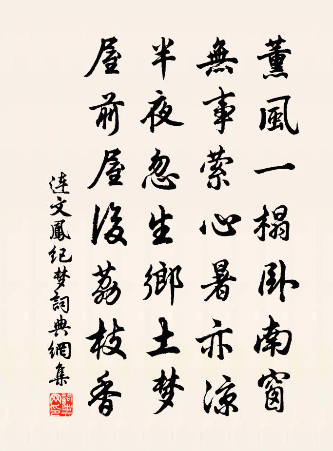 詩詞名句歷史字典書法欣賞書法字典國語詞典說文解字康熙字典古漢語字典標 題 作 者 詩 句 紀夢作者:連文鳳 朝代:宋代紀夢原文薰風一榻臥南窗,無事縈心暑亦涼。半夜忽生鄉土夢,屋前屋後荔枝香。詩詞問答問:紀夢的作者是誰?答:連文鳳問:紀夢寫於哪個朝代?答:宋代連文鳳紀夢書法欣賞紀夢書法作品詩詞推薦西江月姬翼〔元代〕莫問丹砂鉛鼎,休披虎繞龍蟠。中間妙處自相謾。業識忙忙不算。六欲七情灰滅,五行四象雲攢。放行收聚一團欒竹枕朱翌〔宋代〕方床洗湘斑,夏簟織蘄笛。誰與同臥起,青 * 甚相得。嘉哉直節君,契分近愈密。深林捕貓頭,乃復枕上膝。直見懷李處權〔宋代〕飄零吾老矣,詩酒得斯人。邂逅干戈際,殷勤骨肉親。錦囊元紙俗,瓊樹舊無塵。歸棹荷花里,從誰問玉津。早發始興江口至虛氏村作宋之問〔唐代〕候曉逾閩嶂,乘春望越台。宿雲鵬際落,殘月蚌中開。薜荔搖青氣,桄榔翳碧苔。桂香多露裛,石響細泉回。抱葉庚申日戲題陳棣〔宋代〕多情節物苦撩人,用事葩華巧鬭新。老去唯愁添甲子,年來不獨畏庚申。身閒淡淡心機靜,夢好齁齁鼻息勻。政使頌釋智同〔宋代〕雲門透法身,法身何許人。雁回沙塞北,鸚鵡慕西秦。代結客少年場行鮑照〔南北朝〕驄馬帶金絡頭帶。錦帶佩吳鉤。失意杯帶間。 * 起相讎。追兵一旦至。負劍遠行游。去鄉三十載。復得還舊丘。漢宮人入道戴叔倫〔唐代〕蕭蕭白髮出宮門,羽服星冠道意存。霄漢九重辭鳳闕,雲山何處訪桃源。瑤池醉月勞仙夢,玉輦乘春卻帝恩。回首初二日復雨偶成趙蕃〔宋代〕秋旱連冬勢未平,何斯小雨趁元正。休論忽忽生為樂,且對欣欣木向榮。已分終身樂貧賤,自無岐路覓功名。獨於蘭亭序墨本羅頌〔宋代〕文皇嗜好非聲色,偶愛蘭亭亦其癖。河南猶恐後來聞,竟使昭陵餓真跡。世閒能悟知幾人,墨本珍傳意愈勤。有似大享先玄酒陳杰〔宋代〕大享先玄酒,嘉賓貴食蒿。不無籩豆實,正有澗溪毛。歲未登三鬴,家安取百牢。充庭君試數,一一是民膏。游楚州天慶觀觀高道士琴棋張耒〔宋代〕頹垣蒼蒼鎖喬木,草滿荒庭不容足。壞檐破壁秋雨余,蛛網蕭蕭風滿屋。黃衣道人出迎客,野態生疏脫拘束。圍棋上巳游東禪詩王逵〔宋代〕紫陌破清晨,雕鞍映畫輪。因修洛陽禊,重憶永和春。錦鄉荀香度,樓台梵宇新。忙中得間暇,來見解空人。和傅寺丞竹穩之什暖紅陳宓〔宋代〕勁節歲寒碧,芳枝春暖紅。清和夷惠德,千載尚聞風。和趙周錫制乾峽中韻四首袁說友〔宋代〕急峽高流日夜東,嵌空怪石浪穿礲。濤喧灘口波翻雪,雲斷山腰氣吐虹。幾陣堂堂峰硉矹,一泉滴滴水玲瓏。我行秋懷十首末章稍自振起亦古義也陸游〔宋代〕雨滴大梧葉,風轉孤蓬窠,秋色固悽愴,二物感人多。日月行黃道,倏過如飛梭,大計百年間,貴賤俱銷磨。東家和王道父山歌二首楊萬里〔宋代〕種田不收一年事,取婦不著一生貧。風吹白日漫山去,老卻郎時懊 * 。錢塘人來方回〔宋代〕宿收家信醉慵開,早報潮船泊岸隈。釣瀨兒將詩篋至,錢塘人索酒錢來。道途奔走動千里,時節挨排聊一杯。新歲省中當直即事書懷兼簡閣長李舍人楊億〔宋代〕兩掖深沉大帝居,紫微西省掌泥書。天閽啟鑰趨朝後,侍史焚香起草初。五吏援毫才患少,萬錢分膳食無餘。鳳池駕自啟聖還內王安石〔宋代〕衣冠原廟漢家儀,羽衛親來此一時。天子當懷霜露感,都人亦嘆鼓簫悲。紛紛瑞氣隨雲漢,漠漠榮光上日旗。塵土名句推薦天明登前途,獨與老翁別。杜甫《石壕吏》 澤國江山入戰圖,生民何計樂樵蘇。曹松《己亥歲二首·僖宗廣明元年》 孤村芳草遠,斜日杏花飛。寇準《江南春·波渺渺》 君子愛財,取之有道。佚名《增廣賢文·上集》 客從遠方來,遺我雙鯉魚。佚名《飲馬長城窟行》 新知遭薄俗,舊好隔良緣。李商隱《風雨》 可憎者,人情冷暖;可厭者,世態炎涼。程登吉《幼學瓊林·卷一·歲時》 秋風吹到江村,正黃昏,寂寞梧桐夜雨不開門。顧彩《相見歡·秋風吹到江村》 新年都未有芳華,二月初驚見草芽。韓愈《春雪》 謙尊而光,卑而不可逾,君子之終也。佚名《易傳·彖傳上·謙》