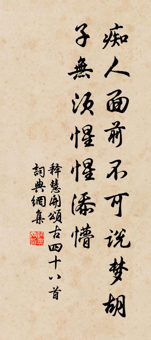 詩詞名句歷史字典書法欣賞書法字典國語詞典說文解字康熙字典古漢語字典標 題 作 者 詩 句 頌古四十八首作者:釋慧開 朝代:宋代頌古四十八首原文痴人面前,不可說夢。鬍子無須,惺惺添懵。詩詞問答問:頌古四十八首的作者是誰?答:釋慧開問:頌古四十八首寫於哪個朝代?答:宋代釋慧開頌古四十八首書法欣賞頌古四十八首書法作品詩詞推薦至日見菊花盛開有感羅公升〔宋代〕玄冥用事久,百卉不復余。今晨轉陽律,始見天地初。黃花獨何事,佳色炯自如。淵明骨已朽,餘子不稱渠。風霜寄孫魴秀才齊己〔唐代〕郡樓東面寺牆西,顏子生涯竹屋低。書案飛颺風落絮,地苔狼藉燕銜泥。吟窗晚憑春篁密,行徑斜穿夏菜齊。別後偈頌十二首釋如淨〔宋代〕打破黑漆桶,十方空豁豁。爆雷一喝變通,掣電千機頓發。便可以東行撐架門庭,西班怒罵佛祖。收放絕來由,縱朱買臣廟劉克莊〔宋代〕翁子平生最苦貧,晚將丹頸博朱輪。老儒五十無章綬,歸去何妨且負薪。護國寺秋吟八首白玉蟾〔宋代〕嫩竹容歸鵲,寒松捧落暉。危紅和露落,空翠撲衣飛。挽南澗先生三首趙蕃〔宋代〕曾呂兼晁鄭,吾州夙所尊。流風嗟日遠,耆舊賴公存。見必詢詩卷,聞仍置酒樽。從今入州府,寂寞向誰門。薊丘覽古贈盧居士藏用七首。鄒衍陳子昂〔唐代〕大運淪三代,天人罕有窺。鄒子何寥廓,漫說九瀛垂。興亡已千載,今也則無推。和程泰之閣學詠雪十二題錢雪袁說友〔宋代〕陽春有腳時難駐,見{左日右見}初消意已先。我亦鬢蓬飛雪滿,與君相遇約年年。葉桂發助教從李用之秘監於潮陽李持節使广部劉克莊〔宋代〕賀監空多惜別情,木綿花得似三荊。打包便是參禪客,垂橐何須使鬼兄。小郭今寧無趙子,四門古亦有歐生。南轅過無錫見李元德祭酒劉過〔宋代〕巒樹棲禽暖不飛,不如弓繳有危機。季鷹若悟蓴鱸好,應悔江東不蚤歸。至正改元辛巳寒食日示弟及諸子侄虞集〔元代〕江山信美非吾土,漂泊棲遲近百年。山舍墓田同水曲,不堪夢覺聽啼鵑。重陽不見菊二絕范成大〔宋代〕節物今年事事遲,小春全未到東籬。可憐短髮空欹帽,欠了黃花一兩枝。撫古晁說之〔宋代〕撫古論今百感生,興亡異世實同情。鬼神能告廣陵散,才智無如大廈傾。天御日躔歸故國,江潮淮浦謾新城。論都憶秦娥·梅謝了劉克莊〔宋代〕梅謝了,塞垣凍解鴻歸早。鴻歸早,憑伊問訊,大梁遺老。浙河西面邊聲悄,淮河北去炊煙少。炊煙少。宣和宮殿長城於濆〔唐代〕秦皇豈無德,蒙氏非不武。豈將版築功,萬里遮胡虜。團沙世所難,作壘明知苦。死者倍堪傷,殭屍猶抱杵。十年攝事十三首佚名〔宋代〕裸以溥將,實戶在位。帝德升聞,孝思光被。公卿庶正,傅御師氏。至誠感神,福祿一暨。洛陽感寓張祜〔唐代〕擾擾都城曉四開,不關名利也塵埃。千門甲第身遙入,萬里銘旌死後來。洛水暮煙橫莽蒼,邙山秋日露崔嵬。須知十二月中旬書戴溪亭王銍〔宋代〕天上東風轉斗星,天涯羇客尚飄萍。道塗況復經殘歲,風雪那堪宿旅亭。春到怯添雙鬢白,夜寒愁對一燈青。殘年逸再為婺女之行既別出郭矣夜不能寐成六絕句趙蕃〔宋代〕體能中格號時文,能料科場可策勛。此外更資為學在,木鬚根立乃凌雲。客居釋文珦〔宋代〕借得空房住十春,野麋山鹿日相新。寧嫌老景猶為客,卻喜閒身不屬人。於轉物時觀世界,向無心處得天真。深居名句推薦怒濤卷霜雪,天塹無涯。柳永《望海潮·東南形勝》 天下稍安,尤須兢慎,若便驕逸,必至喪敗。吳兢《貞觀政要·卷一·論政體》 日出東南隅,照我秦氏樓。佚名《陌上桑》 衙齋臥聽蕭蕭竹,疑是民間疾苦聲。鄭燮《濰縣署中畫竹呈年伯包大中丞括 / 墨竹圖題詩》 見楊柳飛綿滾滾,對桃花醉臉醺醺。王實甫《十二月過堯民歌·別情》 脊令各有思歸恨,日月相催雪滿顛。黃庭堅《次元明韻寄子由》 盡教春思亂如雲,莫管世情輕似絮晏幾道《玉樓春·雕鞍好為鶯花住》 女為君子儒,無為小人儒。孔子弟子《論語·雍也篇》 斜日更穿簾幕,微涼漸入梧桐。晏殊《破陣子·燕子欲歸時節》 錦里開芳宴,蘭缸艷早年。盧照鄰《十五夜觀燈》