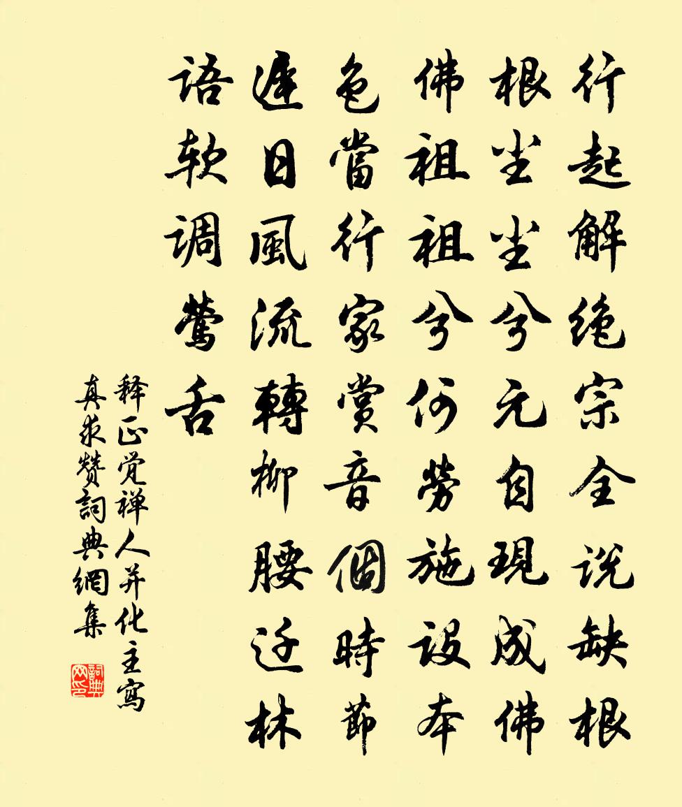 詩詞名句歷史字典書法欣賞書法字典國語詞典說文解字康熙字典古漢語字典標 題 作 者 詩 句 禪人並化主寫真求贊作者:釋正覺 朝代:宋代禪人並化主寫真求贊原文行起解絕,宗全說缺。根根塵塵兮元自現成,佛佛祖祖兮何勞施設。本色當行家,賞音個時節。遲日風流轉柳腰,遷林語軟調鶯舌。詩詞問答問:禪人並化主寫真求贊的作者是誰?答:釋正覺問:禪人並化主寫真求贊寫於哪個朝代?答:宋代釋正覺禪人並化主寫真求贊書法欣賞禪人並化主寫真求贊書法作品詩詞推薦游李少師園十題月桂范祖禹〔宋代〕天寒桂子墮,花發向庭中。月華十二滿,常照此芳叢。陳晞顏獲玉兔甚奇邀予賦詩曾協〔宋代〕一氣散萬有,飛潛異形姿。烏鵠自昔然,羽翼不可移。穎也衣褐徒,斕斑乃其宜。今茲獨何事,皓皓涅不淄。毳毛題方大夫家訓錢時〔宋代〕中興天子方御戎,長城萬里張魏公。此時此家盡好武,抵掌一呼來幕中。幕中群雄肝膽烈,指顧關河日彈鋏。若為從禮載酒要余及明叔游合普六首趙蕃〔宋代〕一軒高竹似高人,鳥雀馴除不動塵。首夏清和故應好,可須載酒只尋春。應庵密庵同日忌釋崇岳〔宋代〕冤有頭,債有主,撞破砂盆眼卓豎。不是佛,不是祖,太白峰前只如許。魏倅同杜仲高游黃龍洞次韻王炎〔宋代〕風流別駕臨苕溪,行廚攜客尋幽奇。五湖浩蕩三江永,綠淨不知凡幾頃。憑高縱望心目開,便可一傾三百杯。疑與秀峰寺王鳳池〔清代〕有約三雙屐,來游第一山。尋題知寺古,靜坐羨僧閒。鶴嶺天尤近,龍潭戶不關。鐫岩明滅處,字莫辨歐顏。午睡初起陸游〔宋代〕舍中未報壓新醅,閒弄流塵槲葉杯。得醉固佳醒亦好,了無一事到靈台。紹興祀岳鎮海瀆四十三首佚名〔宋代〕維南有山,於彼會稽。作鎮在昔,神則司之。厥有舊典,以祀以時。百味維旨,靈其燕娭。奉報趙王出師在道賜詩庾信〔南北朝〕上將出東平。先定下江兵。彎弓伏石動。振鼓沸沙鳴。橫海將軍號。長風駿馬名。雨歇殘虹斷。雲歸一鴈征。暗岩聞雨方岳〔宋代〕夜聞一霎兩霎雨,春著村南村北花。紫綿撲撲海棠蕾,翠毯茸茸沙蔣芽。游芳要非老者事,幽意自屬山人家。東風蒙才孺伯惠詩頗及參問葛立方〔宋代〕鶴氅 * 養粹和,冥心十地六波羅。宦情微似庵摩勒,佛行高於窣堵波。海裹泥牛端解笑,庵前石鏡不須磨。擬詢寧宗登門肆赦二首佚名〔宋代〕帝鄉於郊,荷天之休。五福敷錫,皇明燭幽。雲行雨施,仁翔德游。聖人多男,歌頌九州。李韶州著書常論釋氏之理貴州有能公遺蹟詩以問之權德輿〔唐代〕常日區中暇,時聞象外言。曹溪有宗旨,一為勘心源。挽文魁母齊魏國夫人三首鄧剡〔宋代〕客談剪髻德,鄰識斷機心。梭壁風雲早,諼春雨露深。安輿神物相,歸旐路足欽。滂母猶難比,生兒振古今。次韻陸務觀慈姥岩酌別范成大〔宋代〕明朝真是送人行,從此關山隔故情。道義不磨雙鯉在,蜀江流水貫吳城。楊仲承秘書蹉跎三年今得榮州文學冬日貽書以王洋〔宋代〕昔年曾嘆小差池,官帶榮名自有時。二火併光君有漸,一茅覆屋兩相宜。心田自樂緣知足,世路無求亦少思。好是次韻答秦少章乞酒黃庭堅〔宋代〕朝事鞍馬早,吏曹文墨拘。初無尺寸補,但於朋友疏。豈如簞瓢子,臥起一床書。炙背道堯舜,雪屋相與娛。步出雙路施樞〔宋代〕王命驅馳不敢輕,文書要覈去來情。青山步步生幽意,碧澗悠悠趁遠程。春淺禽聲猶自小,泥酥馬跡正宜晴。地名謝紹興石梅癯遺本堂二篆書陳著〔宋代〕飛下雲閒玉箸書,忽如夢覺揖梅癯。古來髓脈今誰識,稱得山中老餓夫。名句推薦淡雲孤雁遠,寒日暮天紅。徐昌圖《臨江仙·飲散離亭西去》 如來不應以具足諸相見。鳩摩羅什譯《金剛經·離色離相》 為者敗之,執者失之。老子《老子·道經·第二十九章》 舌為利害本,口是禍福門。馮夢龍《醒世恆言·卷二十九》 奈何今之人,雙目送飛鴻。李白《鞠歌行》 上有青冥之長天,下有淥水之波瀾李白《長相思·其一》 手如柔荑,膚如凝脂佚名《碩人》 戒惕弗棄,智勇弗顯。來俊臣《羅織經·事上卷第二》 秋晚蓴鱸江上,夜深兒女燈前。辛棄疾《木蘭花慢·滁州送范倅》 水上遊人沙上女,回顧,笑指芭蕉林里住。歐陽炯《南鄉子·畫舸停橈》