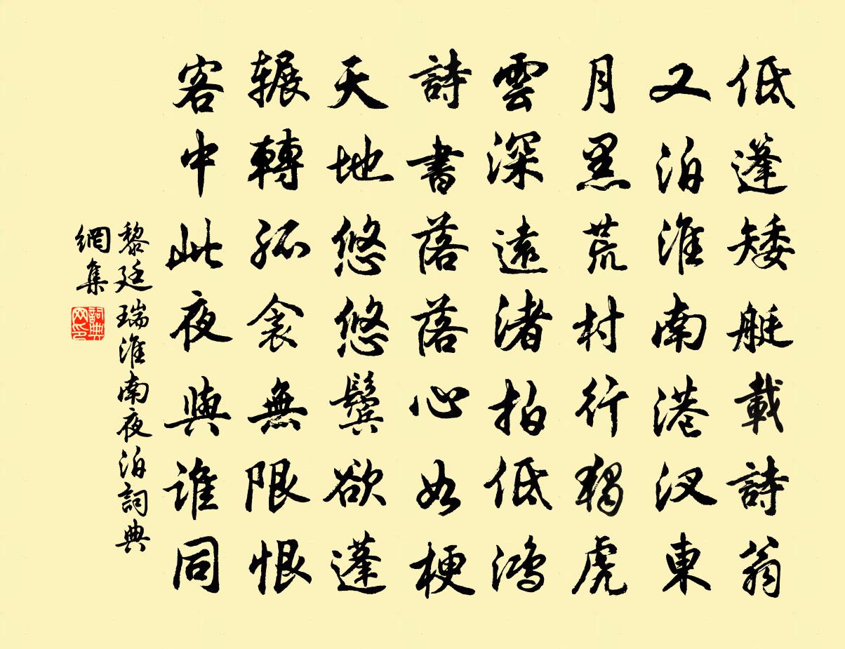詩詞名句歷史字典書法欣賞書法字典國語詞典說文解字康熙字典古漢語字典標 題 作 者 詩 句 淮南夜泊作者:黎廷瑞 朝代:宋代淮南夜泊原文低篷矮艇載詩翁,又泊淮南港汊東。月黑荒村行獨虎,雲深遠渚拍低鴻。詩書落落心如梗,天地悠悠鬢欲蓬。輾轉孤衾無限恨,客中此夜與誰同。詩詞問答問:淮南夜泊的作者是誰?答:黎廷瑞問:淮南夜泊寫於哪個朝代?答:宋代黎廷瑞淮南夜泊書法欣賞淮南夜泊書法作品詩詞推薦送程公辟使江西曾鞏〔宋代〕程侯昔使西山下,金印出懷光滿把。坐馳雷電破奸伏,力送春陽煦鰥寡。袴襦優足遍里巷,禾黍豐穰罄郊野。訟庭曹主簿涇自卜壽藏追范石湖韻謹依虛谷使君例汪炎昶〔宋代〕何遽卜萱兼樹楸,壽如黃綺閱火劍。九州骨豈皆黃坯,百歲人誰盡白頭。貴賤一時膏野草,賢愚後代指荒丘。因公龍溪新亭曾惇〔宋代〕懷玉知名寺,諸峰翠插天。凌雲飛略彴,照水舞蜿蜒。午日孤穿履,新涼定著鞭。更須煩惠遠,小立虎溪邊。送陳敬甫姜夔〔宋代〕十年所聞溢吾耳,去年誦君書一紙。古人三語得奇士,況此磊落數百字。相逢千財萬壑里,有客如君請兄事。才高次韻子夷兄弟十首之四張耒〔宋代〕出門復入門,愧此櫪上馬。壯心磨不盡,撫劍還悲詫。感時高歌放,泣古幽淚灑。端憂蹇無成,駕言我心寫。同毛敏仲出湖上由萬松嶺過浙江亭汪元量〔宋代〕錢塘門外看新晴,舞蜨游蜂沒一星。風挾斷雲橫北巘,煙隨飛雨度南屏,蘇隄柳樹照波綠,吳苑麥苗連地青。邂逅避方寇五絕鄭剛中〔宋代〕皇家休運正無疆,撼樹蚍蜉不自量。未作天街一杯血,暫憑山谷恣跳梁。頌證道歌證道歌釋印肅〔宋代〕不思議,解脫力,不是思量心外得。一句當天八萬門,野橋金柳依依色。客鄭遇曇穎自洛中東歸梅堯臣〔宋代〕禪衣本壞色,不化洛陽塵。獨有煙霞染,況將山水親。西風入關戍,宿雨過城闉。誰羨飄然跡,吾車亦已巾。聽琴羅隱〔唐代〕寒雨蕭蕭落井梧,夜深何處怨啼烏。不知一盞臨邛酒,救得相如渴病無。臨江仙·憶昔西池池上飲晁沖之〔宋代〕憶昔西池池上飲,年年多少歡娛。別來不寄一行書,尋常相見了,猶道不如初。安穩錦衾今夜夢,月明好渡江湖。千蹊王安石〔宋代〕千蹊百隧散林丘,圖畫風煙一色秋。但有興來隨處好,楊朱何苦涕橫流。放歌行孟雲卿〔唐代〕吾觀天地圖,世界亦可小。落落大海中,飄浮數洲島。賢愚與蟻虱,一種同草草。地脈日夜流,天衣有時掃。東山春曉聞禽蒲壽宬〔宋代〕喚回春夢幾聲禽,澗草岩花動此心。搔首偶然自失笑,不知何處是山林。龍井道中雜紀周弼〔宋代〕老僧病久聲嘶喝,屢說紫衣勝短褐。莫嫌兩手漸拘攣,曾把御前供奉鈸。姚堅老見約偶成王令〔宋代〕初布正布新和布,余臘爭布近候。升騰布陽力微,恇怯老陰斗。江雲盪空碧,疏雨沐清晝。林梢釋冬枯,土櫱壯春惠州豐湖亦名西湖楊萬里〔宋代〕左瞰豐湖右瞰江,五峰出沒水中央。峰頭寺寺樓樓月,清殺東坡錦繡腸。三處西湖一色秋,錢塘穎水更羅浮。東坡浮雲樓鄭獬〔宋代〕樓在浮雲縹緲間,浮雲 * 見朱欄。山光對入鄖城紫,溪影橫飛夢澤寒。清平樂晏幾道〔宋代〕笙歌宛轉。台上吳王宴。宮女如花倚春殿。舞綻縷金衣線。酒闌畫燭低迷。彩鴛驚起雙棲。月底三千繡戶,雲間十同友生題僧院杜鵑花(得春字)李鹹用〔唐代〕若比眾芳應有在,難同上品是中春。牡丹為性疏南國,朱槿操心不滿旬。留得卻緣真達者,見來寧作獨醒人。鶴林名句推薦群燕辭歸鵠南翔,念君客游多斷腸。曹丕《燕歌行》 便做無情,莫也愁人苦朱淑真《蝶戀花·送春》 皎皎窗中月,照我室南端。潘安《悼亡詩三首》 杏樹壇邊漁父,桃花源里人家。王維《田園樂七首·其三》 撩亂舞晴空,發人無限思。劉禹錫《柳花詞三首》 父之讎,弗與共戴天。兄弟之讎不反兵。交遊之讎不同國。戴聖《禮記·曲禮上》 新知遭薄俗,舊好隔良緣。李商隱《風雨》 君子莫大乎與人為善。孟子《孟子·公孫丑章句上·第八節》 重九開秋節,得一動宸儀。韋安石《奉和九日幸臨渭亭登高應制得枝字》 淮南皓月冷千山,冥冥歸去無人管。姜夔《踏莎行·自沔東來》