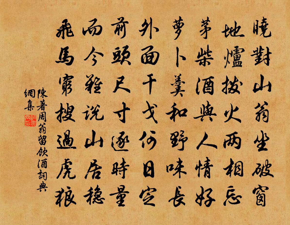 詩詞名句歷史字典書法欣賞書法字典國語詞典說文解字康熙字典古漢語字典標 題 作 者 詩 句 周翁留飲酒作者:陳著 朝代:宋代周翁留飲酒原文曉對山翁坐破窗,地爐撥火兩相忘。茅柴酒與人情好,蘿蔔羹和野味長。外面干戈何日定,前頭尺寸逐時量。而今難說山居穩,飛馬窮搜過虎狼。詩詞問答問:周翁留飲酒的作者是誰?答:陳著問:周翁留飲酒寫於哪個朝代?答:宋代陳著周翁留飲酒書法欣賞周翁留飲酒書法作品詩詞推薦奉酬鄧忠臣〔宋代〕秋闈深鎖覺愁多,賴有英游玉趾過。日望高樓吟楚月,夢隨明月到湘羅。南宮曾看揮華藻,西館還來共笑歌。六稔正月六日雪霽曾鞏〔宋代〕雪消山水見精神,滿眼東風送早春。明日杏園應爛熳,但須期約看花人。次韻紅白蓮間生周必大〔宋代〕閒花不遣倚門牆,獨挹芙蕖冉冉香。艷質施朱窺宋玉,冰姿傅粉試何郎。青莖翠蓋元相映,縞袂霞裾各自芳。聞道歲寒雜詠錢時〔宋代〕一把寒茅四柱亭,客來只道省經營。雖然受用無花巧,五十餘年造得成。題靈泉觀閣強至〔宋代〕山腰碧瓦郁參差,勢壓開元觀閣基。野氣欲來雲拂地,天光不動水平池。飛檐鳥道愁相逼,故國人煙入俯窺。便擬澹岩游五首洪彥華〔宋代〕聞說澹岩天下稀,乘閒得得叩岩扉。中虛上透真奇觀,□□□□□悟機。林少朋輓詞三首林亦之〔宋代〕幾回欲去醉花傍,此事如今轉渺茫。不獨喔詩吊金谷,更令掩袂憶劉郎。西江月葛勝仲〔宋代〕羈宦新來作惡,窮途誰肯相從。追攀十日水雲中。情誼知君獨重。寂寂迴廊小院,冥冥細雨尖風。鳳山香雪定應空山僧蘭若顧況〔唐代〕絕頂茅庵老此生,寒雲孤木伴經行。世人那得知幽徑,遙向青峰禮磬聲。苦熱黃公度〔宋代〕玉井晨不冷,茅檐午欲焚。月搖看畫箑,榴吐認紅裙。迥野都如火,奇峰空自雲。衣巾負芒刺,曝背有人耘。和陳叔易就晁以道求長松張表臣〔宋代〕暫隱嵩高六六峰,未乘雲氣御飛龍。自餐白石求黃石,更采長松寄赤松。十九弟生日項安世〔宋代〕西堂舊作春池夢,南國今逢小滿天。重四巧排黃閣印,百分宜泛紫金船。夜聞素月初生涯,曉看丹枝已屬賢。萬種題朱陵觀三首張明中〔宋代〕欹窗颺飋漏風聲,壞壁斜斜半草行。莫怨空齋對塵榻,碧油幢下是書生。次韻楊廷秀左司見贈張鎡〔宋代〕願得誠齋句,銘心祗舊嘗。一朝三昧手,五字百船香。弦絕今何苦,衣傳擬自強。草玄非近效,舉世漫匆忙。上閩帥范石湖五首敖陶孫〔宋代〕蚤知吳下多奇士,身許先生嫡子行。他日略容追李杜,斯文何敢望班揚。向來流水孤三奏,此去飛霞乞一翔。牛鐸空煙亭倪思〔宋代〕延福寺前亭下水,淺不容舠深沒底。青林磅薄上雲氣,宛如翔鸞開羽翅,又如翠屏臨水峙。山雞照影空自媚,白鷺樂府鳥衣怨元好問〔金代〕繡佛長齋,半生枉伴 * 過。酒壚橫臥。一蹴虛空破。頗笑張顛,自謂無人和。還知么。醉鄉天大。少個神仙我。關中送別薛能〔唐代〕一行千里外,幾事寸心間。才子貧堪嘆,男兒別是閒。黃河淹華岳,白日照潼關。若值鄉人問,終軍賤不還。池州溪橋李昴英〔宋代〕萬里長江汰一杯,等檔袖劍九華來。溪橋獨坐無人識,又駕長風跨鶴回。梅花張問陶〔清代〕銅瓶紙帳老因緣,亂我鄉愁又幾年。莫笑神情如靜女,須知風骨是飛仙。生來逸氣應無敵,悟到真空信可憐。世外名句推薦木謂之華,草謂之榮。佚名《爾雅·釋草》 志士仁人無求生以害仁,有殺身以成仁。孔子弟子《論語·衛靈公篇》 人生如夢,一尊還酹江月蘇軾《念奴嬌·赤壁懷古》 明月照積雪,朔風勁且哀。謝靈運《歲暮》 初聞征雁已無蟬,百尺樓高水接天。李商隱《霜月》 白髮戴花君莫笑,六么催拍盞頻傳。歐陽修《浣溪沙·堤上遊人逐畫船》 天下無事,不可廢武佚名《百戰奇略·第十卷·忘戰》 香臉半開嬌旖旎。當庭際。玉人浴出新妝洗。李清照《漁家傲·雪裡已知春信至》 惟仁者宜在高位。孟子《孟子·離婁章句上·第一節》 酒賤常愁客少,月明多被雲妨。蘇軾《西江月·世事一場大夢》