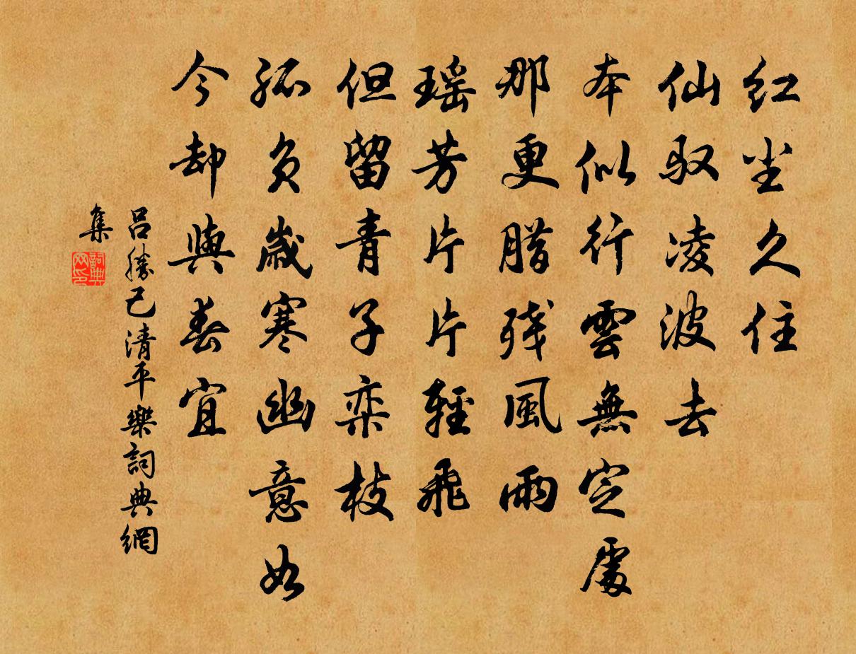 詩詞名句歷史字典書法欣賞書法字典國語詞典說文解字康熙字典古漢語字典標 題 作 者 詩 句 清平樂作者:呂勝己 朝代:宋代清平樂原文紅塵久住。仙馭凌波去。本似行雲無定處。那更臘殘風雨。瑤芳片片輕飛。但留青子欒枝。孤負歲寒幽意,如今卻與春宜。詩詞問答問:清平樂的作者是誰?答:呂勝己問:清平樂寫於哪個朝代?答:宋代問:清平樂是什麼體裁?答:詞呂勝己清平樂書法欣賞清平樂書法作品詩詞推薦湖上新晴宋伯仁〔宋代〕湖邊膏雨弄晴時,桃杏紅爭錦一機。楊柳也如新及第,向人爭舞綠羅衣。水調歌頭(和彭明叔七夕)劉辰翁〔宋代〕不見古時月,何似漢時秋。朱陳村里新樣,新婦又騎牛。欲脫參前氐後,又說河邊河鼓,此會沒來由。何處設瓜果題王使君片石顧非熊〔唐代〕勢似孤峰一片成,坐來疑有白雲生。主人莫怪殷勤看,遠客長懷舊隱情。感嘆晁說之〔宋代〕訊息沈沈當下國,風塵漠漠望中都。平生鉛槧胡塵里,不免從今讀誤書。賞竹吟金朋說〔宋代〕放鶴空庭竹似賓,輕風晴日綠篩金。幽人寧使食無肉,不可軒墀少此君。贈律師院朱慶餘〔唐代〕粉壁通蓮徑,扁舟到不迷。葦聲過枕上,湖色滿窗西。但見修行苦,誰論夏臘低。閒看種來樹,已覺與身齊。鯀廟李復〔宋代〕治水弗績鯀當殛,逃入羽淵為黃能。韓山東北有荒廟,豕象冕服吁怪哉。鄉社養牲禁畜豕,恐觸神怒風雷災。秦漢送傅守歸劉宰〔宋代〕世念分五兵,當使道戰勝。昔別稽山險,風采臞而整。重逢驚少莊,神光爍衰病。一氣中夜存,還丹強葛令。書汜水關寺壁王安石〔宋代〕汜水鴻溝楚漢間,跳兵走馬百重山。如何咫尺商於地,便有園公綺季閒。冬至程大昌〔宋代〕世間剝復每相乘,此理几几喚得譍。萬木凍僵梅有信,黃河冰合井如蒸。同裴觀察東湖望山歌顧況〔唐代〕浴鮮積翠棲靈異,石洞花宮橫半空。夜光潭上明星啟,風雨壇邊樹如洗。水淹徐孺宅恆乾,繩墜洪崖井無底。主人偶書王冕〔元代〕今晨花好風雨,花濕雲四邊花馳。落花爛作土,潦水積成池。疲民在塗炭,朝暮苦啼飢。況兼時氣乖,好花生瘡痍春日途中五首項安世〔宋代〕未說離家日日晴,離家三日雨如傾。津頭小吏詢名氏,但道當年段墨卿。贈南回了豐上人三首張嵲〔宋代〕雙頰朱丹雪染眉,終朝一飯便無為。庭前柏是初年種,今見森森合抱時。齊潘妃孫元晏〔唐代〕曾步金蓮寵絕倫,豈甘今日委埃塵。玉兒還有懷恩處,不肯將身嫁小臣。鳳時春(見殘梅)王質〔宋代〕標格風流前輩。才瞥見春風,蕭然無對。只有月娥心不退。依舊斷橋,橫在流水。我亦共、月娥同意。肯將情移在同陣道原謁象之韓維〔宋代〕歊炎日為倦,休架一瀟灑。風竹來迎人,翠 * 傾寫。神交不前約,至理非外假。窅然天地間,誰是忘言者。招客賞菊姜特立〔宋代〕今年月有閏,菊花開較遲。明年無贏縮,花開當及時。有花與無花,摘蕊泛酒卮。況是好時節,風日生光輝。但願賓之初筵佚名〔先秦〕賓之初筵,左右秩秩。籩豆有楚,殽核維旅。酒既和旨,飲酒孔偕。鐘鼓既設,舉酬逸逸。大侯既抗,弓矢斯張。水龍吟(青絲木香)黃霽宇〔宋代〕麗華一握青絲,金珠粟粟香環里,春窺綺閣,新妝風舞,銖衣如碎。翠鳳蒼虬,騎來下界,蝶驚蜂避。甚三生富貴名句推薦當場不論,過後枉然。佚名《增廣賢文·下集》 用貧求富,農不如工,工不如商。司馬遷《史記·貨殖列傳》 風鳴兩岸葉,月照一孤舟。孟浩然《宿桐廬江寄廣陵舊遊》 水流濕,火就燥。雲從龍,風從虎。佚名《易傳·文言傳·乾文言》 重陽佳節意休休,與客攜壺共上樓。姜塘《摘星樓九日登臨》 凡事當留餘地,得意不宜再往。朱柏廬《朱子家訓·全文》 崑山玉碎鳳凰叫,芙蓉泣露香蘭笑。李賀《李憑箜篌引》 木落雁南度,北風江上寒。孟浩然《早寒江上有懷 / 早寒有懷 / 江上思歸》 瘦葉幾經雪,淡花應少春。於武陵《贈賣松人》 南山與秋色,氣勢兩相高。杜牧《長安秋望》